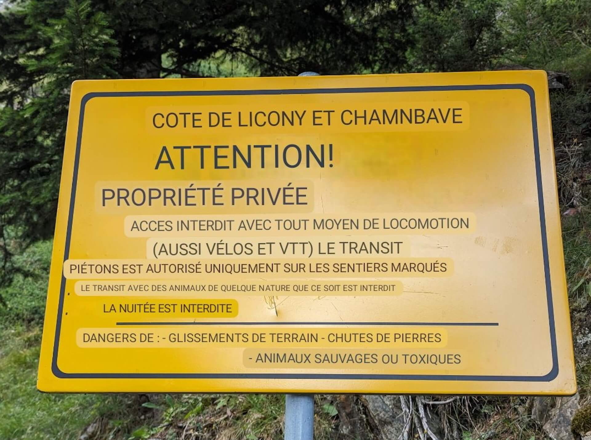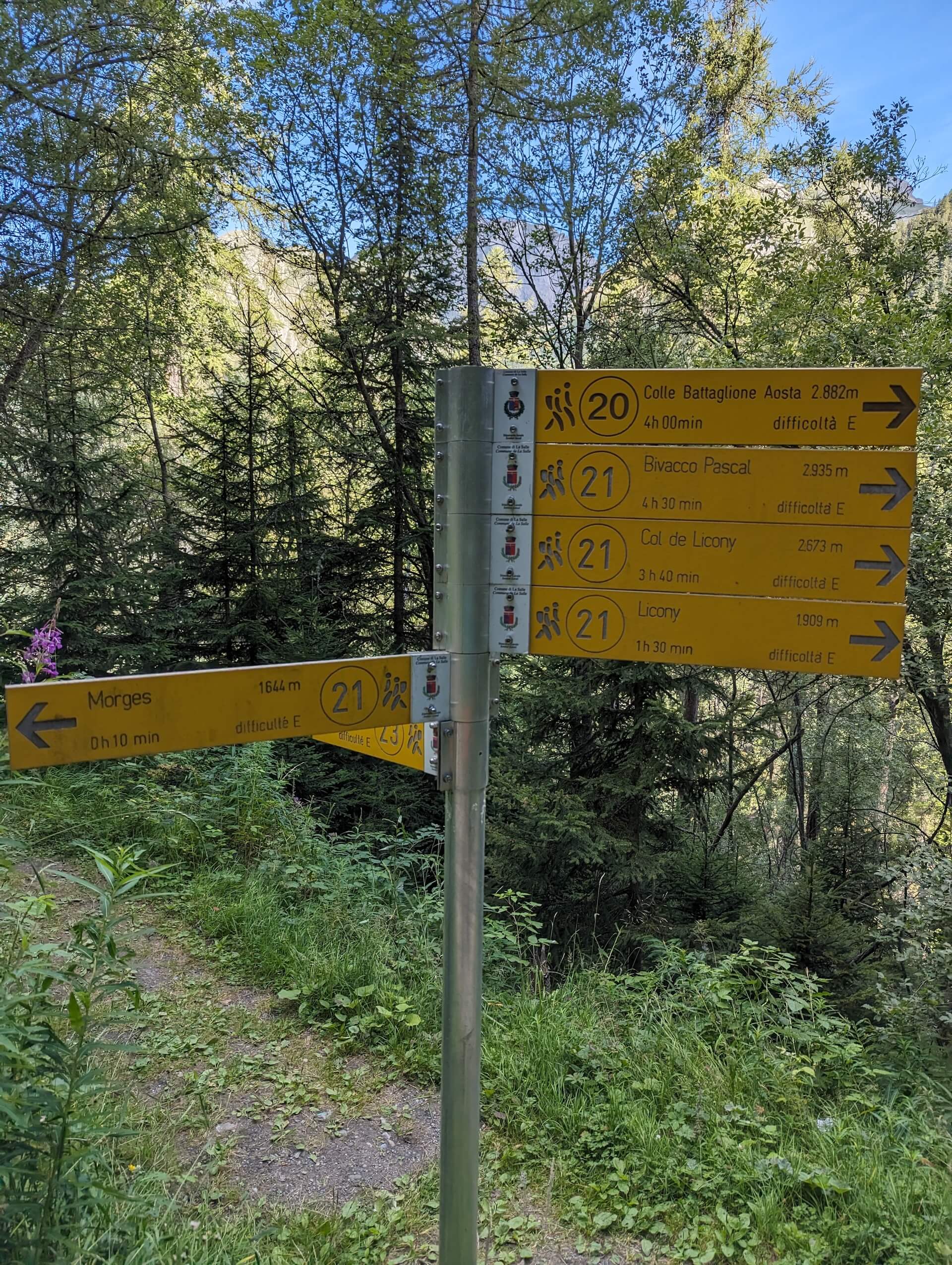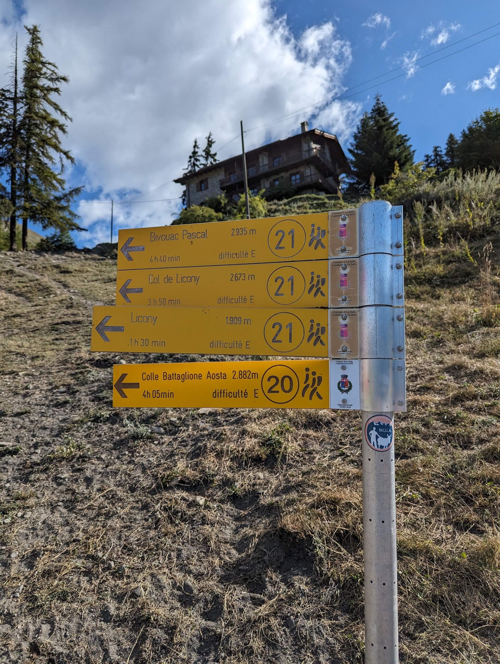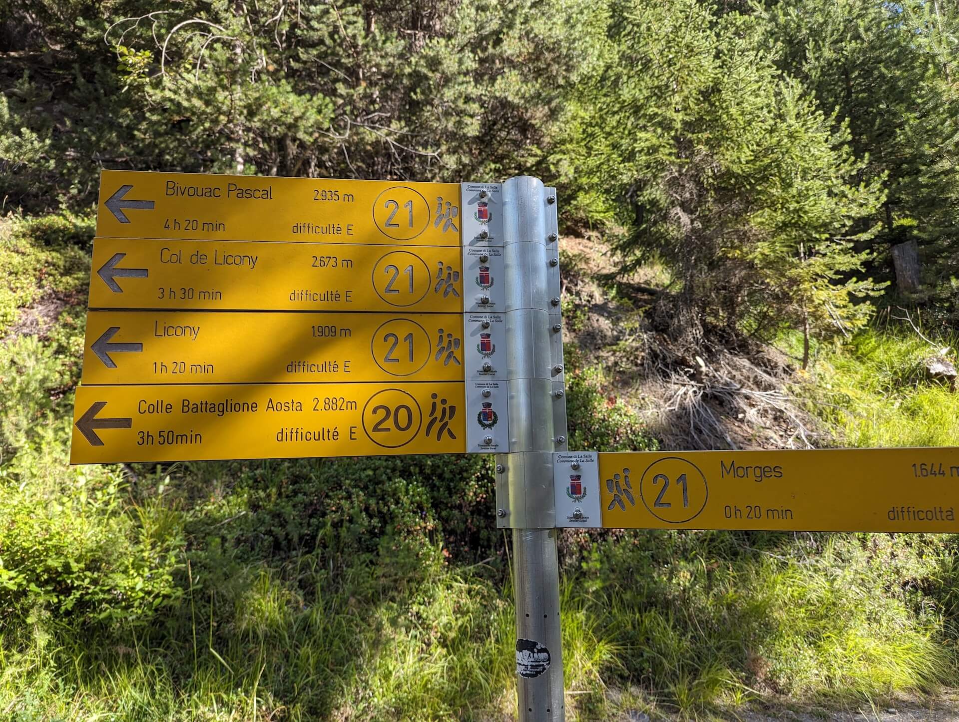 Du parking, suivre les panneaux en direction du « Col de Licony — 3 h 50 ». Après un court replat dans la forêt, le sentier descend fortement sur environ 200 mètres jusqu’à un pont qu’il s’agit d’emprunter. Plus loin, l’on débouche sur un chalet qu’il faut contourner et continuer jusqu’à un panneau. Suivre dès lors la direction du « Col de Licony — 3 h 30 ». Le large chemin poursuit dans le bois puis se rétrécit pour atteindre une petite cascade qu’il faut traverser. Continuer le sentier le long du vallon duquel l’on aperçoit la suite du parcours de l’autre côté. Une fois arrivé à une fourche, prendre le sentier du bas indiqué « Licony – 0 h 35 ». On franchit par la suite le torrent de Chambave. De grosses pierres et une main courante solidement fixée aident au franchissement sans risque du torrent.