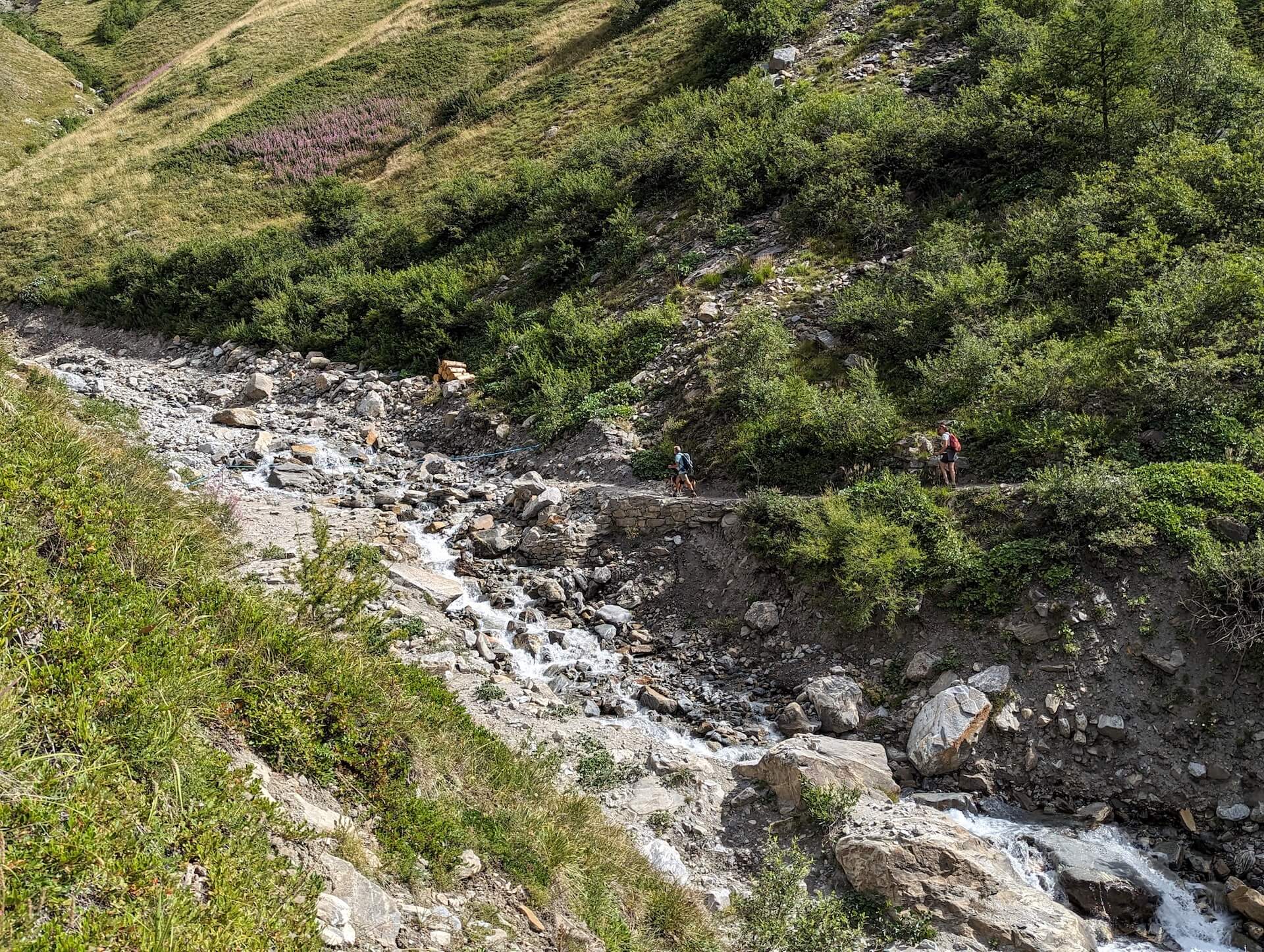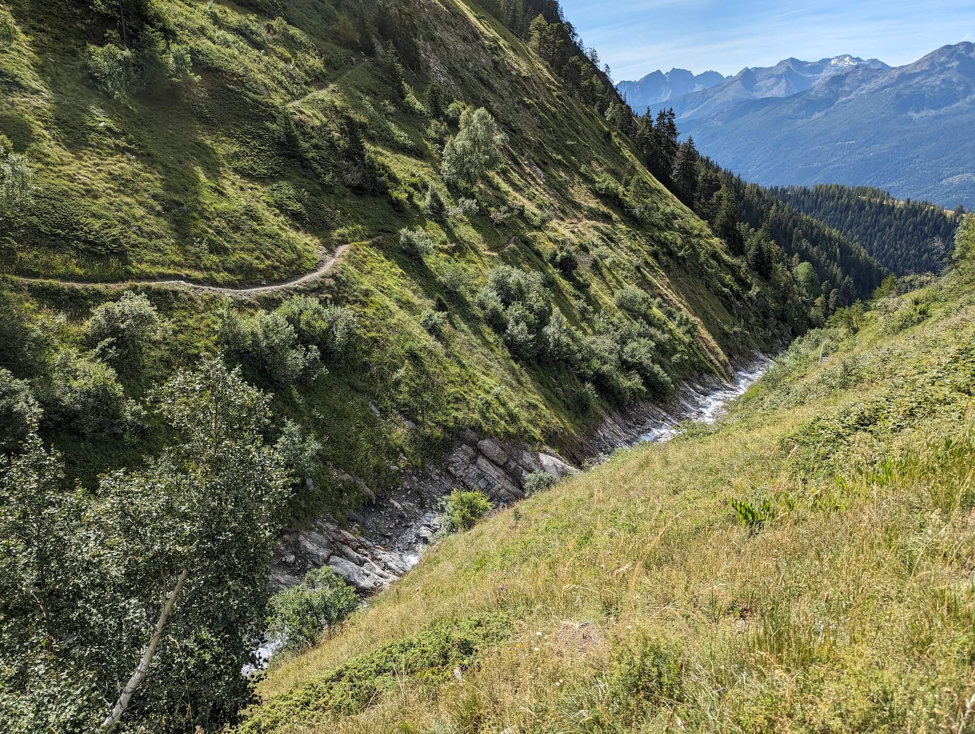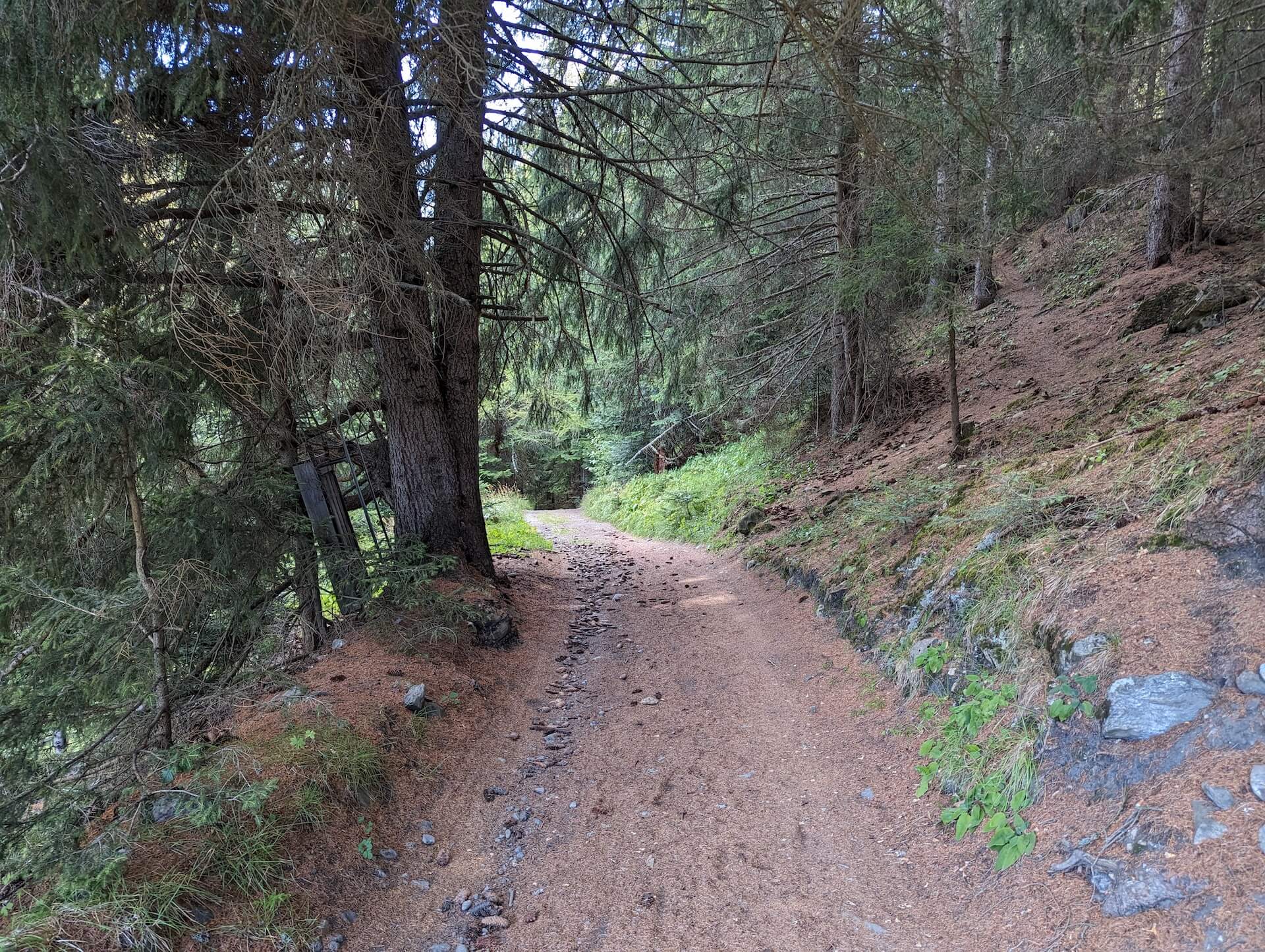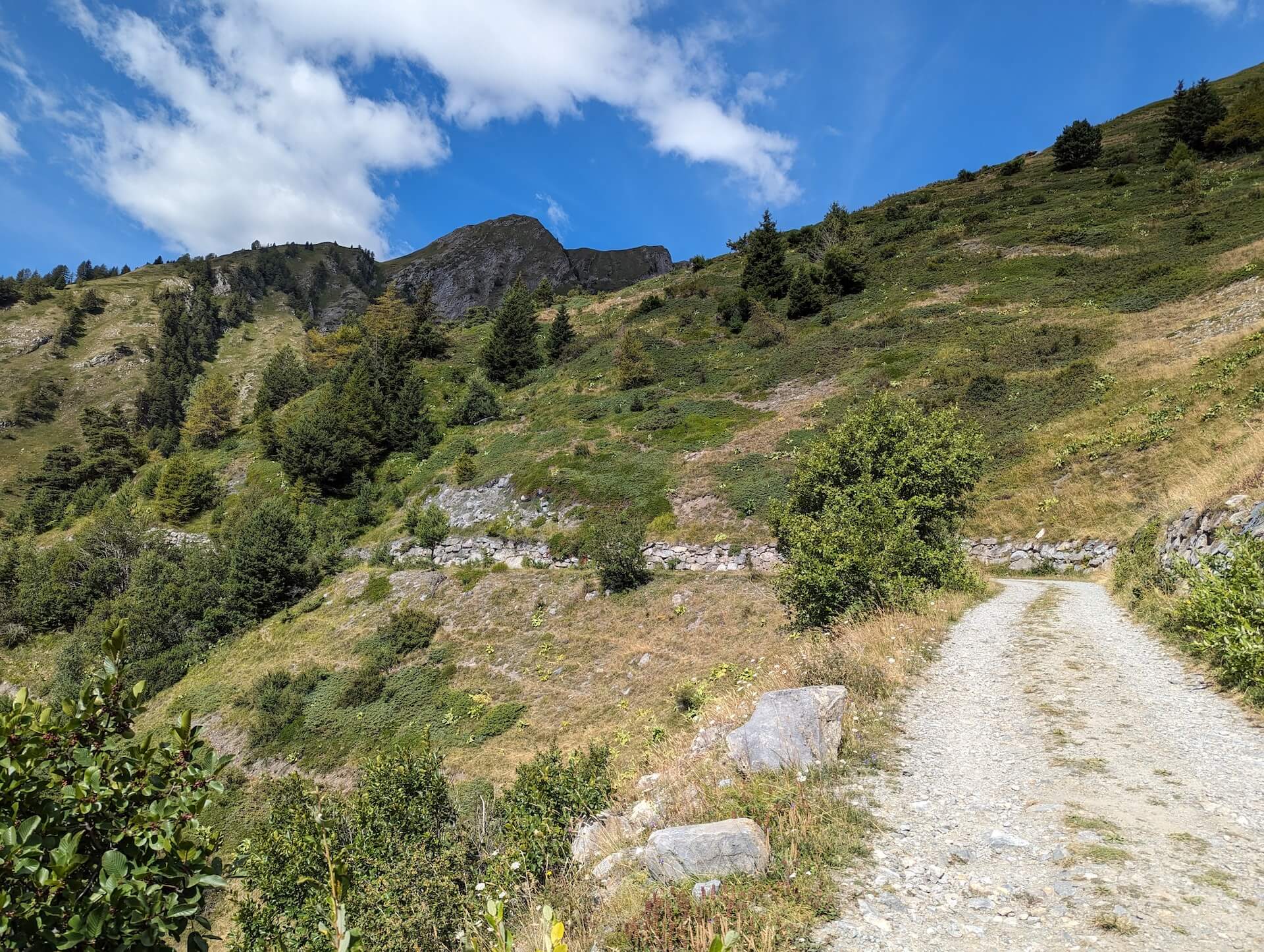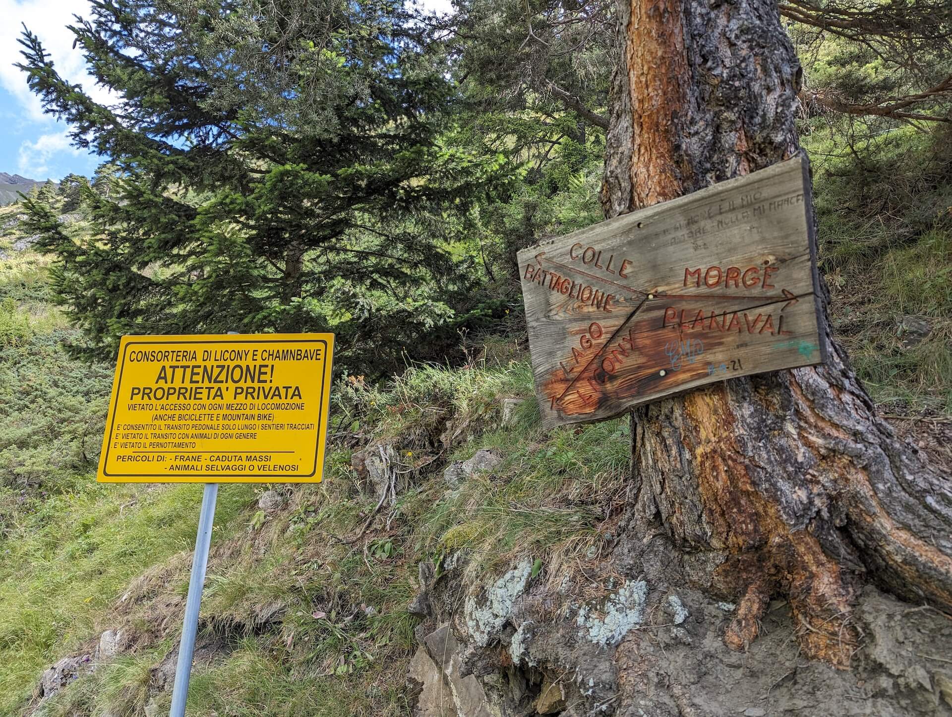 Du parking, suivre les panneaux en direction du « Col de Licony — 3 h 50 ». Après un court replat dans la forêt, le sentier descend fortement sur environ 200 mètres jusqu’à un pont qu’il s’agit d’emprunter. Plus loin, l’on débouche sur un chalet qu’il faut contourner et continuer jusqu’à un panneau. Suivre dès lors la direction du « Col de Licony — 3 h 30 ». Le large chemin poursuit dans le bois puis se rétrécit pour atteindre une petite cascade qu’il faut traverser. Continuer le sentier le long du vallon duquel l’on aperçoit la suite du parcours de l’autre côté. Une fois arrivé à une fourche, prendre le sentier du bas indiqué « Licony – 0 h 35 ». On franchit par la suite le torrent de Chambave. De grosses pierres et une main courante solidement fixée aident au franchissement sans risque du torrent.