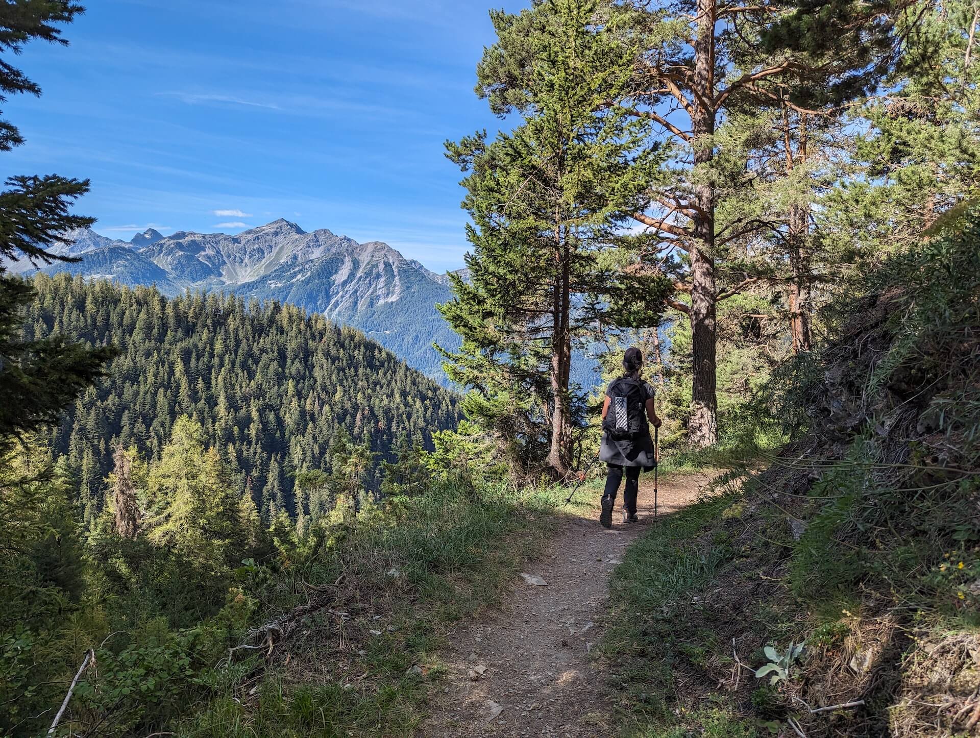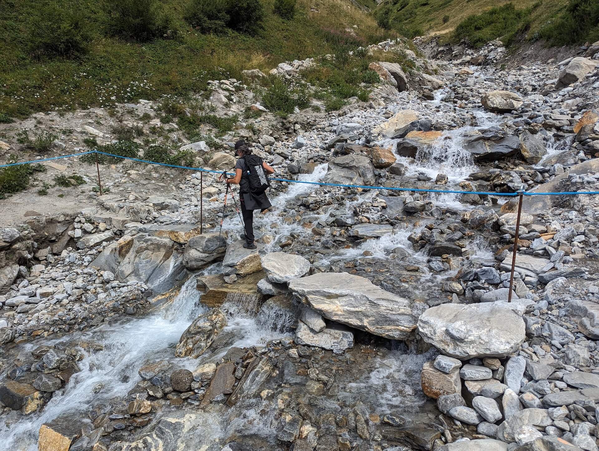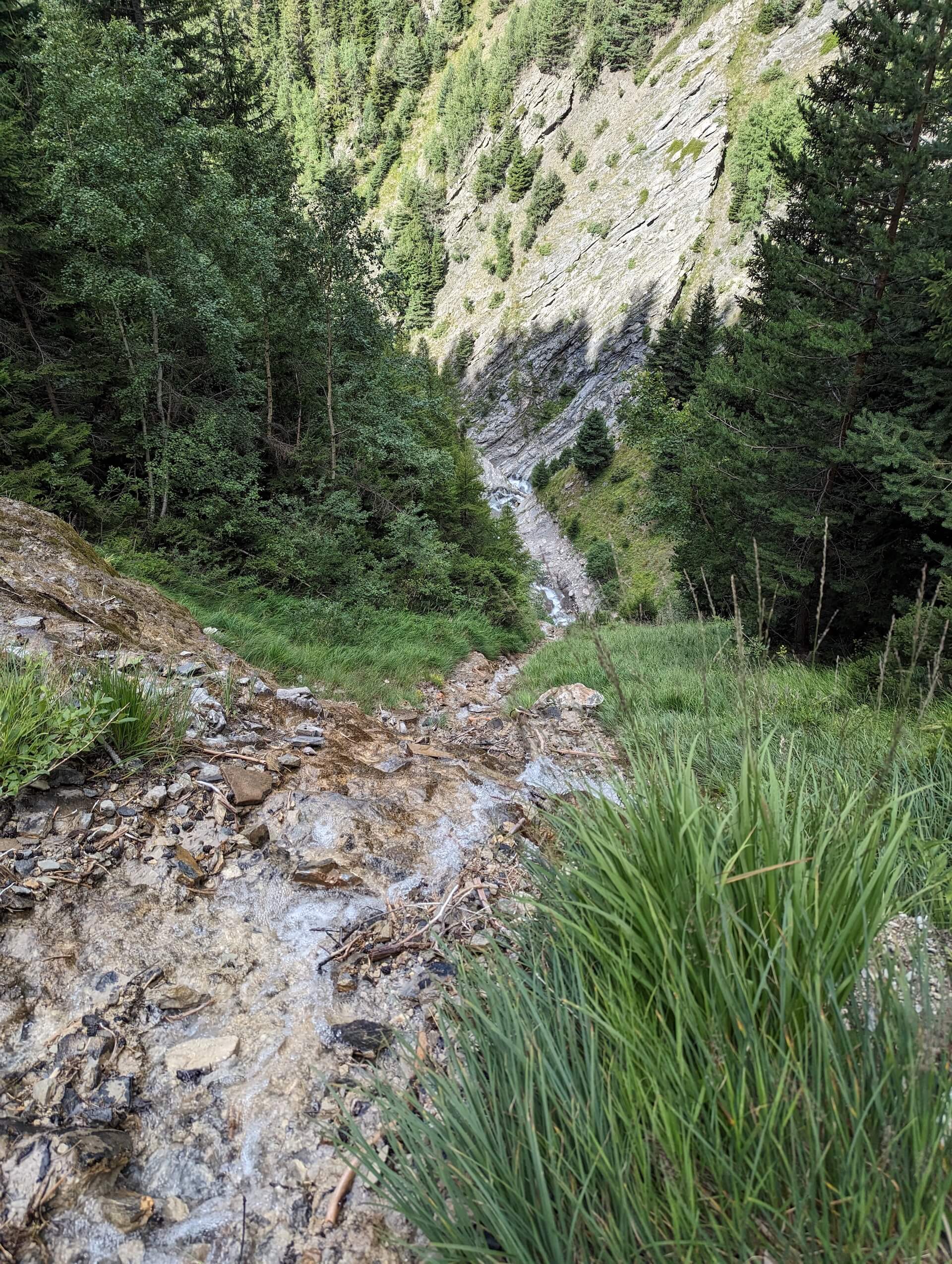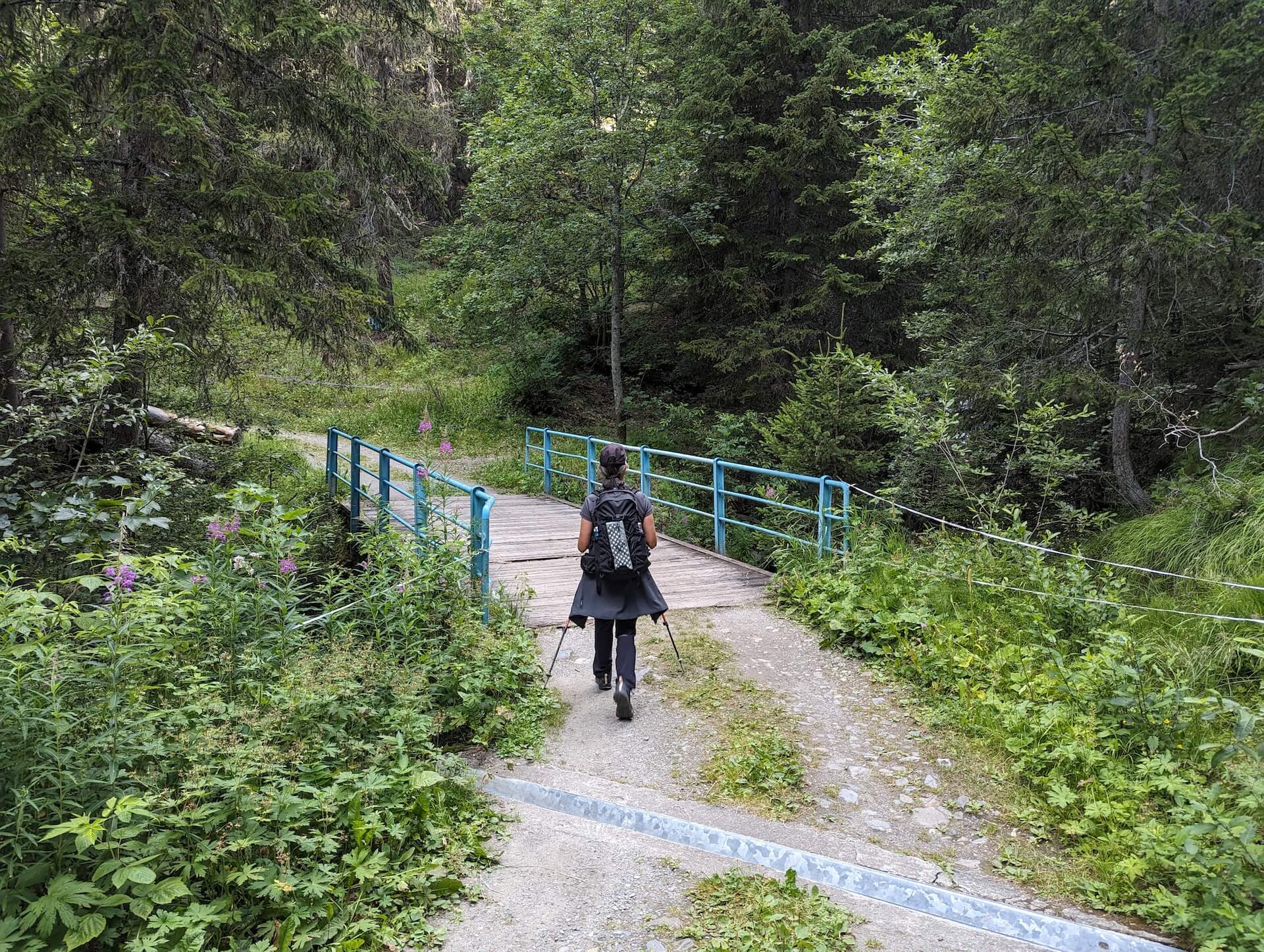 Du parking, suivre les panneaux en direction du « Col de Licony — 3 h 50 ». Après un court replat dans la forêt, le sentier descend fortement sur environ 200 mètres jusqu’à un pont qu’il s’agit d’emprunter. Plus loin, l’on débouche sur un chalet qu’il faut contourner et continuer jusqu’à un panneau. Suivre dès lors la direction du « Col de Licony — 3 h 30 ». Le large chemin poursuit dans le bois puis se rétrécit pour atteindre une petite cascade qu’il faut traverser. Continuer le sentier le long du vallon duquel l’on aperçoit la suite du parcours de l’autre côté. Une fois arrivé à une fourche, prendre le sentier du bas indiqué « Licony – 0 h 35 ». On franchit par la suite le torrent de Chambave. De grosses pierres et une main courante solidement fixée aident au franchissement sans risque du torrent.