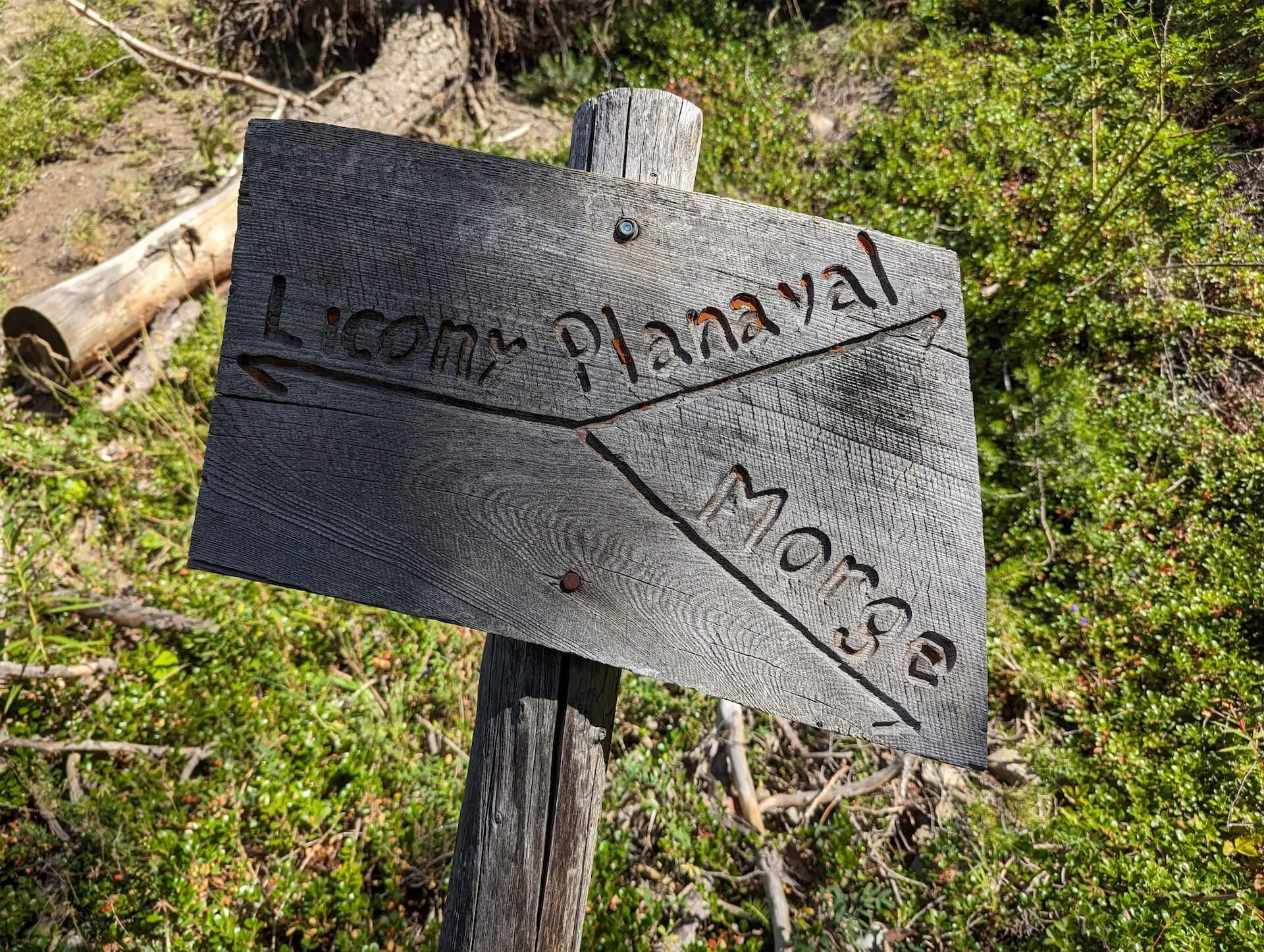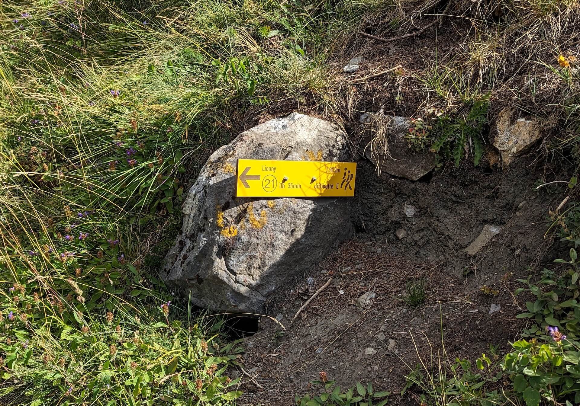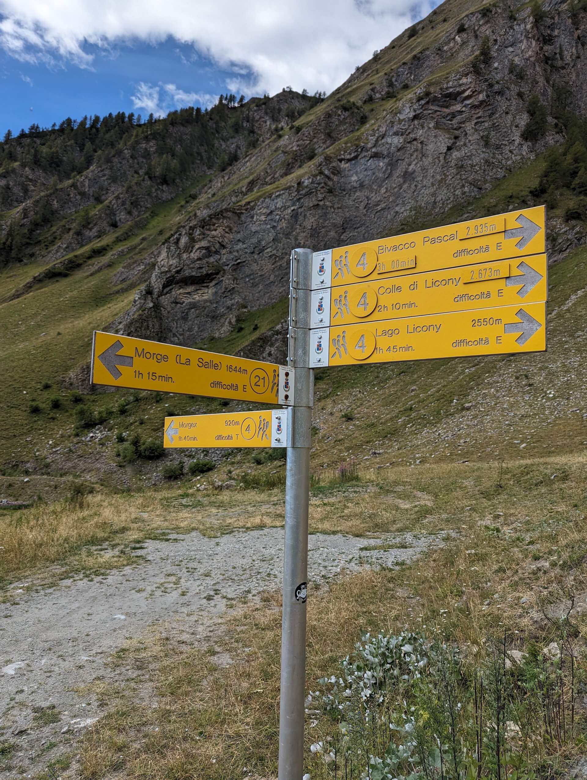 Continuer sur le sentier qui s’ouvre maintenant sur un vaste alpage. L’itinéraire rejoint un peu plus loin une piste carrossable réservée aux riverains. Suivre alors la direction « Col de Licony — 2 h 25 » comme mentionné sur le panneau pour gagner ensuite le hameau de Licony. C’est à partir d’ici que le gros du dénivelé positif s’effectue. Arrivé à un panneau, poursuivre en direction du « Lago Licony – 1 h 45 » et « Colle di Licony — 2 h 10 » par la large piste qu’il vaut mieux quitter au bout de quelques mètres pour suivre les flèches jaunes peintes sur les rochers. Un sentier étroit et escarpé devenant de plus en plus raide rallie une cascade qu’on laisse à droite. On aperçoit dès lors un petit col bien en vue, le lac étant situé juste derrière.