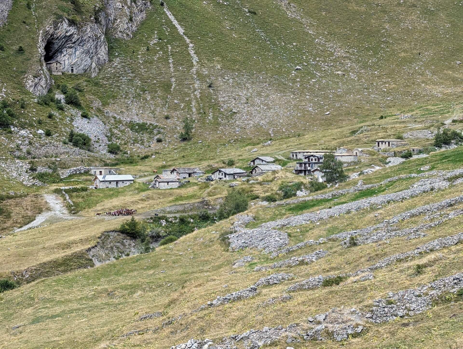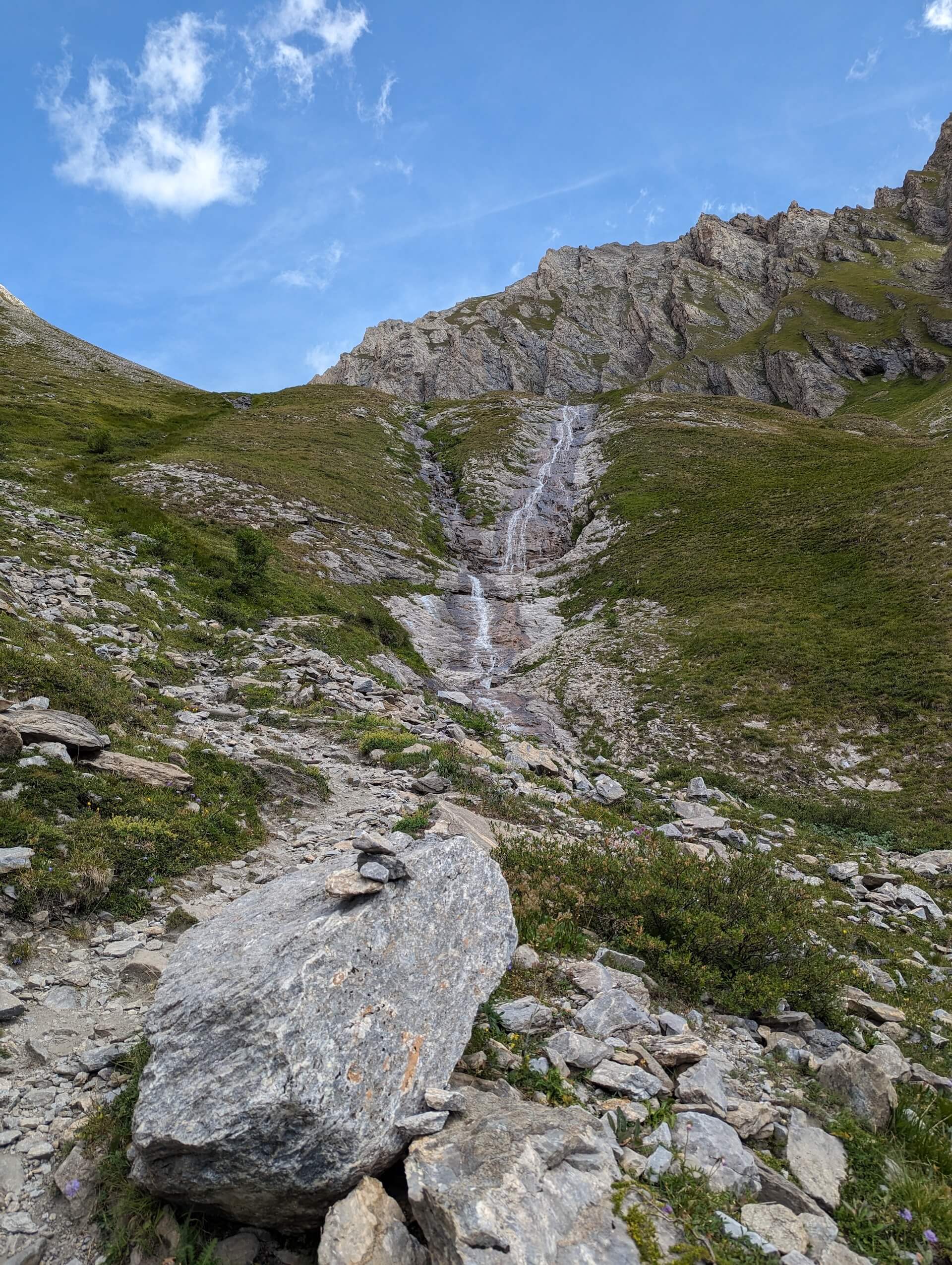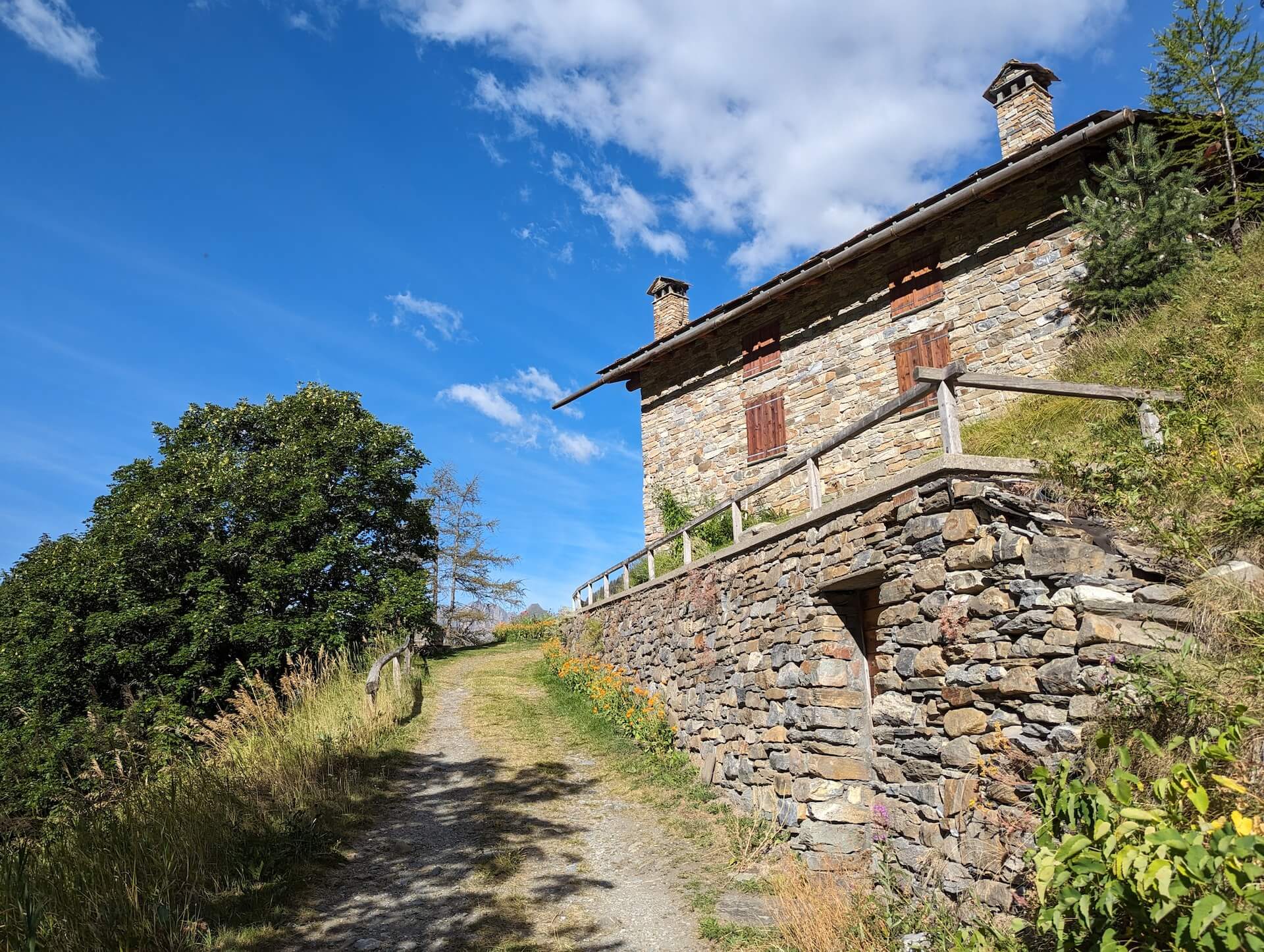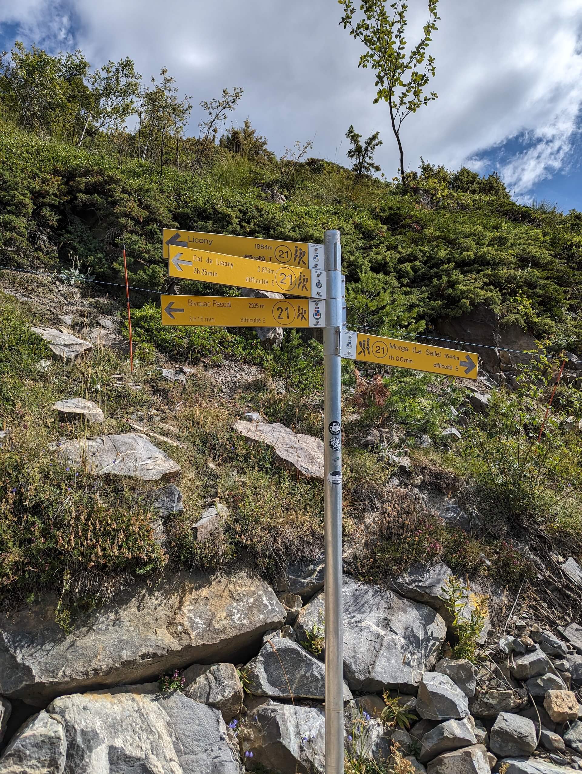 Continuer sur le sentier qui s’ouvre maintenant sur un vaste alpage. L’itinéraire rejoint un peu plus loin une piste carrossable réservée aux riverains. Suivre alors la direction « Col de Licony — 2 h 25 » comme mentionné sur le panneau pour gagner ensuite le hameau de Licony. C’est à partir d’ici que le gros du dénivelé positif s’effectue. Arrivé à un panneau, poursuivre en direction du « Lago Licony – 1 h 45 » et « Colle di Licony — 2 h 10 » par la large piste qu’il vaut mieux quitter au bout de quelques mètres pour suivre les flèches jaunes peintes sur les rochers. Un sentier étroit et escarpé devenant de plus en plus raide rallie une cascade qu’on laisse à droite. On aperçoit dès lors un petit col bien en vue, le lac étant situé juste derrière.