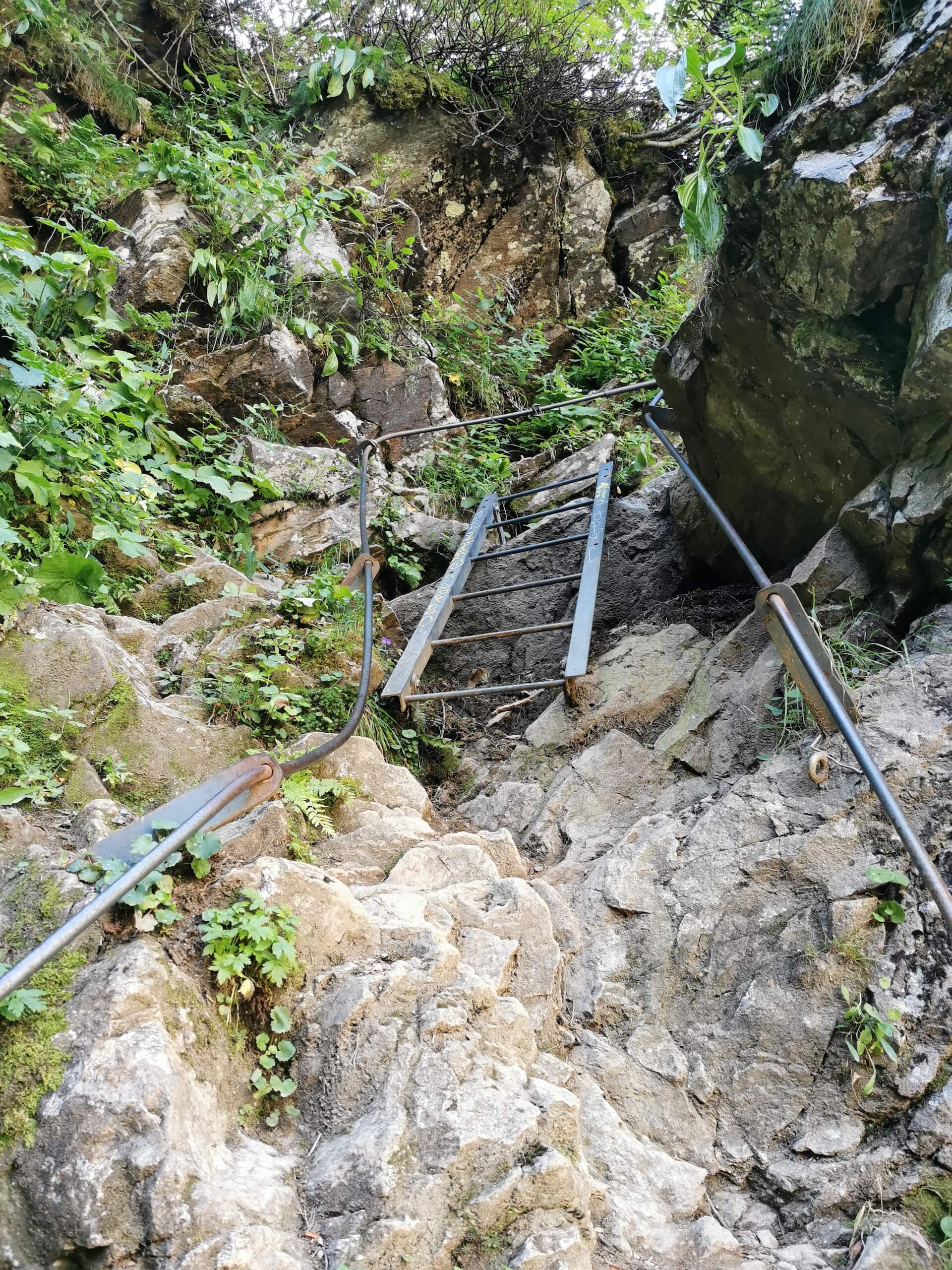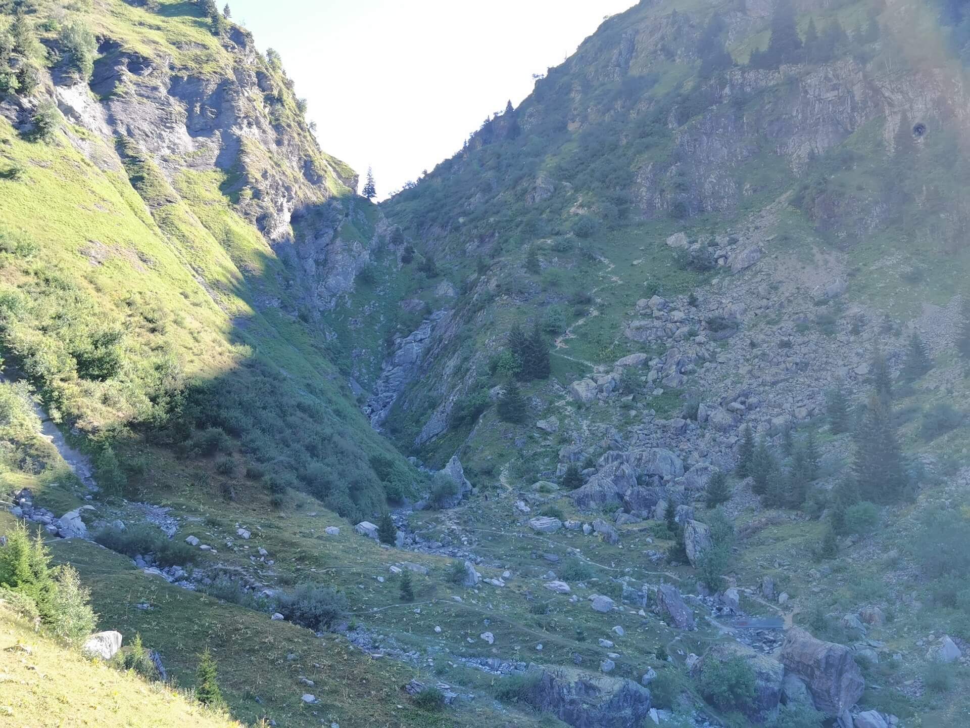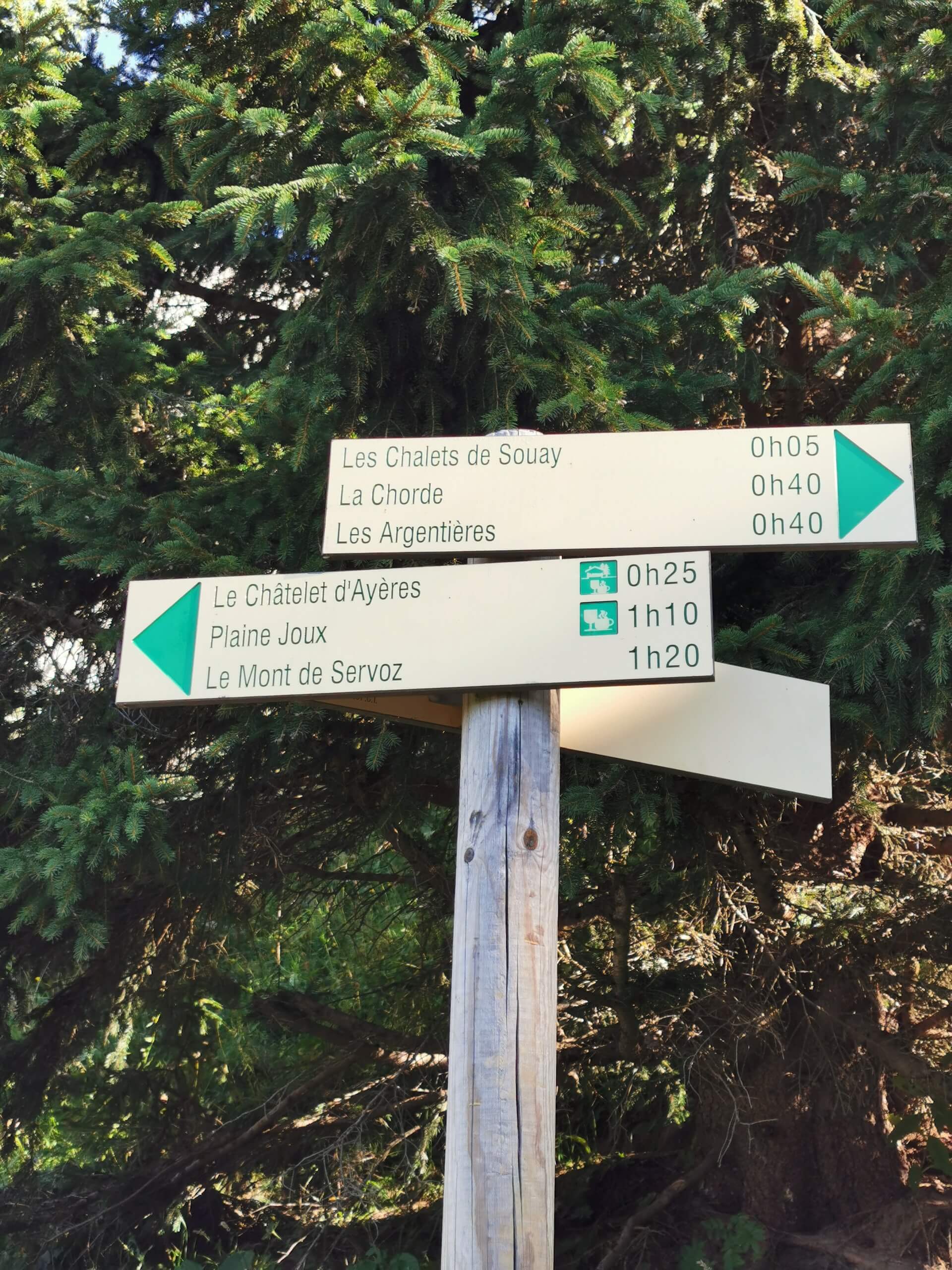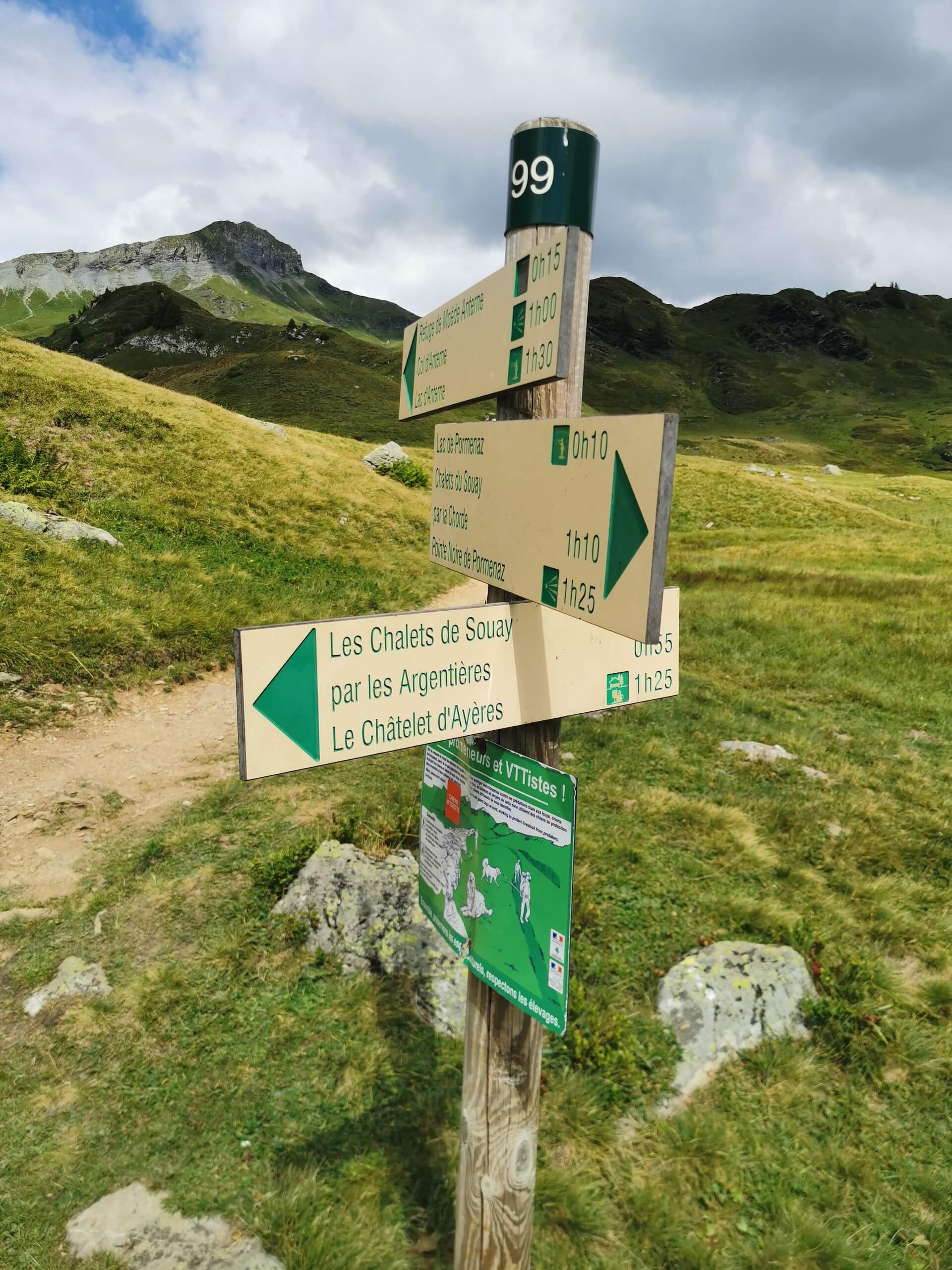 Au panneau après la passerelle, prendre la direction des « Chalets du Souay par les Argentières — 0 h 55 ». Cette variante évite ainsi de descendre par le sentier de la Chorde qui, bien que plus court, est plus acrobatique. Il faut noter que le sentier des Argentières s’est bien dégradé depuis ma dernière visite en 2015. En effet, de nombreuses pierres et un terrain très érodé rendent la descente parfois très pénible. Quelques passages sont par ailleurs équipés de chaînes qui facilitent la progression. Un peu avant l’arrivée aux Chalets du Souay, l’itinéraire longe la falaise : une main courante sécurise ce passage exposé.