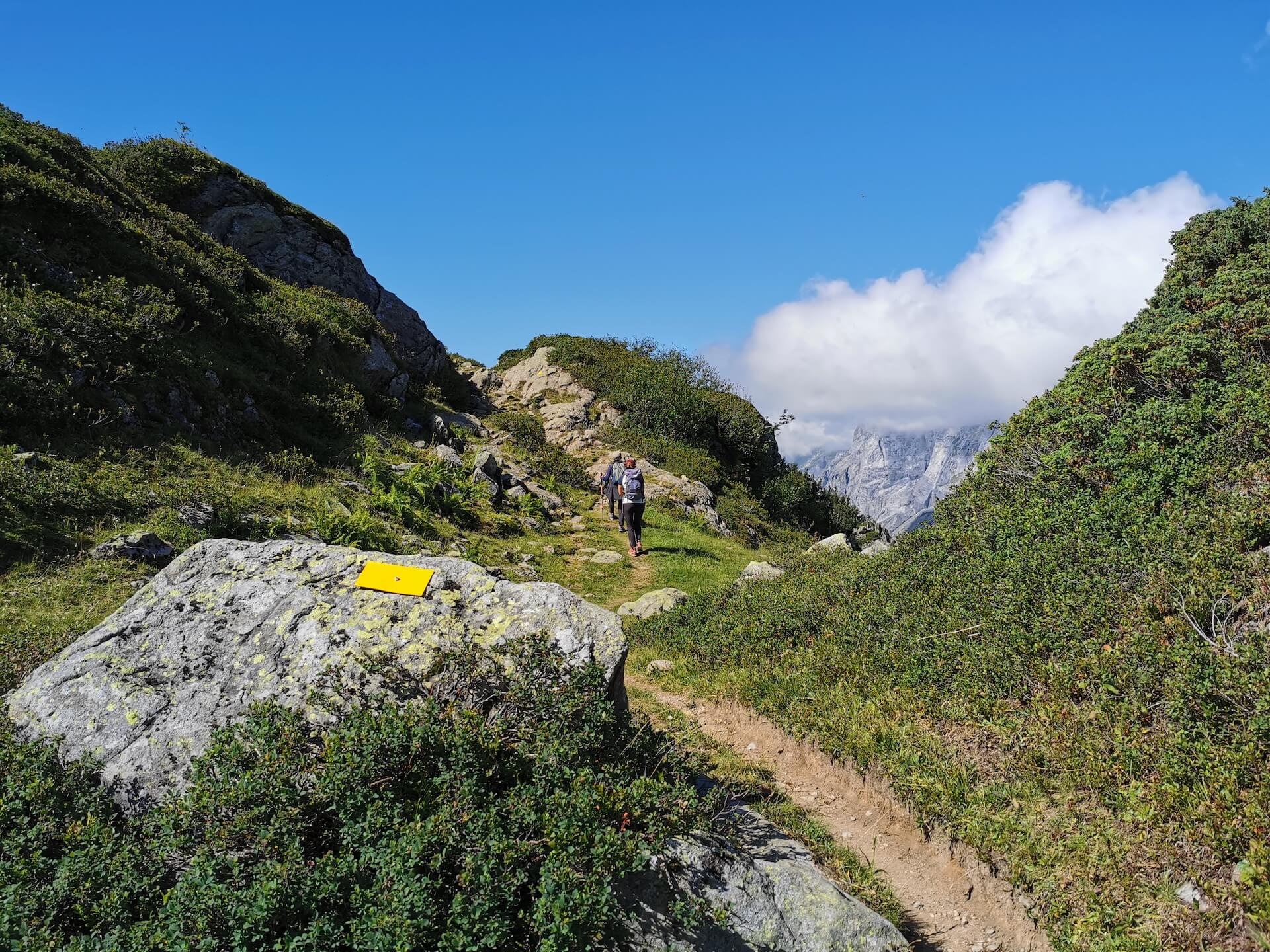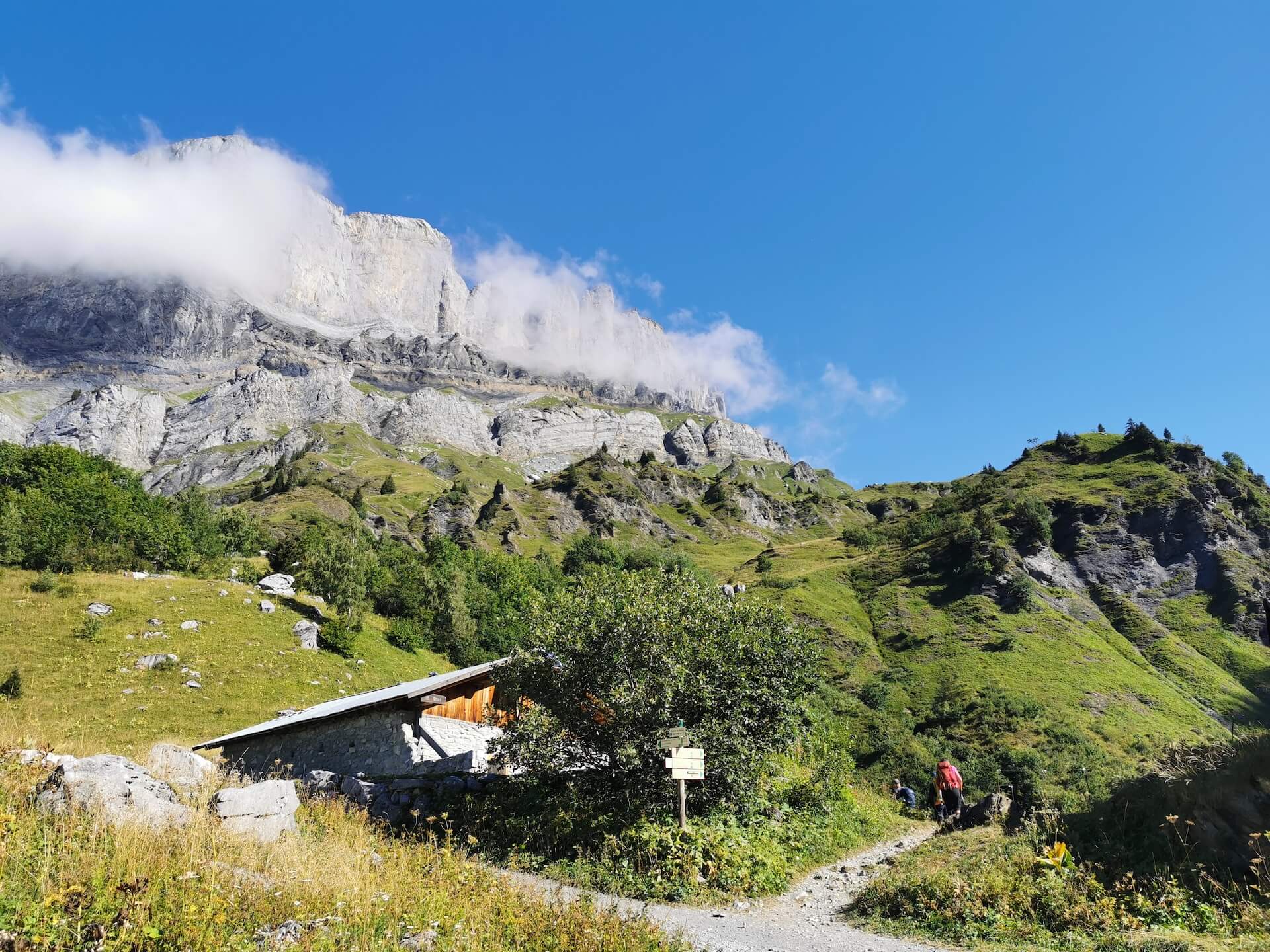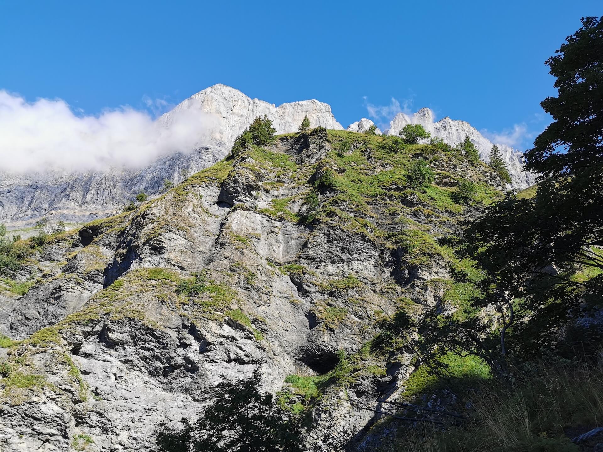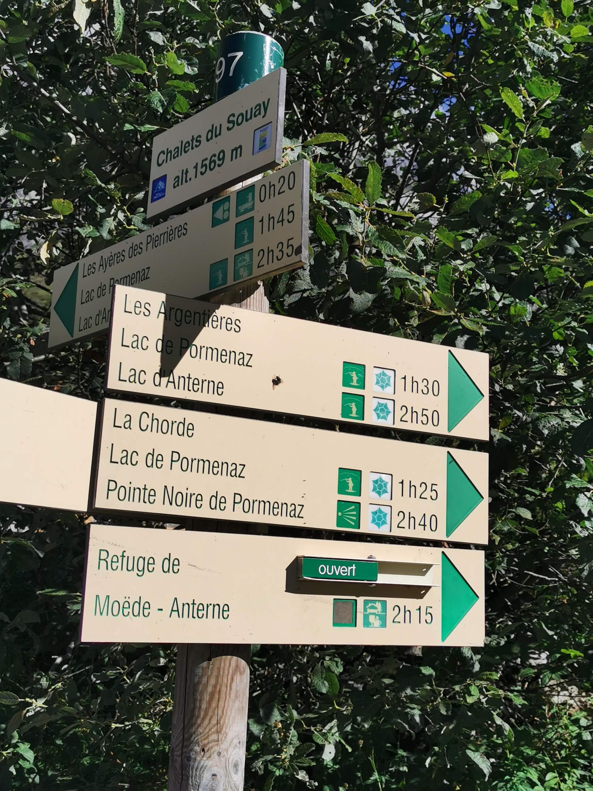 Au panneau après la passerelle, prendre la direction des « Chalets du Souay par les Argentières — 0 h 55 ». Cette variante évite ainsi de descendre par le sentier de la Chorde qui, bien que plus court, est plus acrobatique. Il faut noter que le sentier des Argentières s’est bien dégradé depuis ma dernière visite en 2015. En effet, de nombreuses pierres et un terrain très érodé rendent la descente parfois très pénible. Quelques passages sont par ailleurs équipés de chaînes qui facilitent la progression. Un peu avant l’arrivée aux Chalets du Souay, l’itinéraire longe la falaise : une main courante sécurise ce passage exposé.