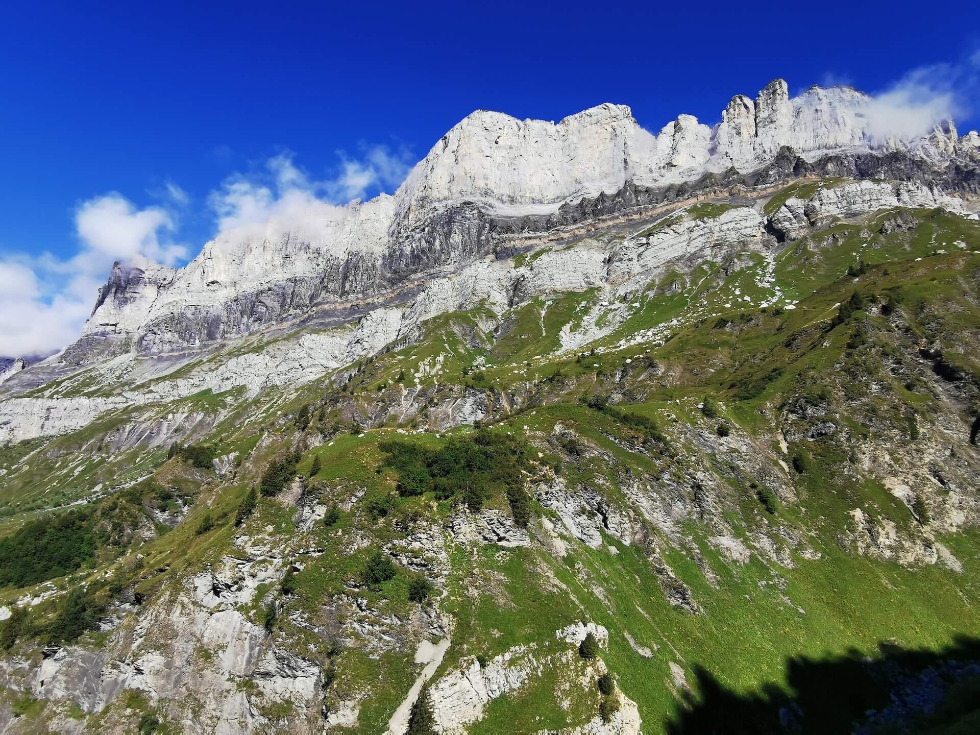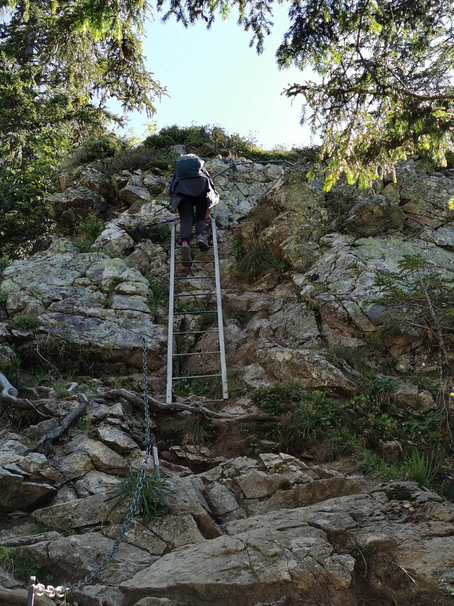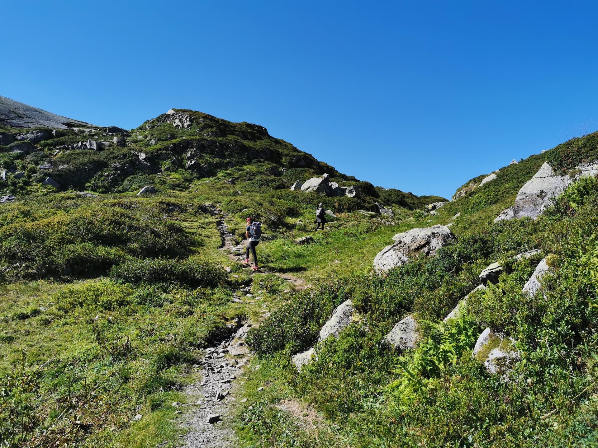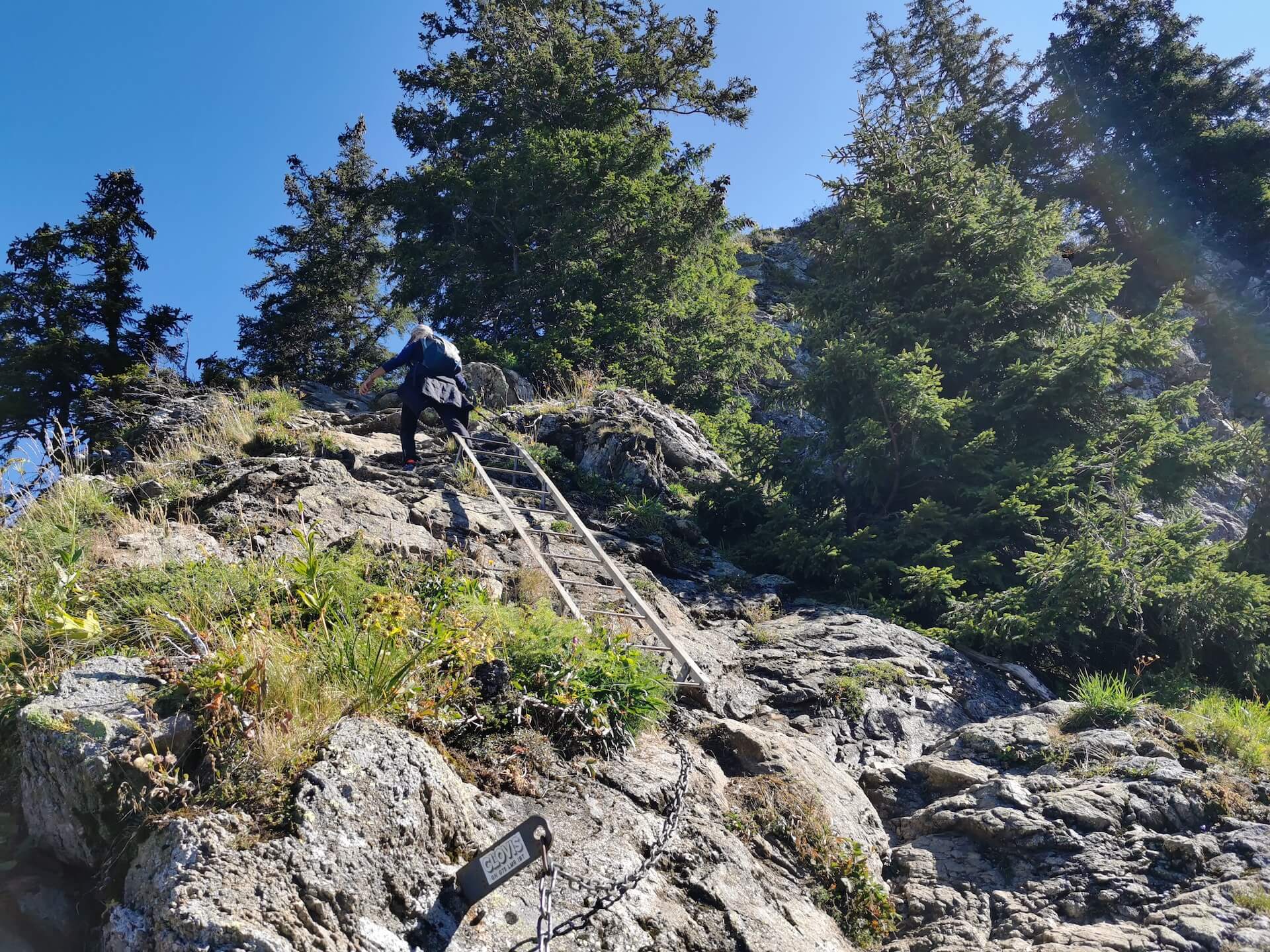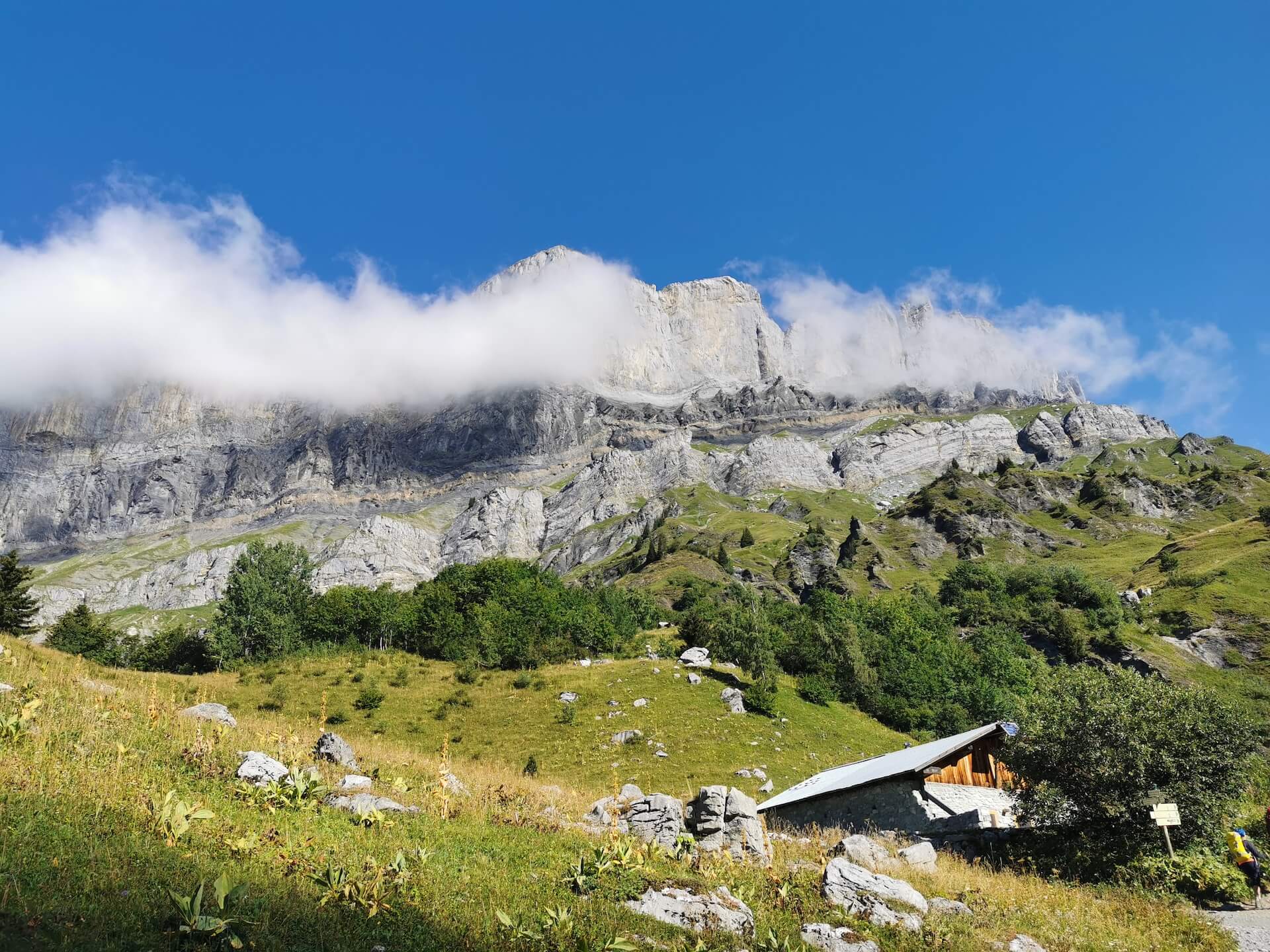 Au panneau après la passerelle, prendre la direction des « Chalets du Souay par les Argentières — 0 h 55 ». Cette variante évite ainsi de descendre par le sentier de la Chorde qui, bien que plus court, est plus acrobatique. Il faut noter que le sentier des Argentières s’est bien dégradé depuis ma dernière visite en 2015. En effet, de nombreuses pierres et un terrain très érodé rendent la descente parfois très pénible. Quelques passages sont par ailleurs équipés de chaînes qui facilitent la progression. Un peu avant l’arrivée aux Chalets du Souay, l’itinéraire longe la falaise : une main courante sécurise ce passage exposé.