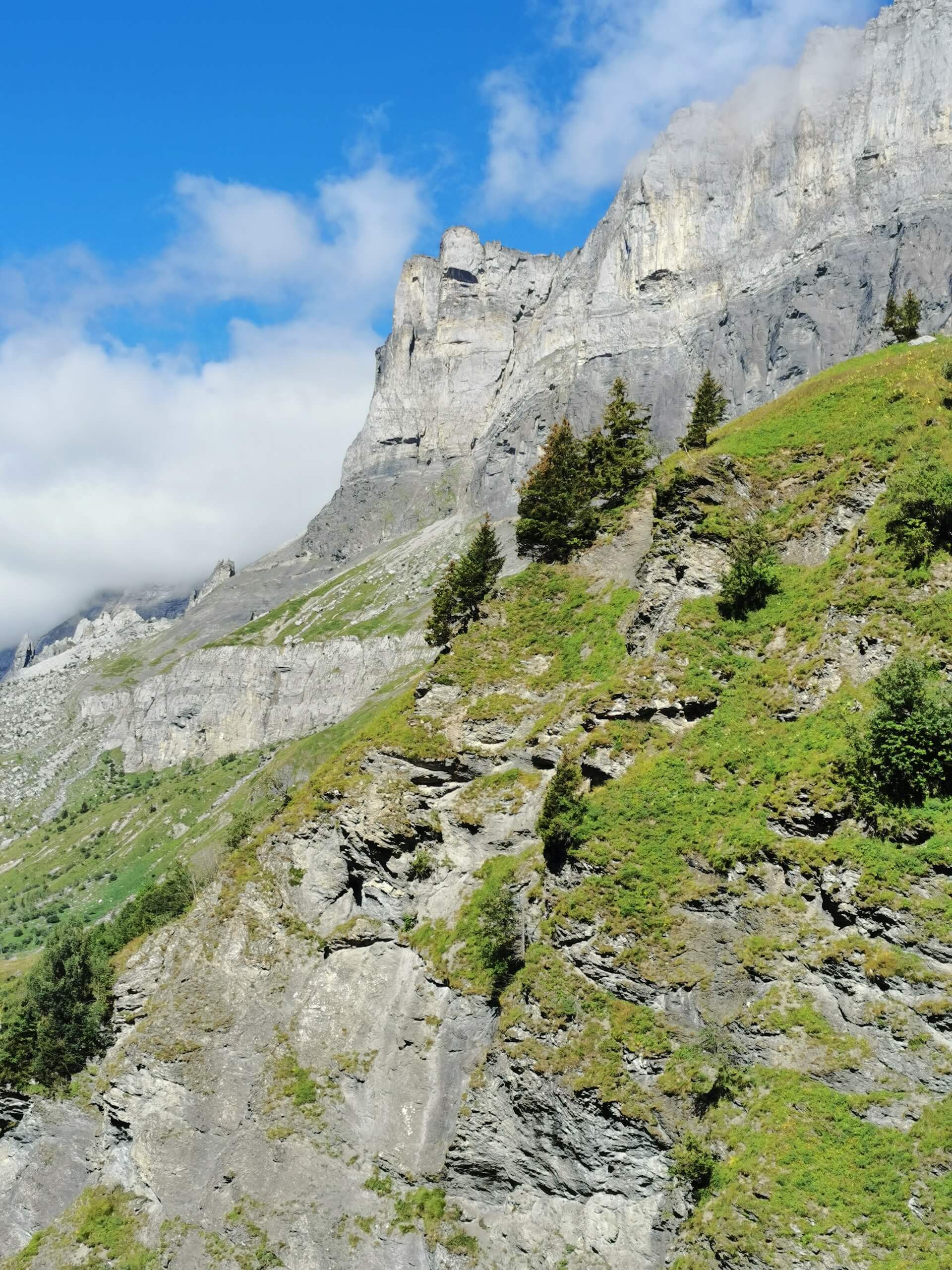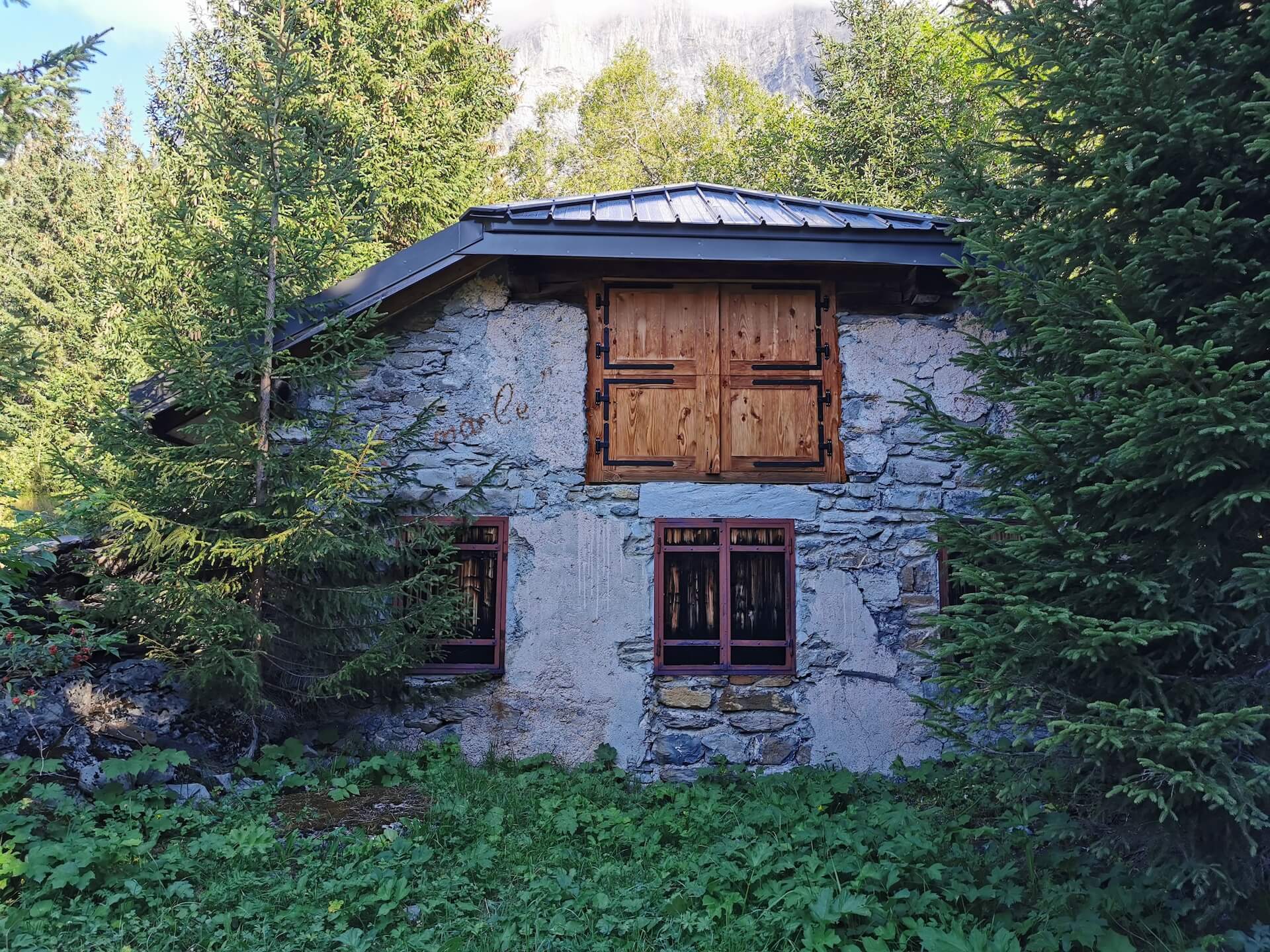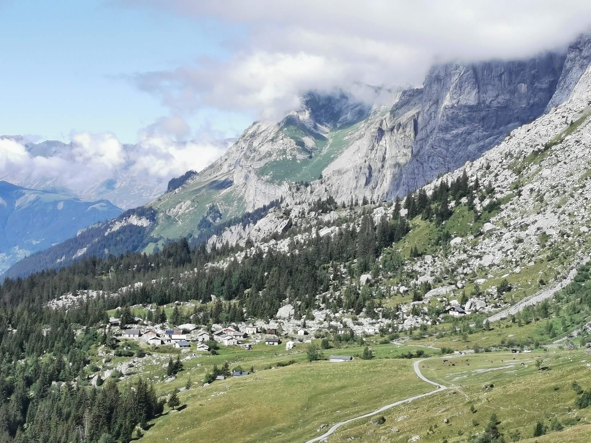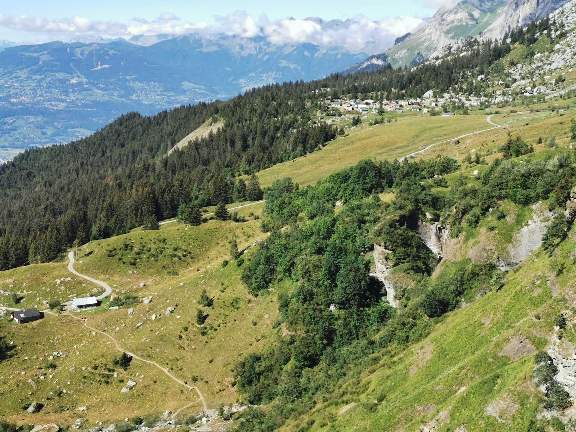 Au panneau après la passerelle, prendre la direction des « Chalets du Souay par les Argentières — 0 h 55 ». Cette variante évite ainsi de descendre par le sentier de la Chorde qui, bien que plus court, est plus acrobatique. Il faut noter que le sentier des Argentières s’est bien dégradé depuis ma dernière visite en 2015. En effet, de nombreuses pierres et un terrain très érodé rendent la descente parfois très pénible. Quelques passages sont par ailleurs équipés de chaînes qui facilitent la progression. Un peu avant l’arrivée aux Chalets du Souay, l’itinéraire longe la falaise : une main courante sécurise ce passage exposé.
