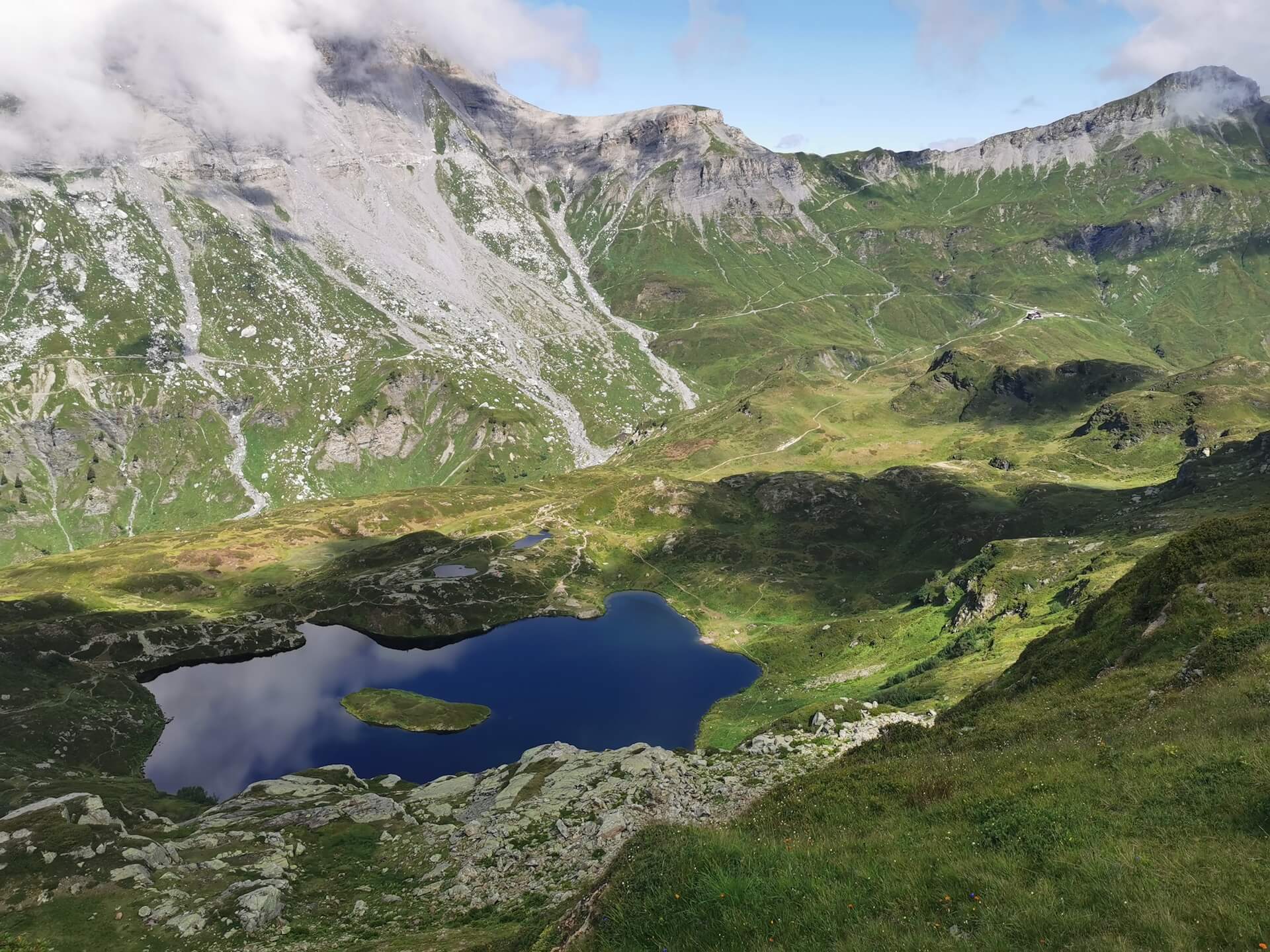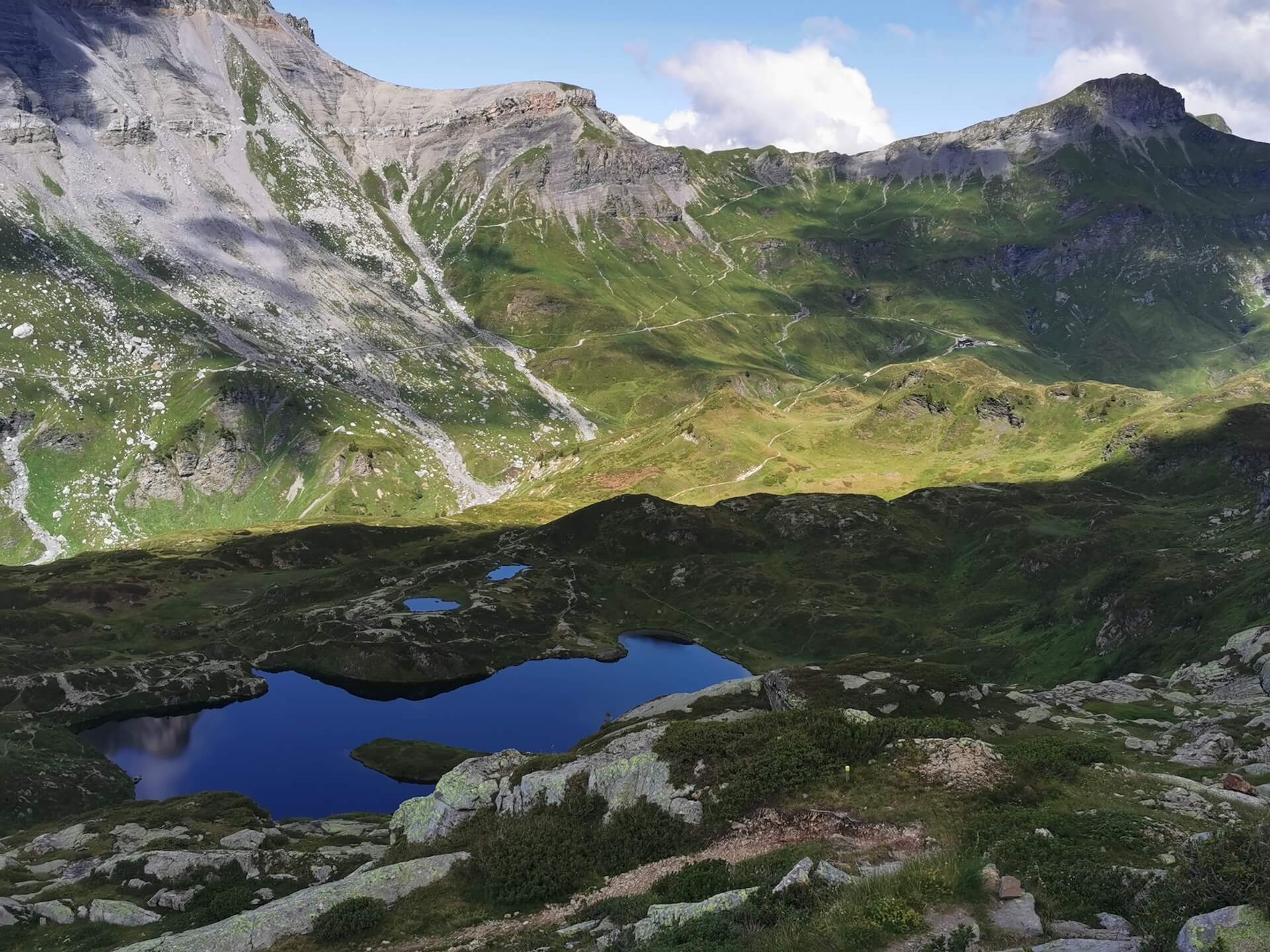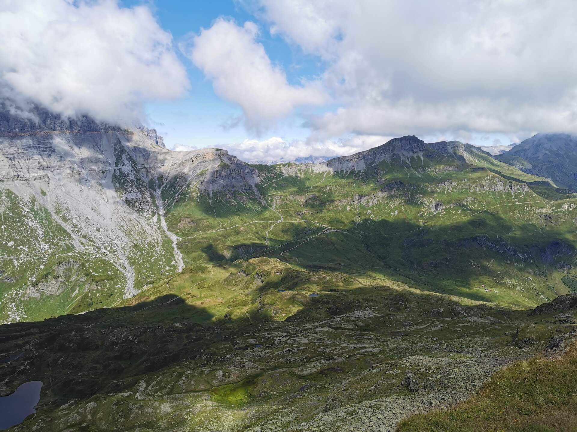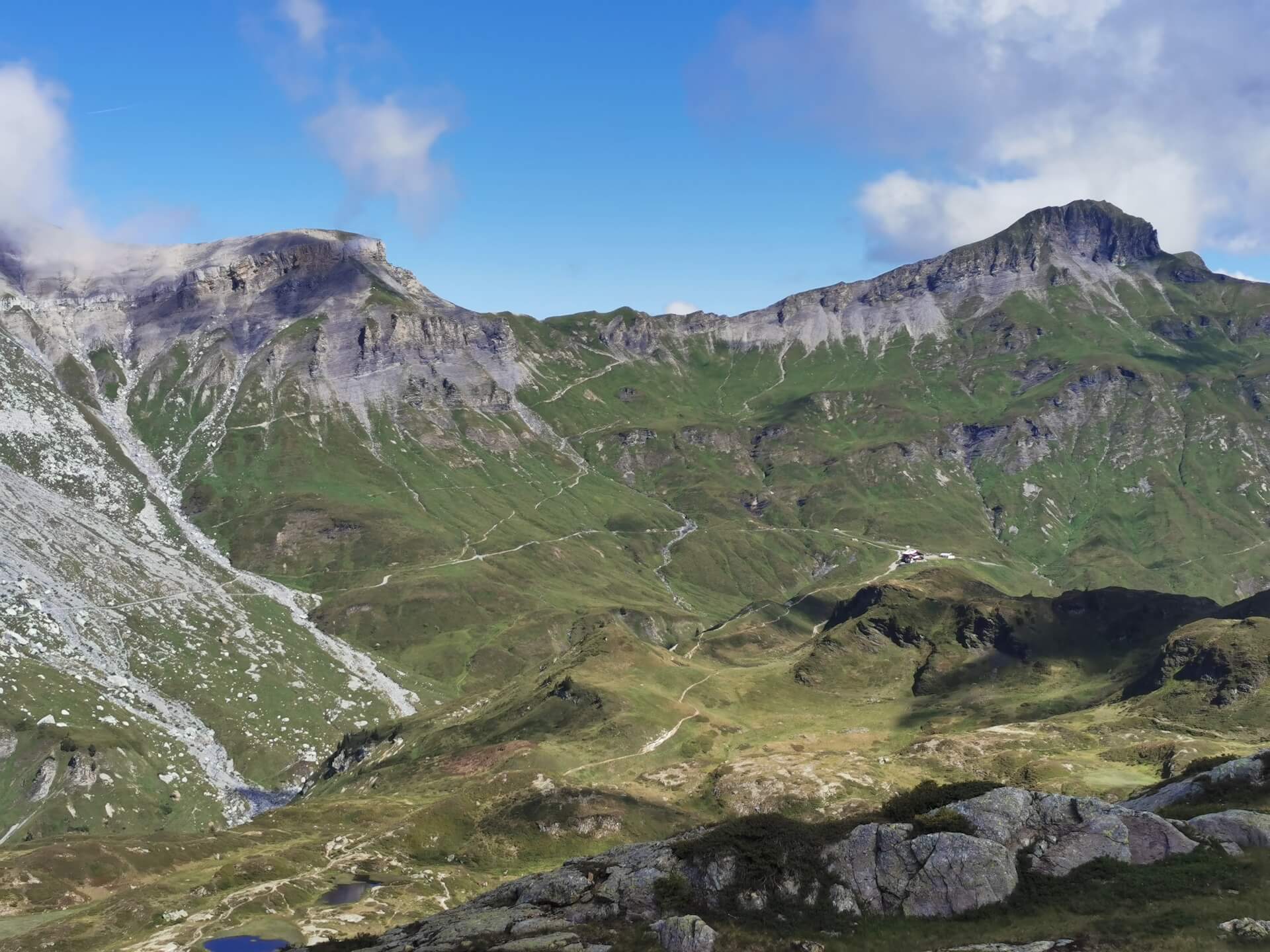 Au panneau après la passerelle, prendre la direction des « Chalets du Souay par les Argentières — 0 h 55 ». Cette variante évite ainsi de descendre par le sentier de la Chorde qui, bien que plus court, est plus acrobatique. Il faut noter que le sentier des Argentières s’est bien dégradé depuis ma dernière visite en 2015. En effet, de nombreuses pierres et un terrain très érodé rendent la descente parfois très pénible. Quelques passages sont par ailleurs équipés de chaînes qui facilitent la progression. Un peu avant l’arrivée aux Chalets du Souay, l’itinéraire longe la falaise : une main courante sécurise ce passage exposé.