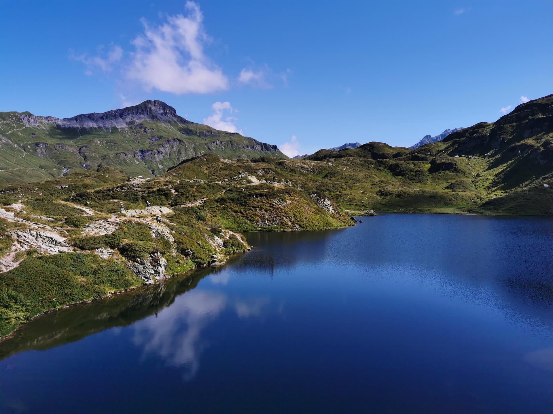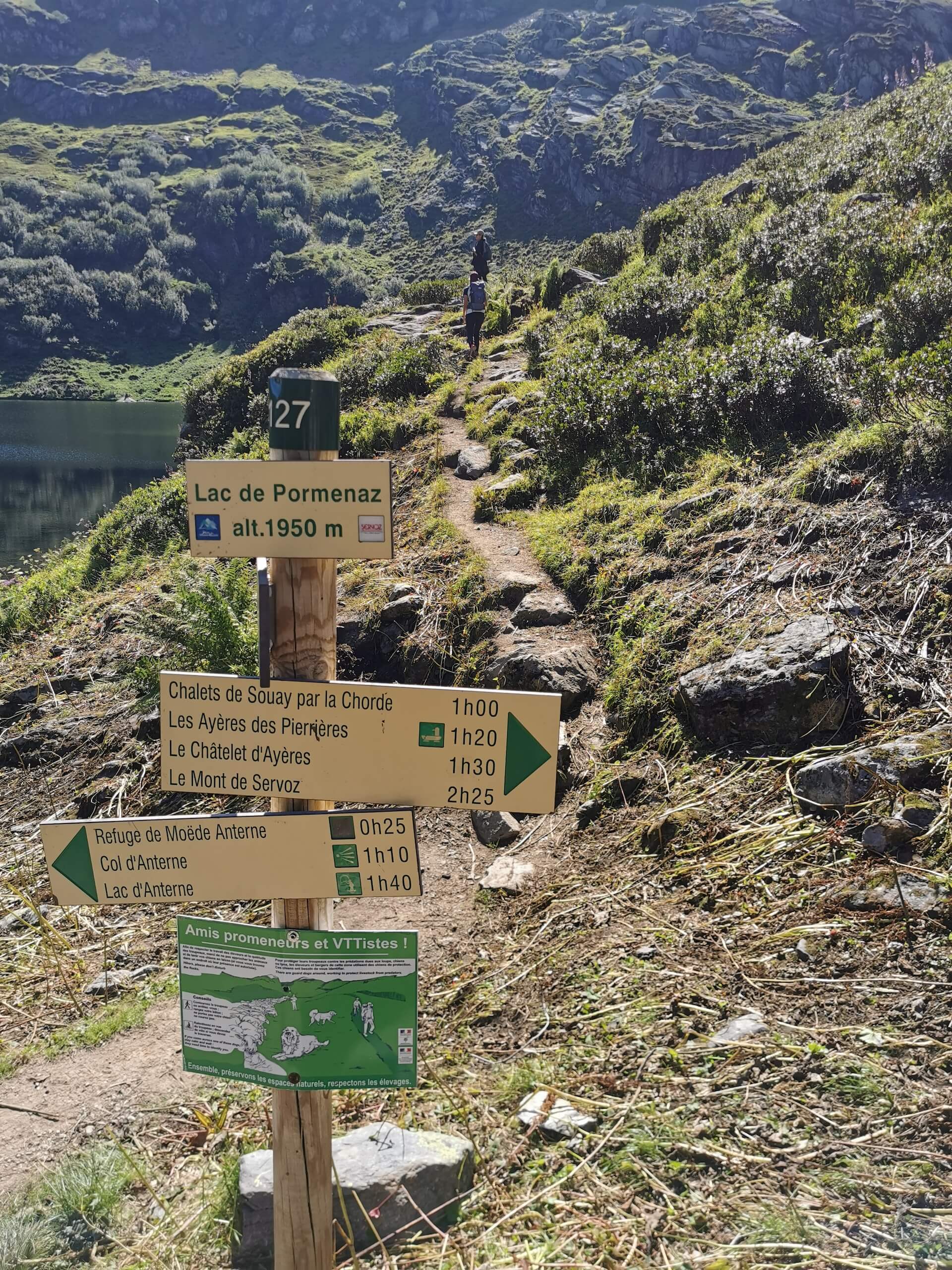Reprendre par la suite l’itinéraire de la montée jusqu’au Lac de Pormenaz. Je propose d’en faire le tour par l’est par l’intermédiaire d’une sente mal tracée au début, puis qui rejoint la rive du lac dans un deuxième temps. Le sentier suit le bord du lac jusqu’à un chemin qui descend en direction du col d’Anterne puis une passerelle en bois qu’il s’agit de franchir.