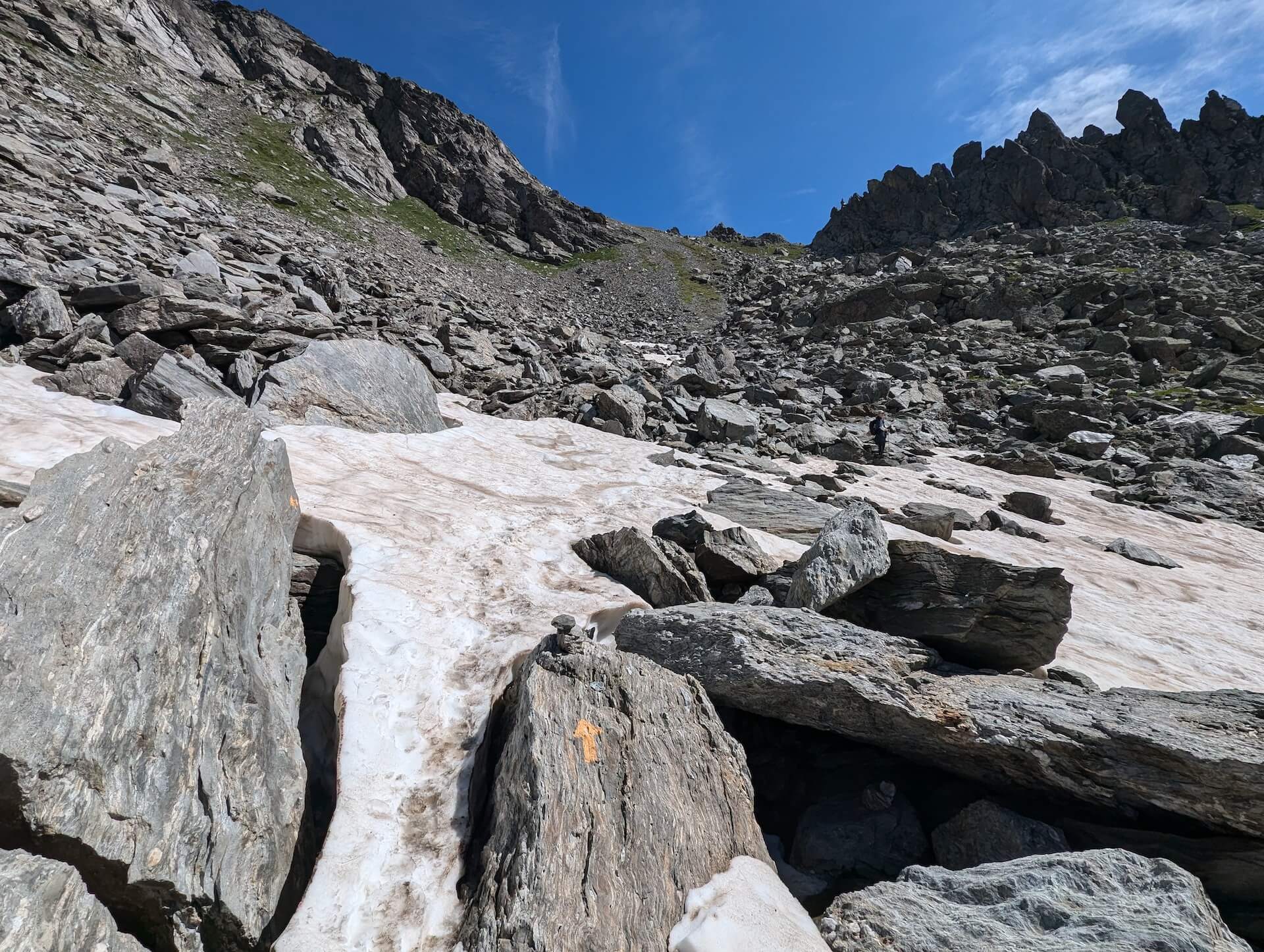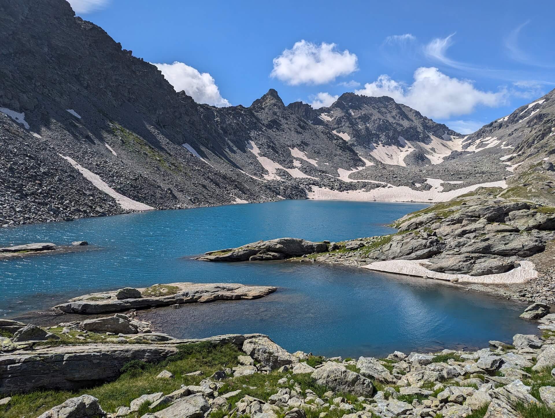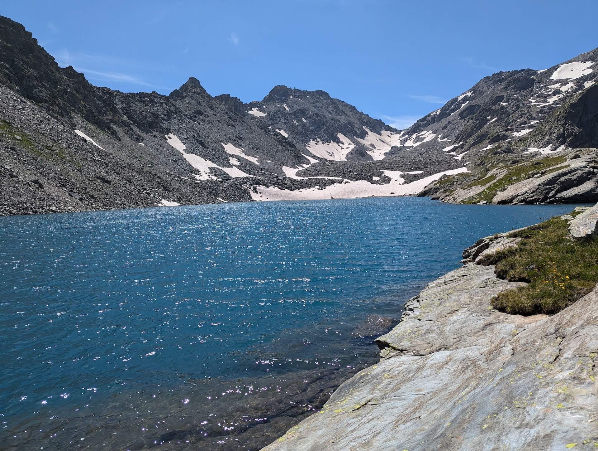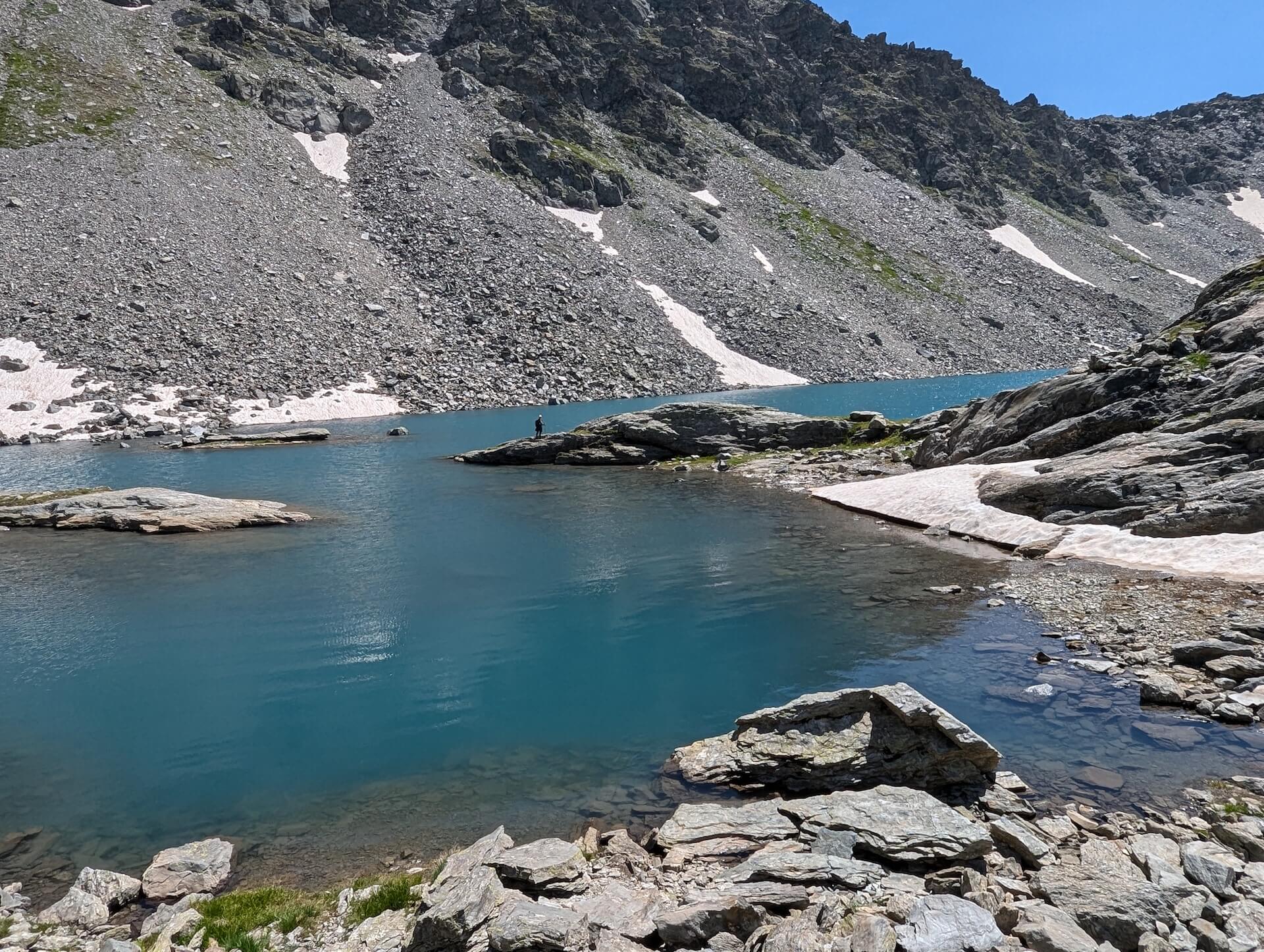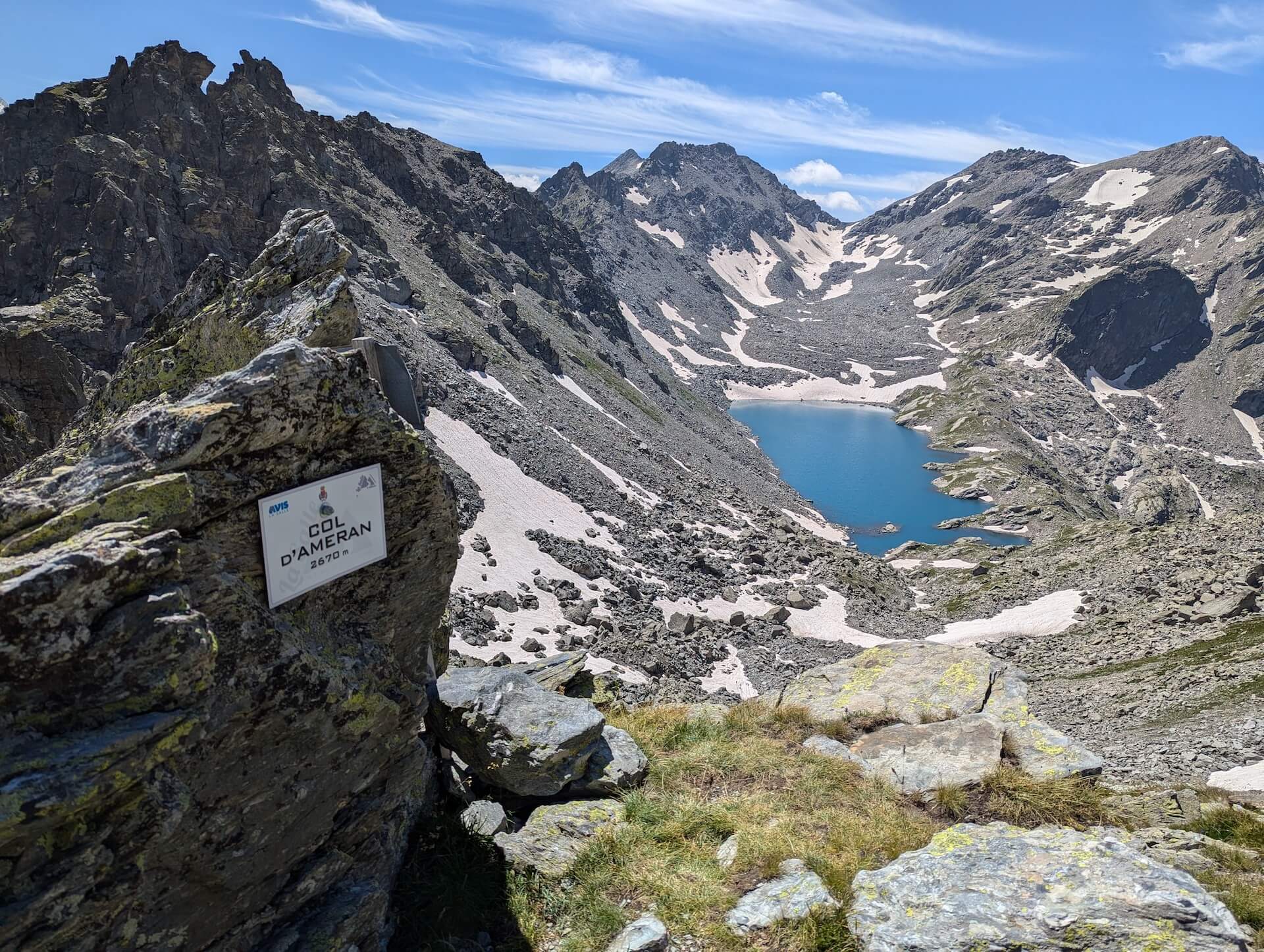 Then walk alongside the lake and take the path leading to the Col d’Ameran, which is clearly visible. You then have to cross several névés, which are not very difficult. The climb then becomes much steeper until you reach the col d’Ameran.