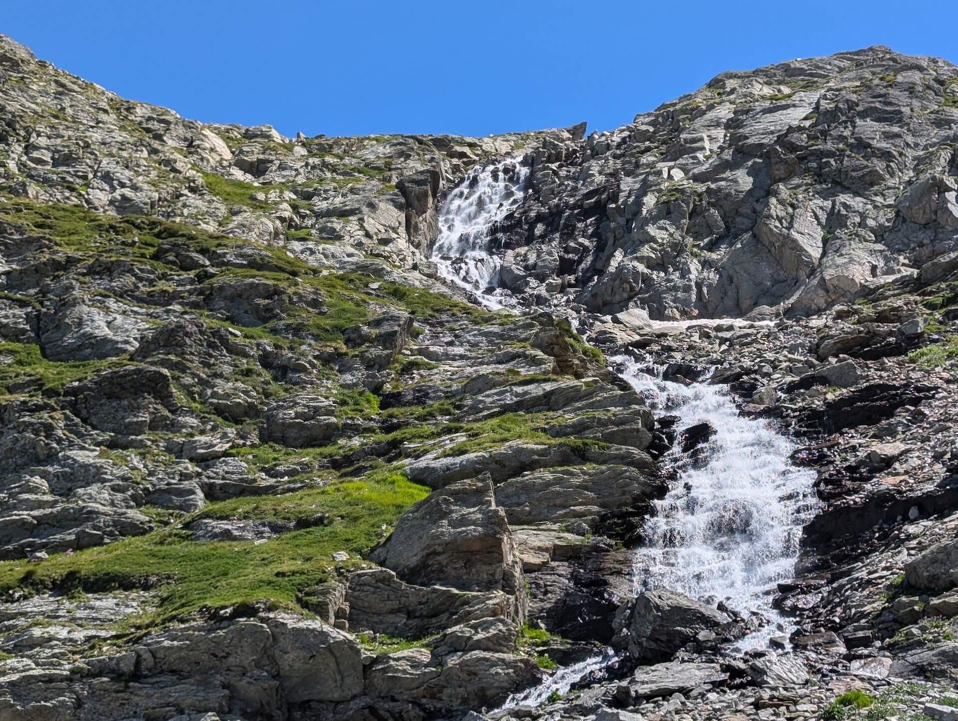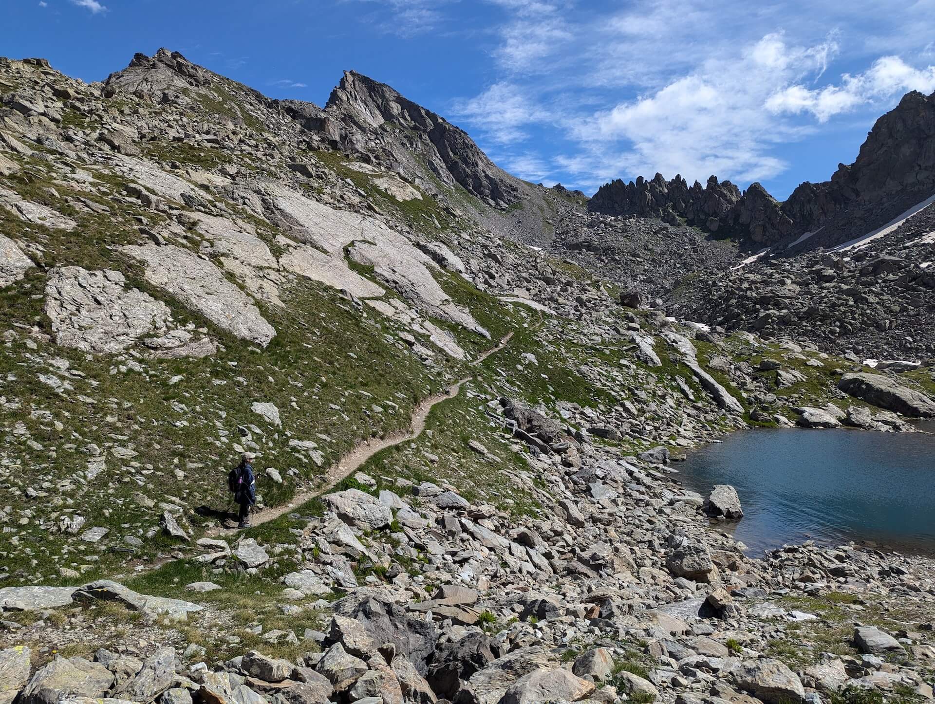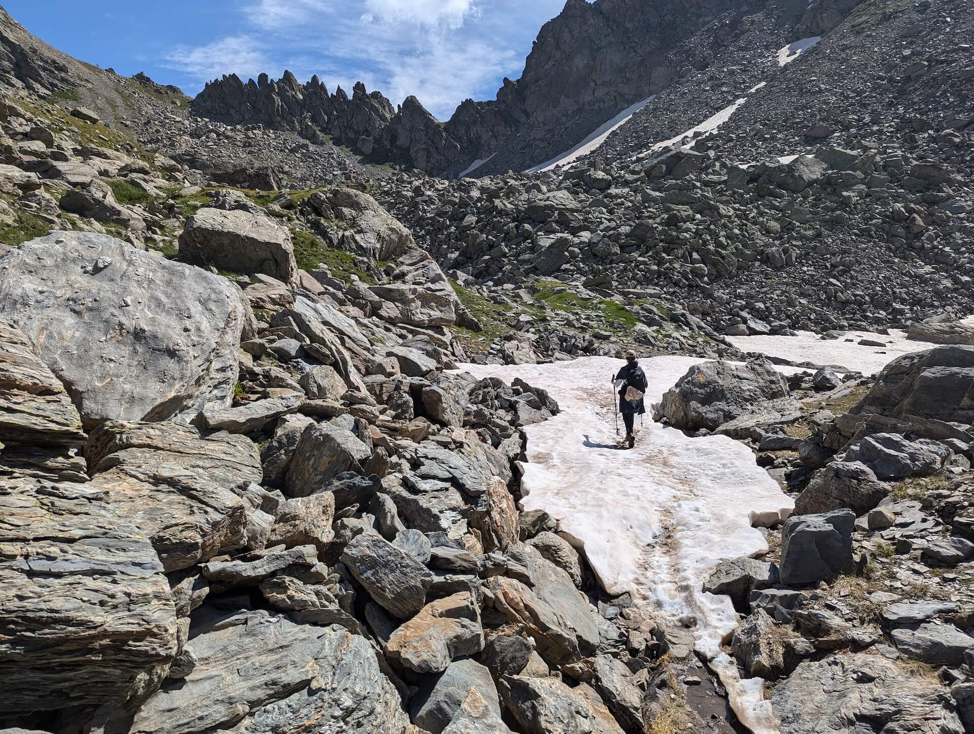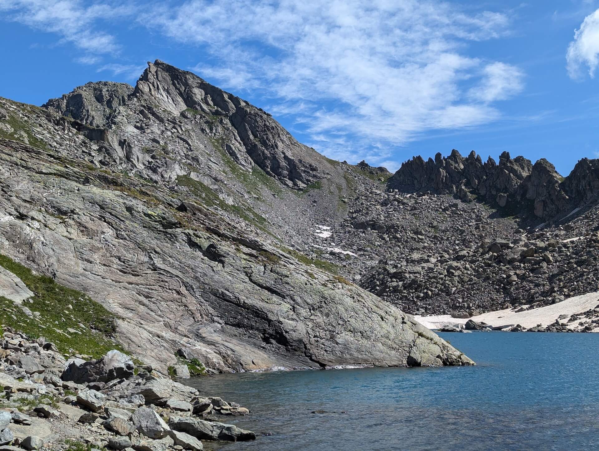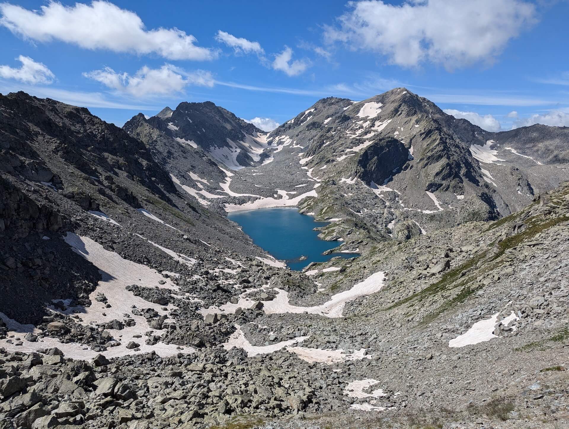 Then walk alongside the lake and take the path leading to the Col d’Ameran, which is clearly visible. You then have to cross several névés, which are not very difficult. The climb then becomes much steeper until you reach the col d’Ameran.