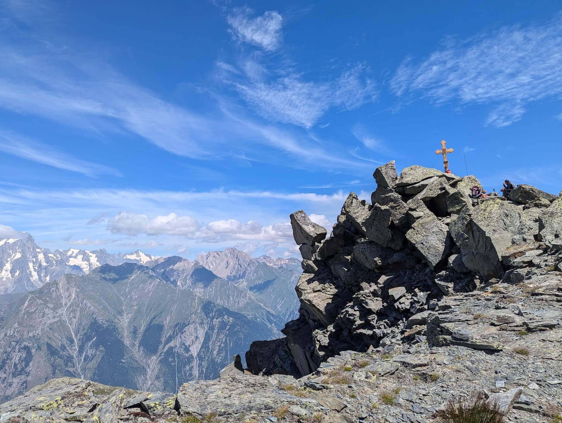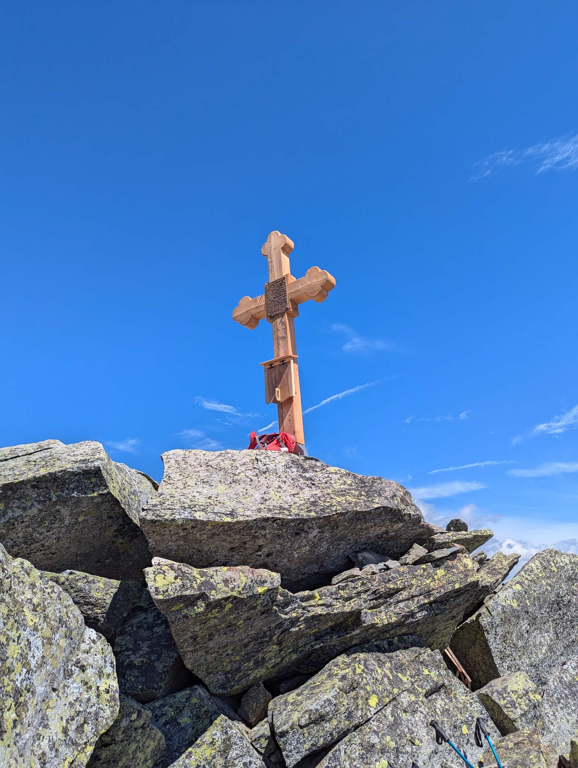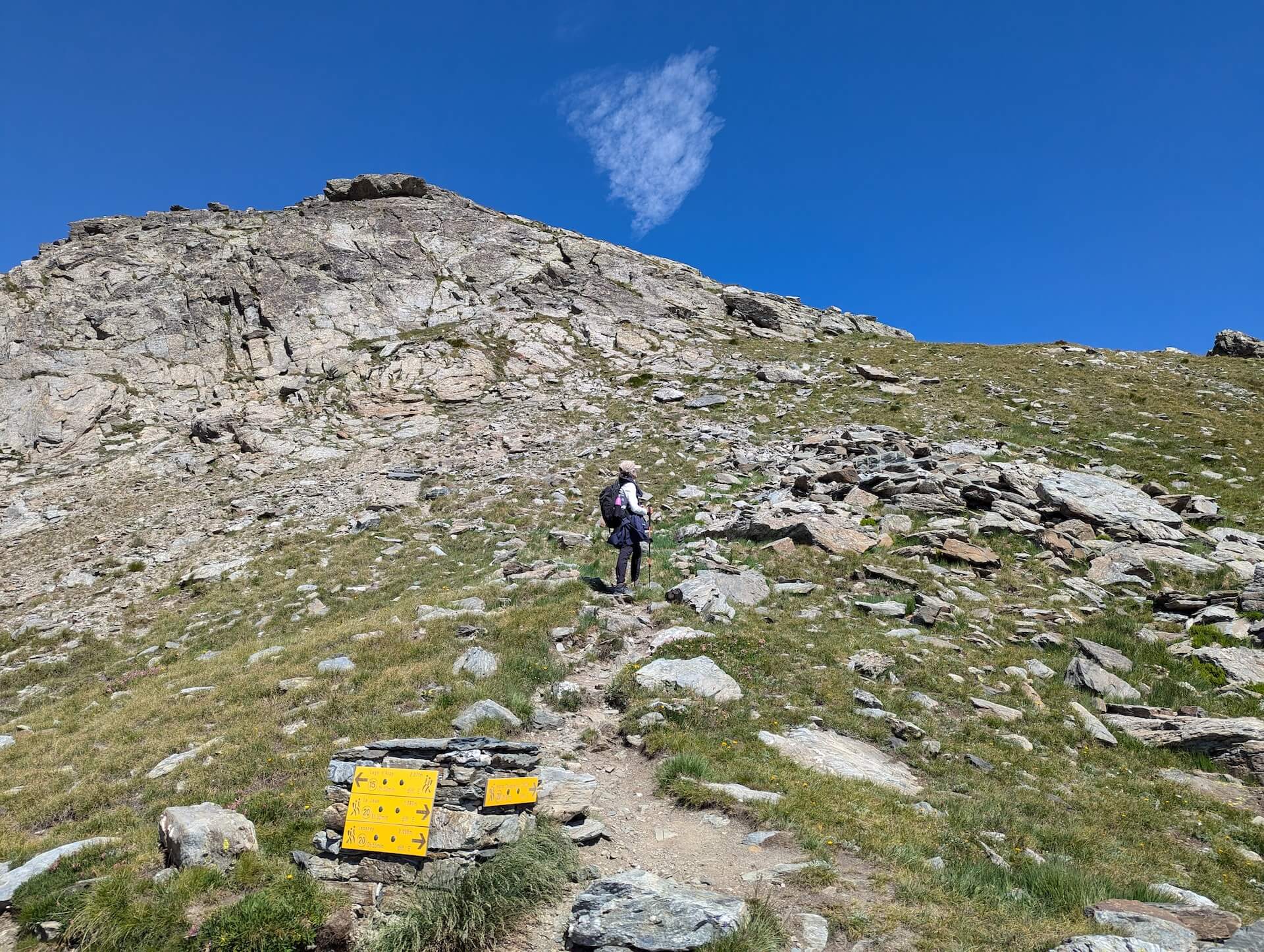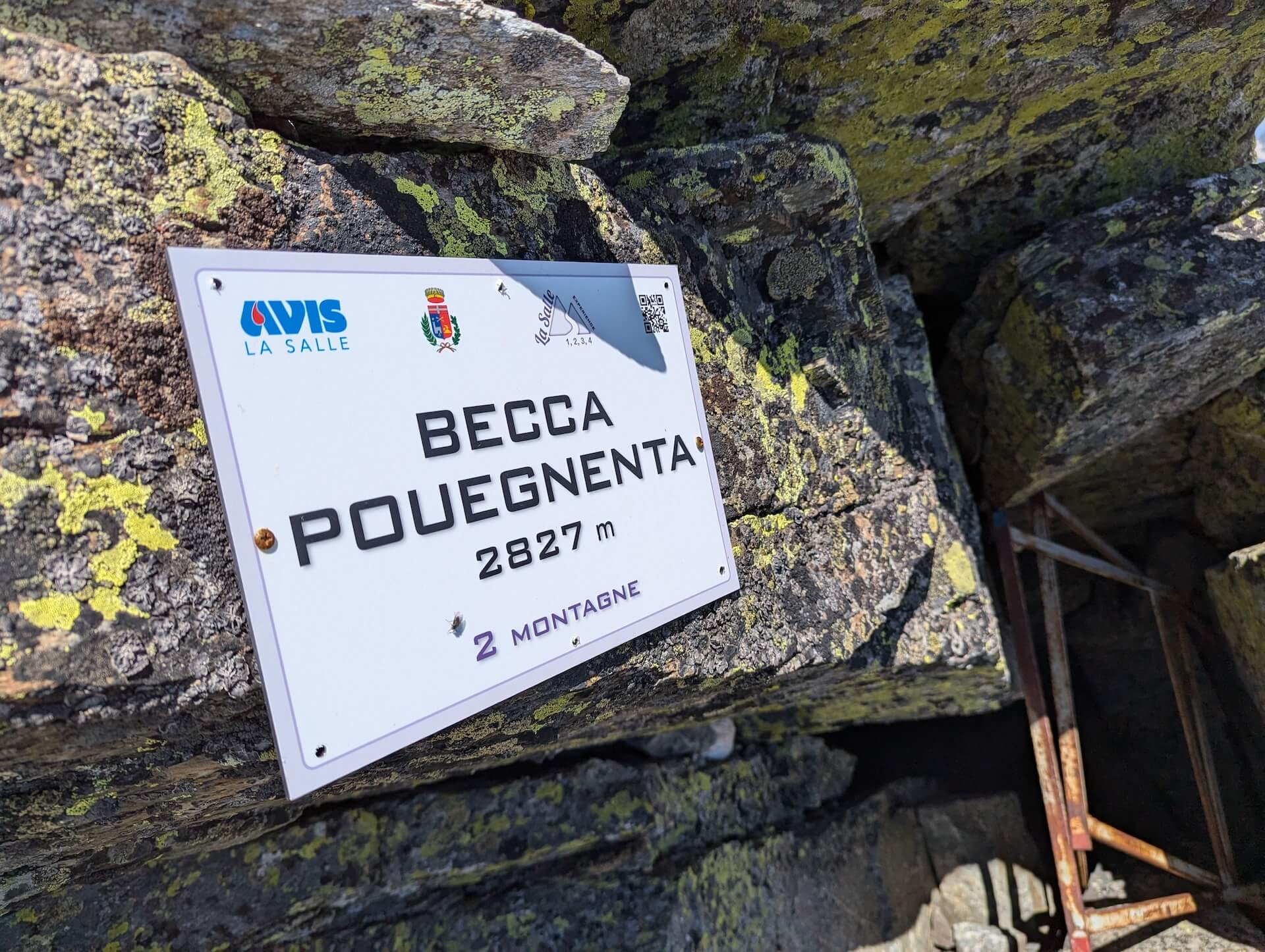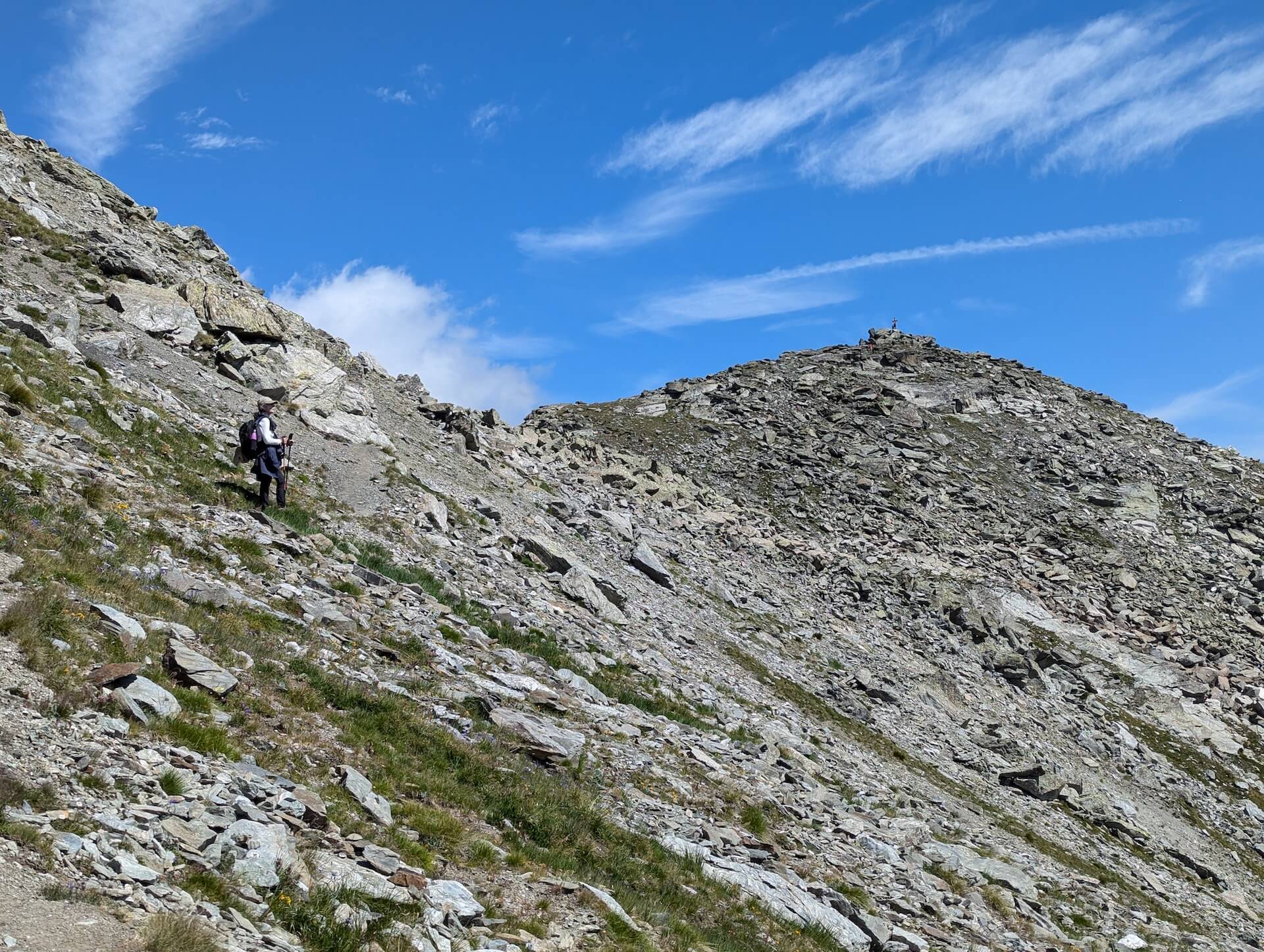 From here, continue to the left towards “Becca Pouegnenta – 0 h 19 min”. The path is steeper and climbs the slope; take care at this short point, which can be tricky. Further on, the finish is very close and is still clearly visible thanks to the cross that marks it.