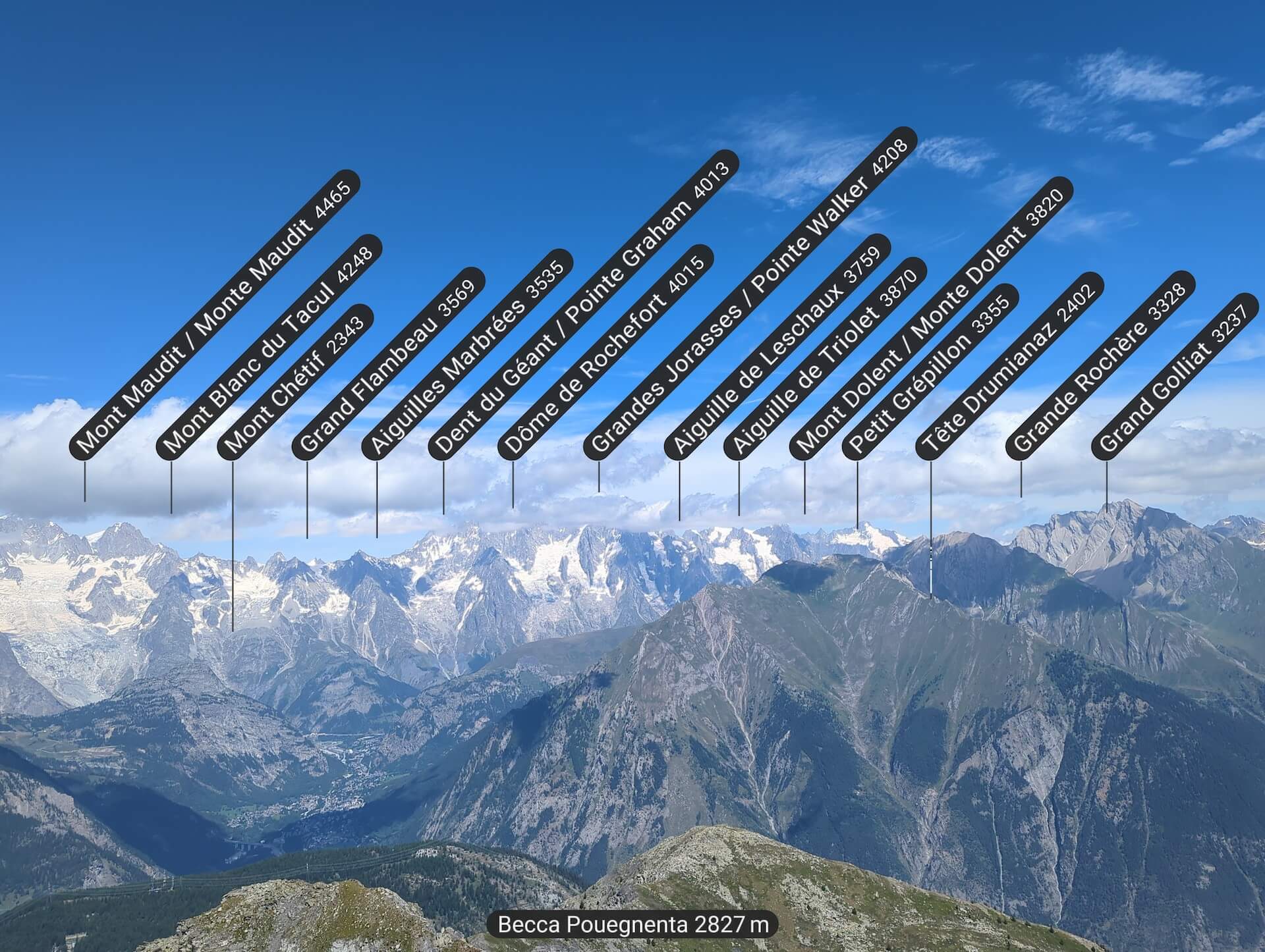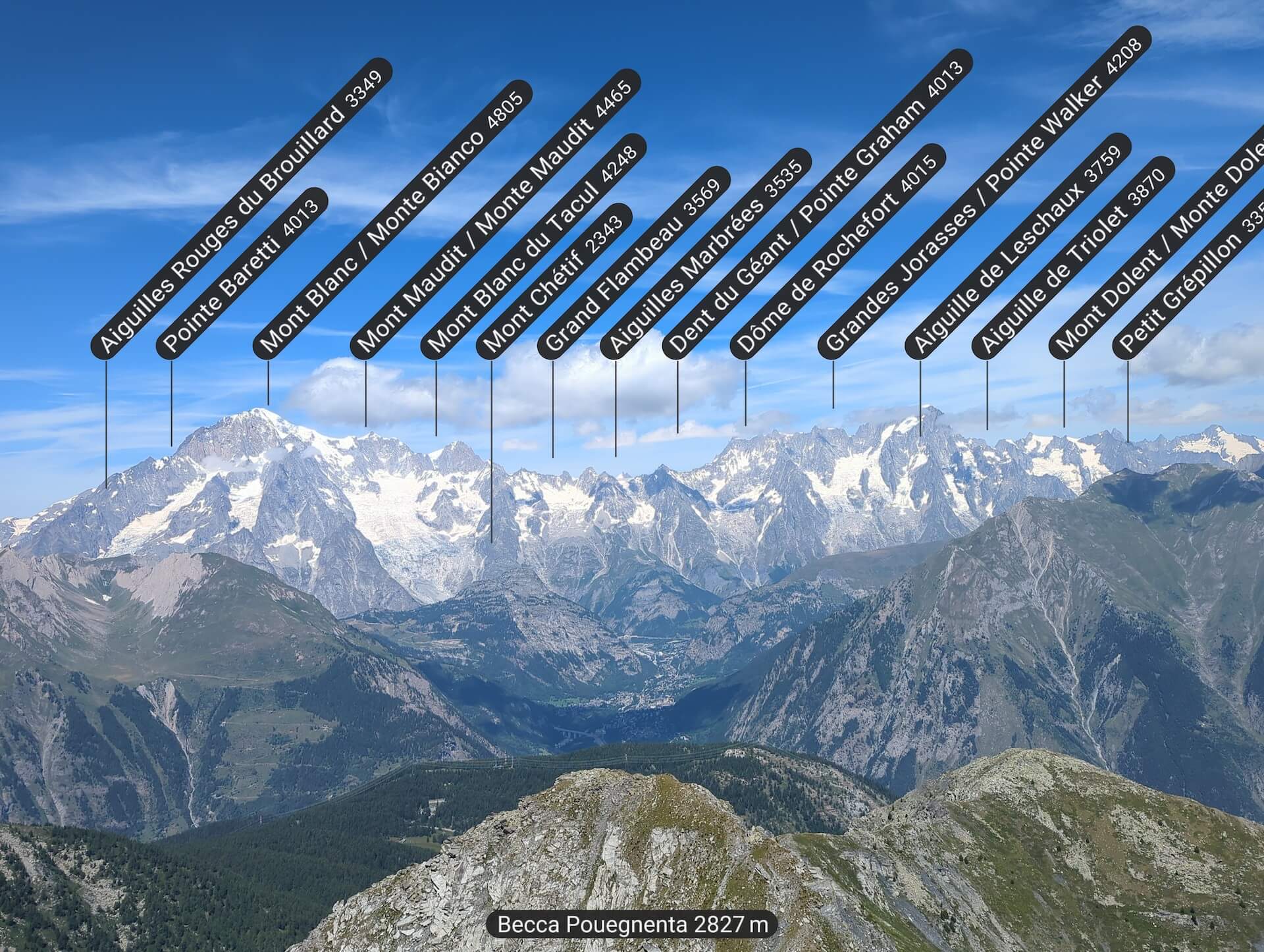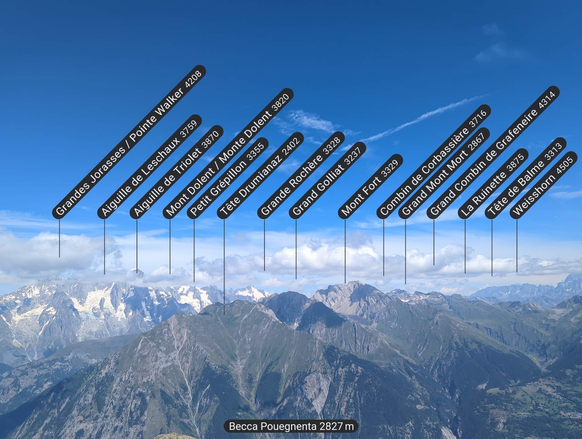 Becca Pouegnenta, nestling in the heart of the Aosta Valley, is a must-see hiking destination for nature lovers and mountain enthusiasts. Although relatively unknown, this summit offers a unique experience, combining wild beauty and absolute tranquillity. Reaching an altitude of 2,827 metres, Becca Pouegnenta overlooks the Lago di Pietra Rossa and offers breathtaking views of the surrounding peaks, including Mont Blanc, the Grandes Jorasses and Mont Fort in the Valais Alps.