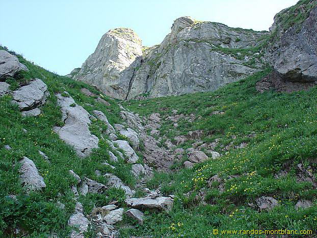 Take the path on the right behind the Refuge of Bise to join the Pas de la Bosse by a rather steep path. Then go left to reach the Serrauquin couloir. The ascent is steep and the effort required to reach the top of this couloir with its reddish rocks is significant. It should be noted that this couloir is often visited by many ibexes.