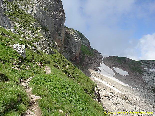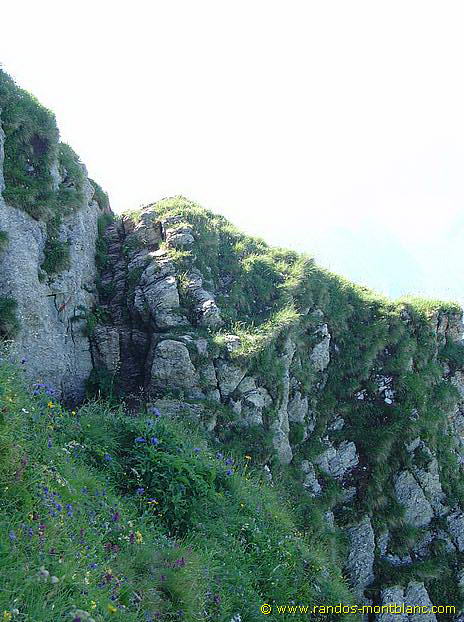 At the end of the couloir, continue on the right on the ridge that dominates the slope overlooking Bise. The path then becomes steeper and several exposed passages encourage caution. The footpath in the rocks requires sustained attention, as the holds are slippery and slippery.
