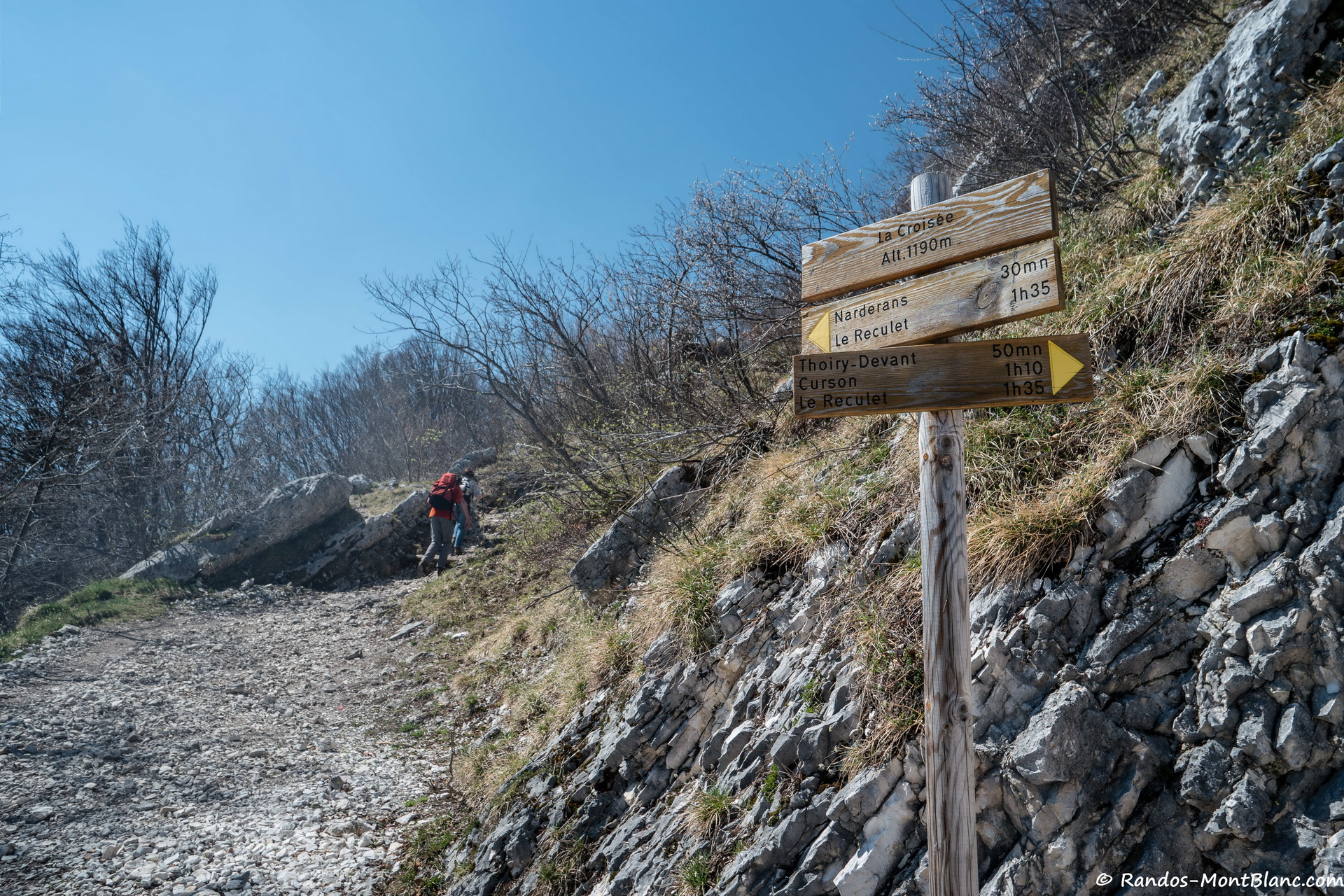 Now come the junction with the stony road that you have to follow until you reach La Croisée (1,190 m) where you turn left towards Narderans and Le Reculet.