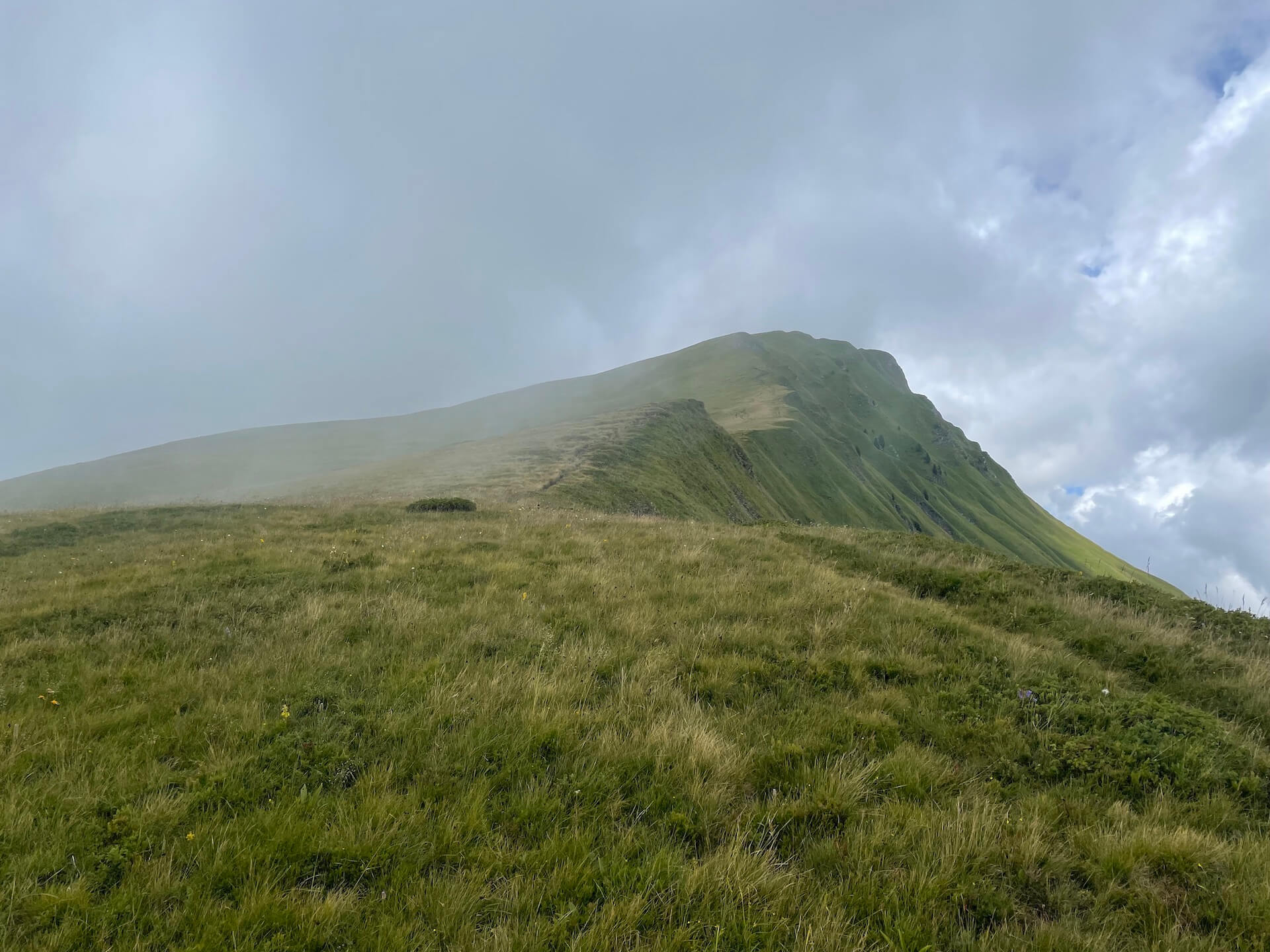 Continue along the sloping path in the pasture, which becomes rolling and then steep again. Further on, you reach the small pass via a somewhat steep climb before the final ascent to the summit.