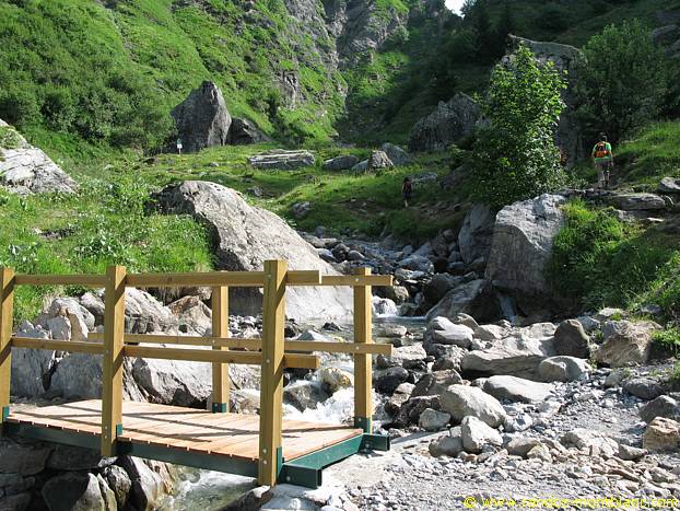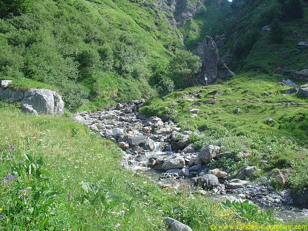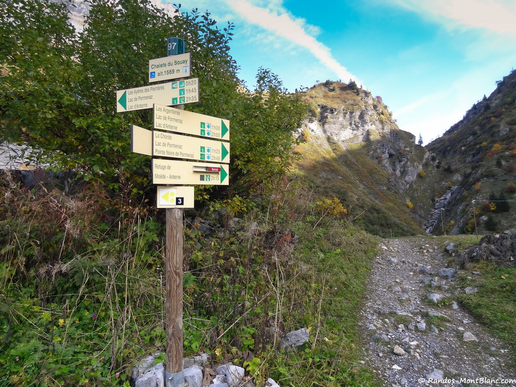 Once arrived at the Chalets du Souay, take the path going towards the torrent as mentioned by the signpost “Lac de Pormenaz: Sentier à risques. ” this pathway arrives a few meters below at a footbridge which crosses the Torrent de Souay and goes up on a path that rises more frankly in the grassy slope of the Argentières.