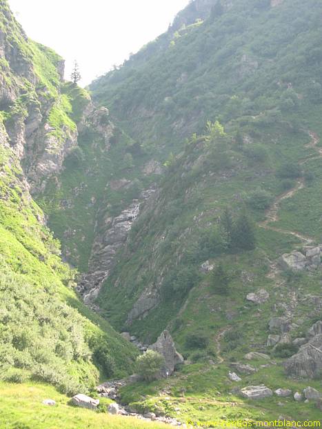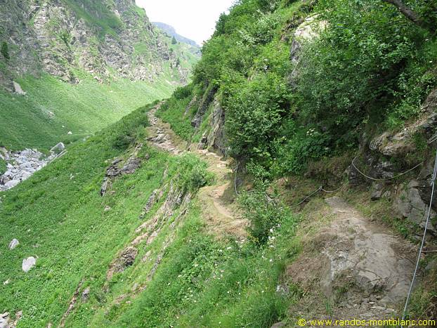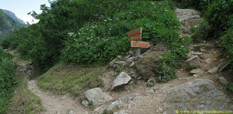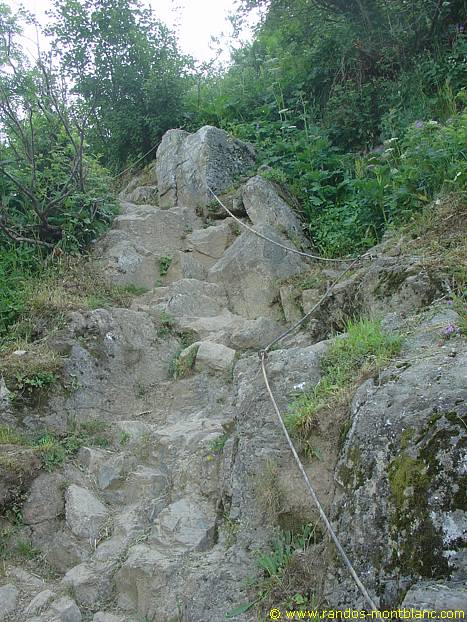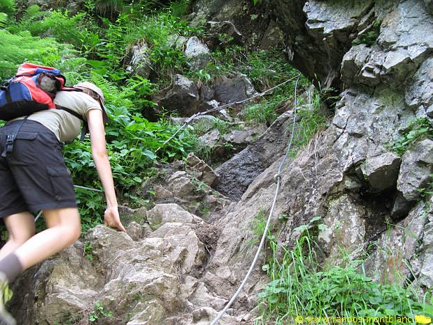 A few switchbacks later and a small passage equipped with a rope, you have to fork to the right and enter the forest in the direction of “La Chorde.” The track rises more steeply than the pathway of the Argentières.