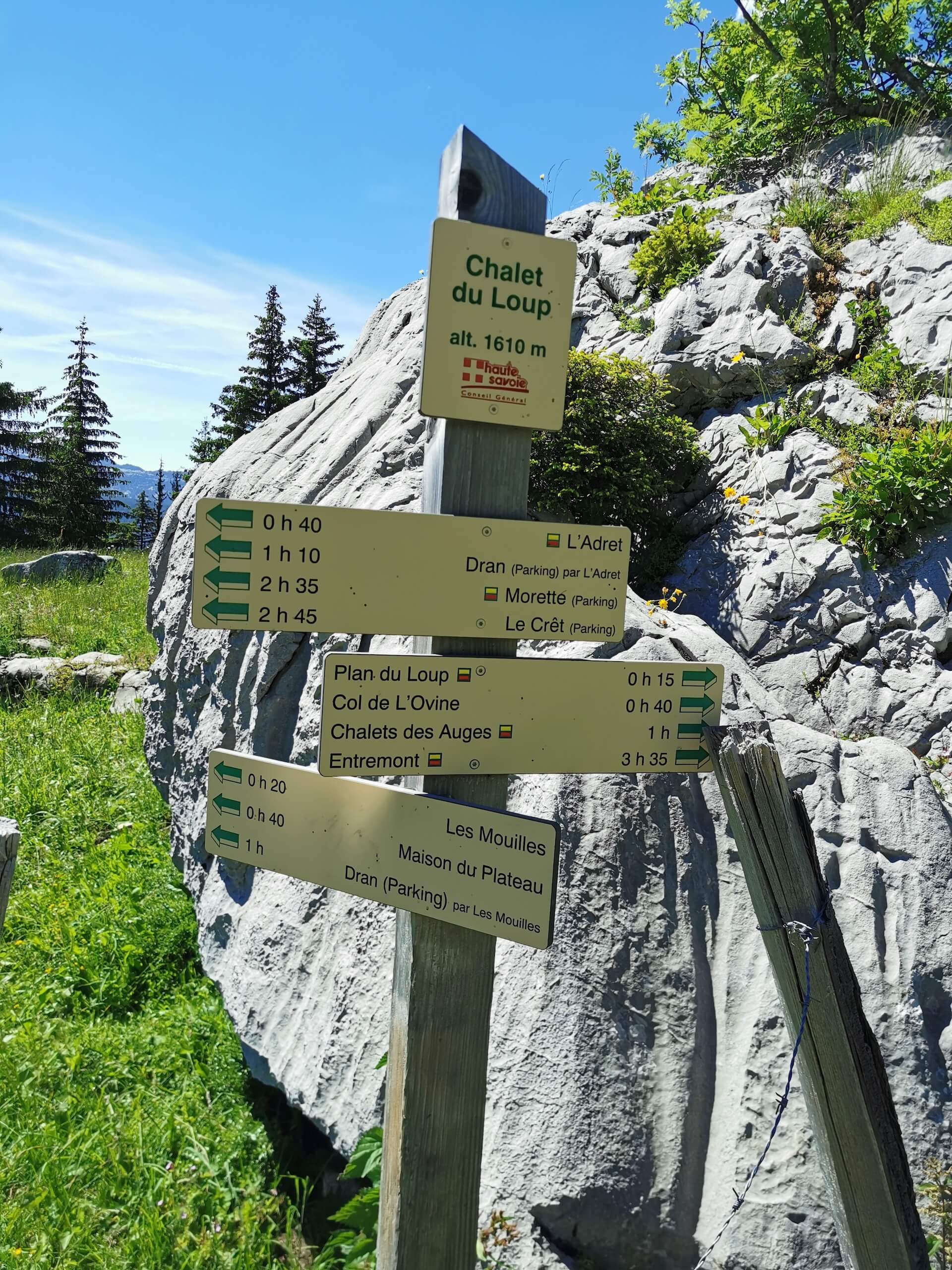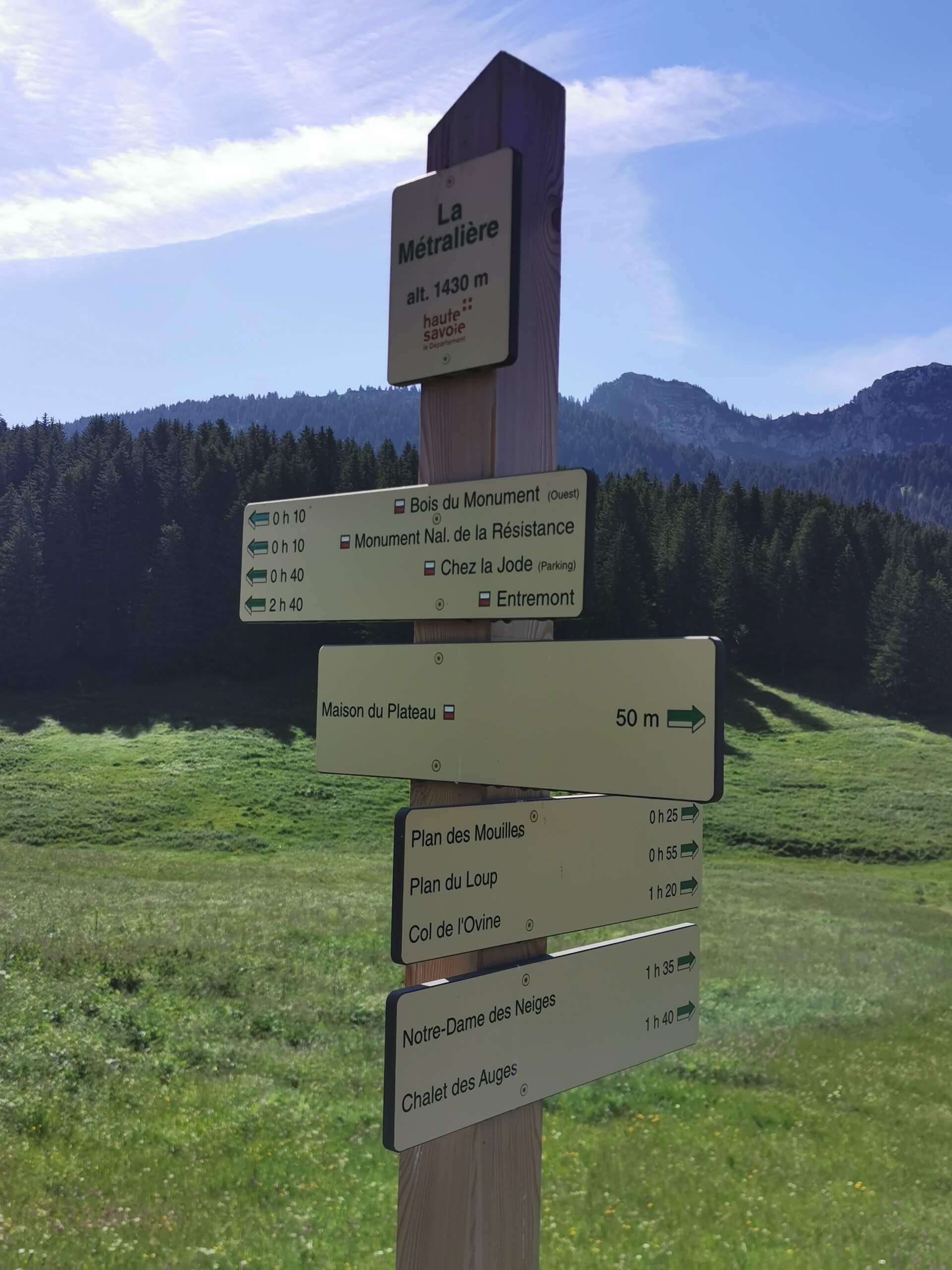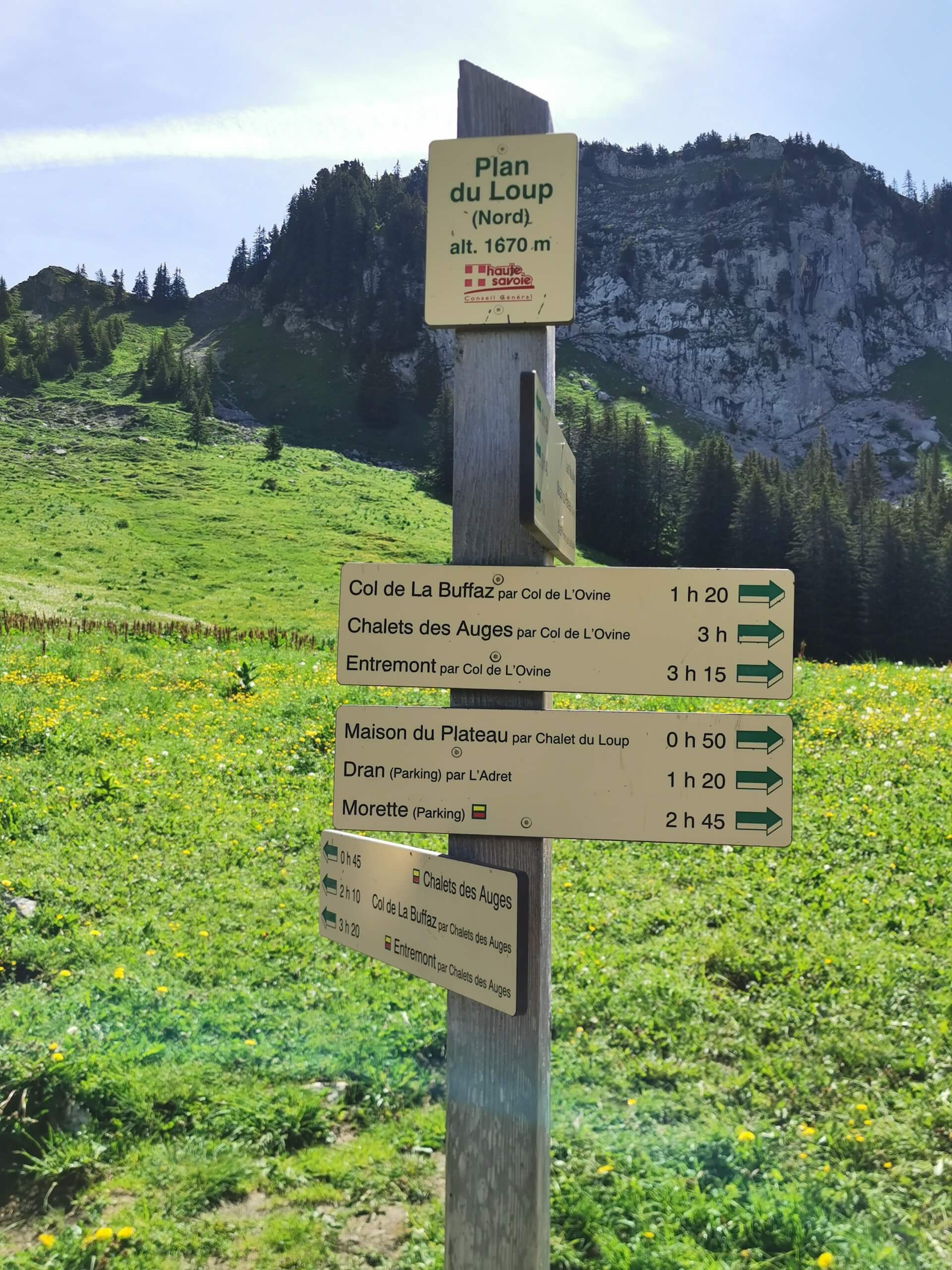 From the car park, go down and reach the memorial by the path. Turn right and follow the track until you see a sign for the “Col de L’Ovine”. The path climbs through the forest until it reaches the Plan des Mouilles. From there, the progression is marked by wooden footbridges installed in order to avoid as much as possible the very wet and sometimes muddy ground. After several minutes of walking, the Plan du Loup is reached fairly quickly and you end up in a large meadow at the foot of the cliffs. Then take the direction “Col de la Buffaz par le Col de l’Ovine”, and, a few metres further on, take the direction “Col de L’Ovine” as indicated on the following sign. Be careful to notice the direction for the return path which will be via the “Maison du plateau par Chalet du Loup”.