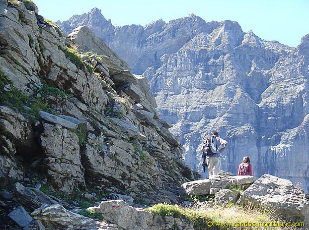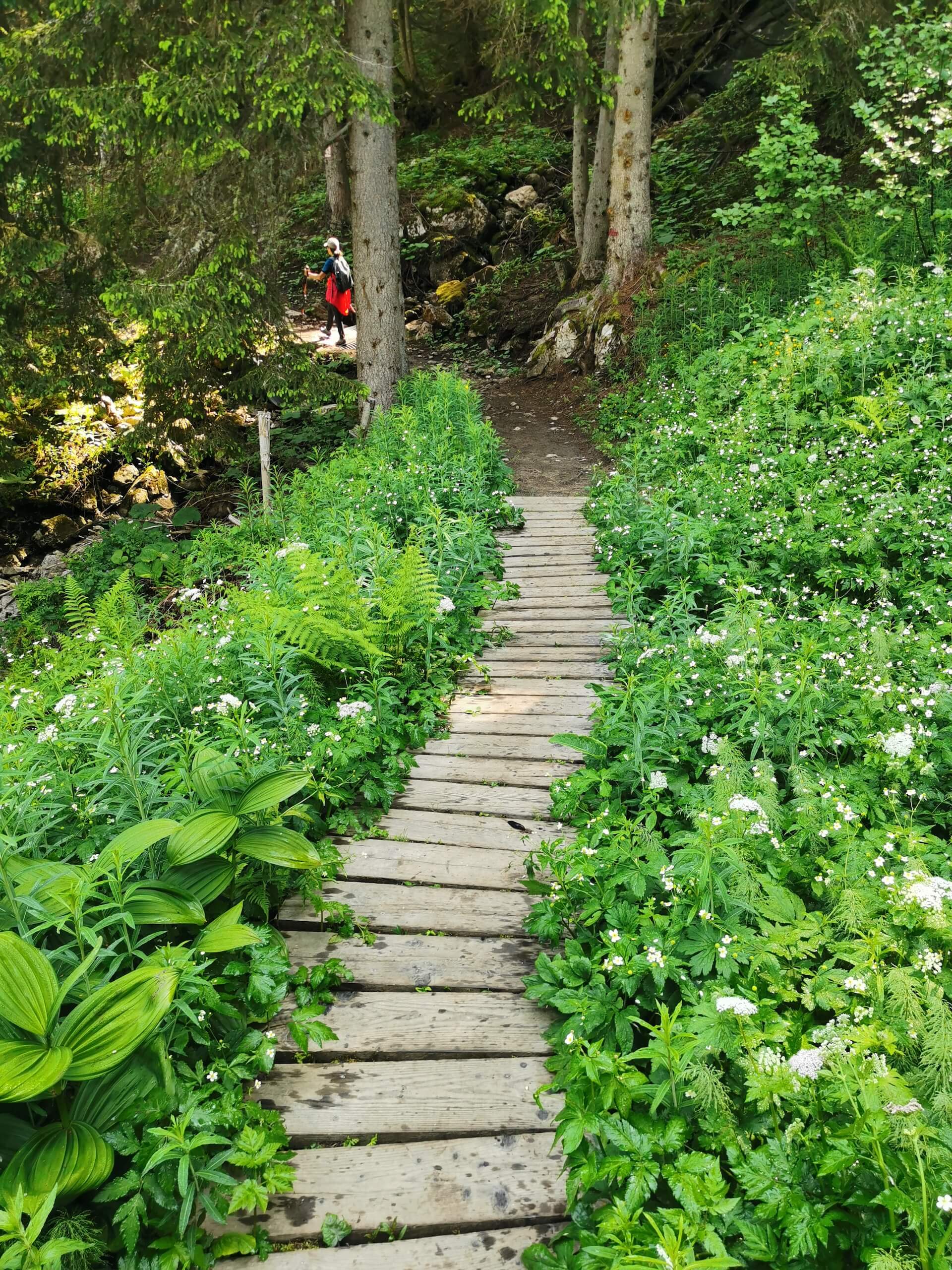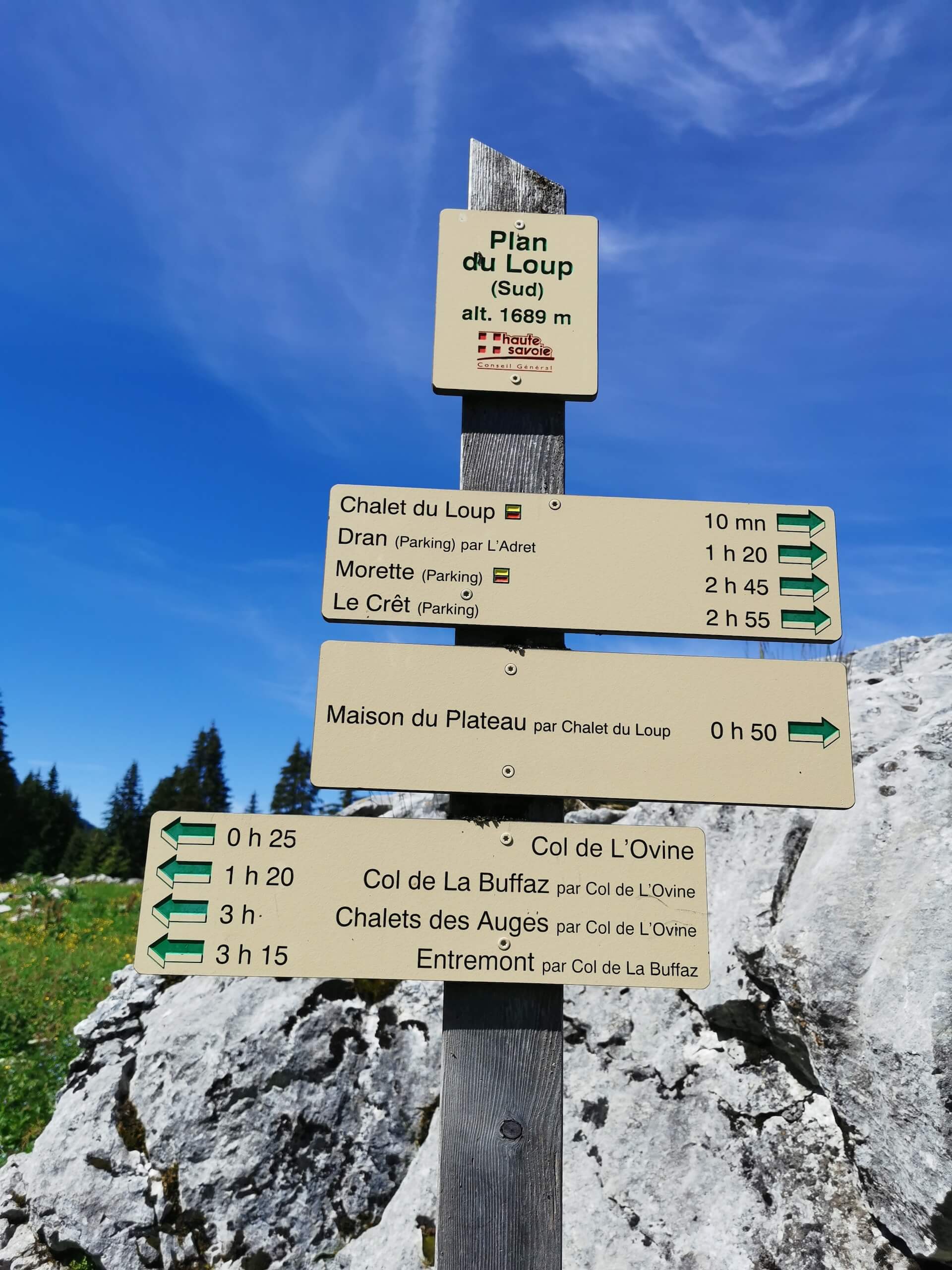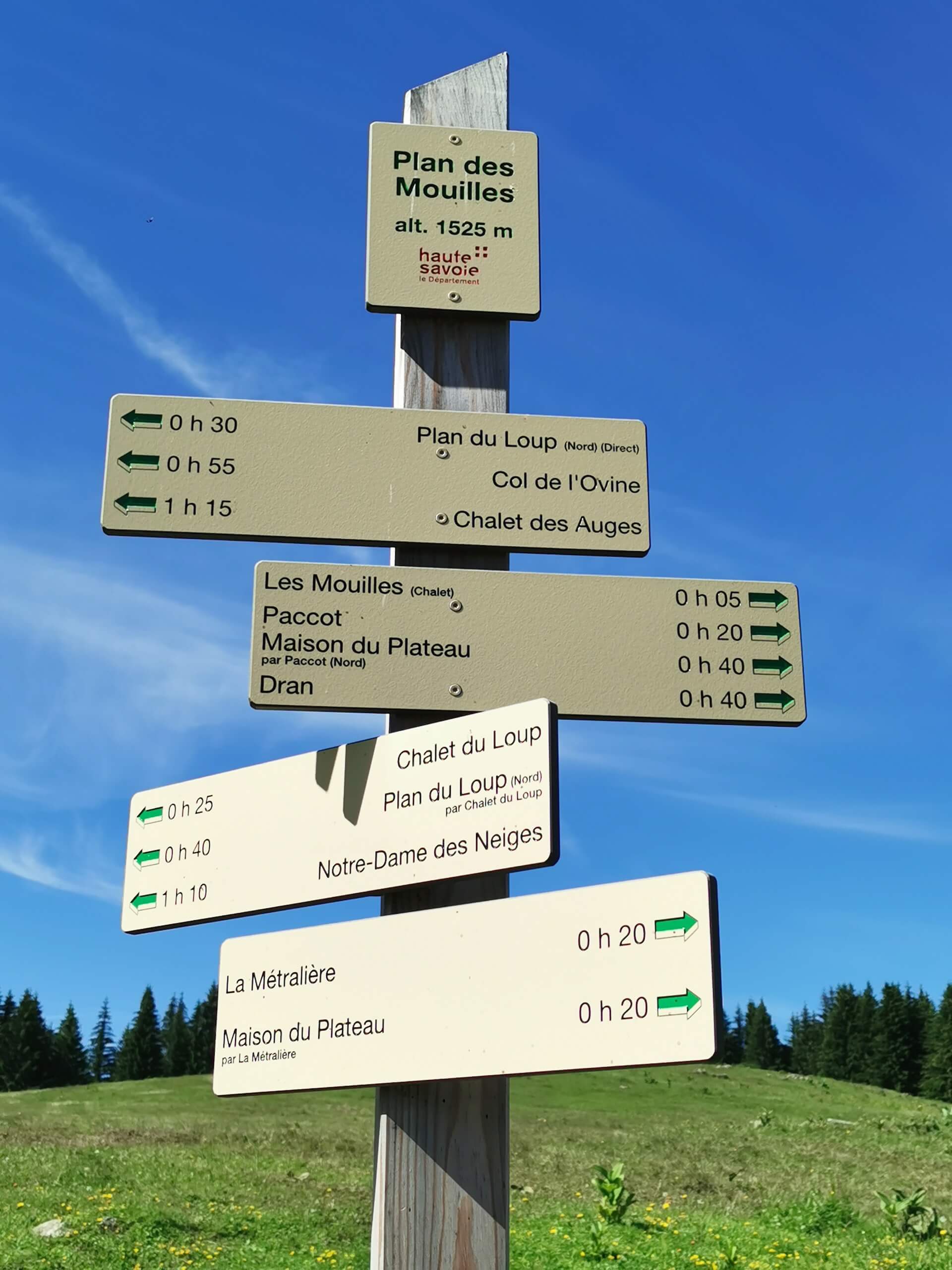 From the car park, go down and reach the memorial by the path. Turn right and follow the track until you see a sign for the “Col de L’Ovine”. The path climbs through the forest until it reaches the Plan des Mouilles. From there, the progression is marked by wooden footbridges installed in order to avoid as much as possible the very wet and sometimes muddy ground. After several minutes of walking, the Plan du Loup is reached fairly quickly and you end up in a large meadow at the foot of the cliffs. Then take the direction “Col de la Buffaz par le Col de l’Ovine”, and, a few metres further on, take the direction “Col de L’Ovine” as indicated on the following sign. Be careful to notice the direction for the return path which will be via the “Maison du plateau par Chalet du Loup”.