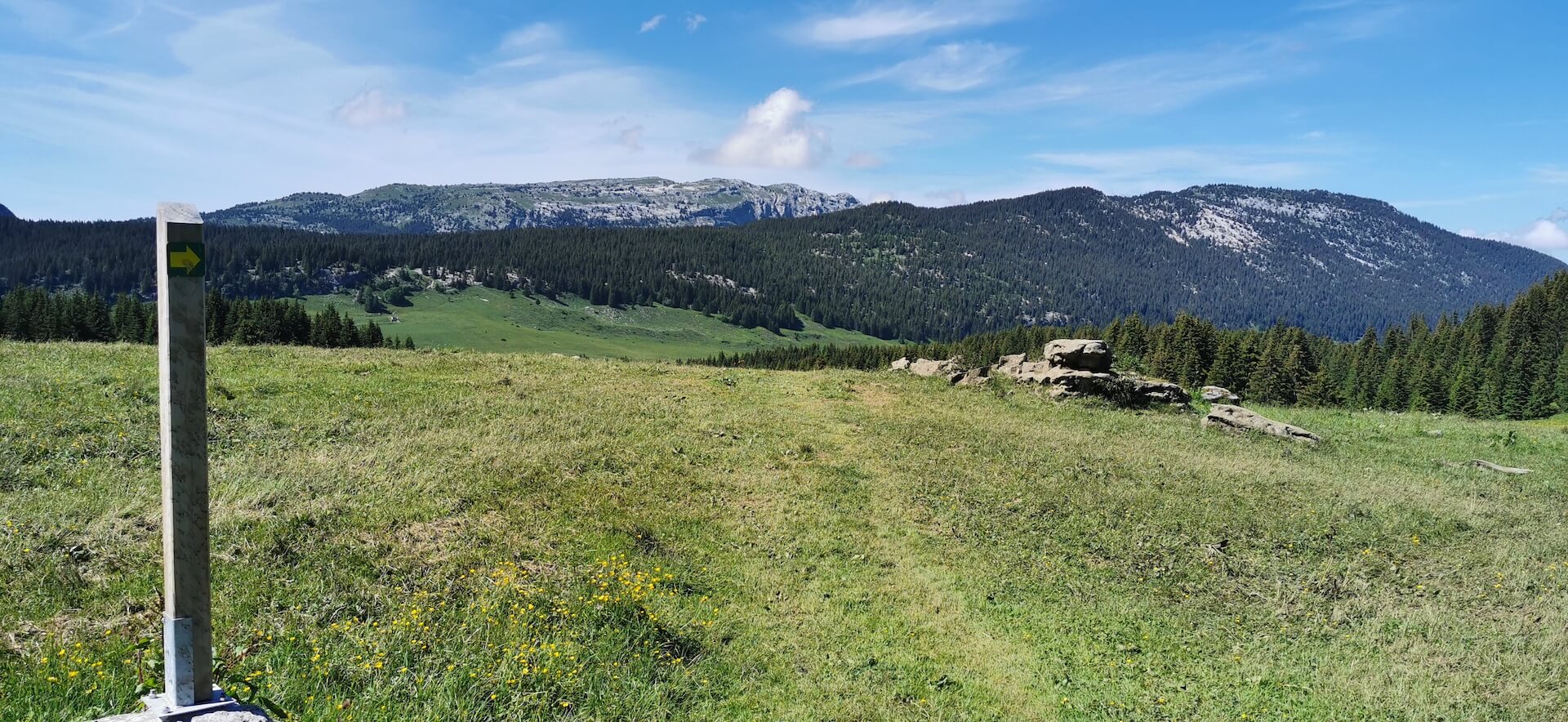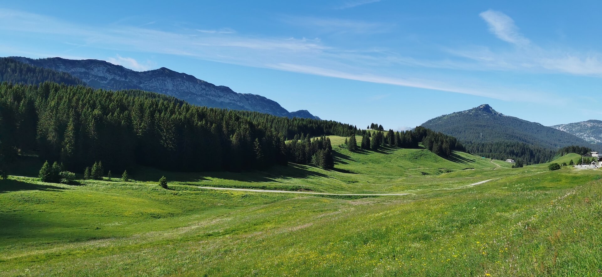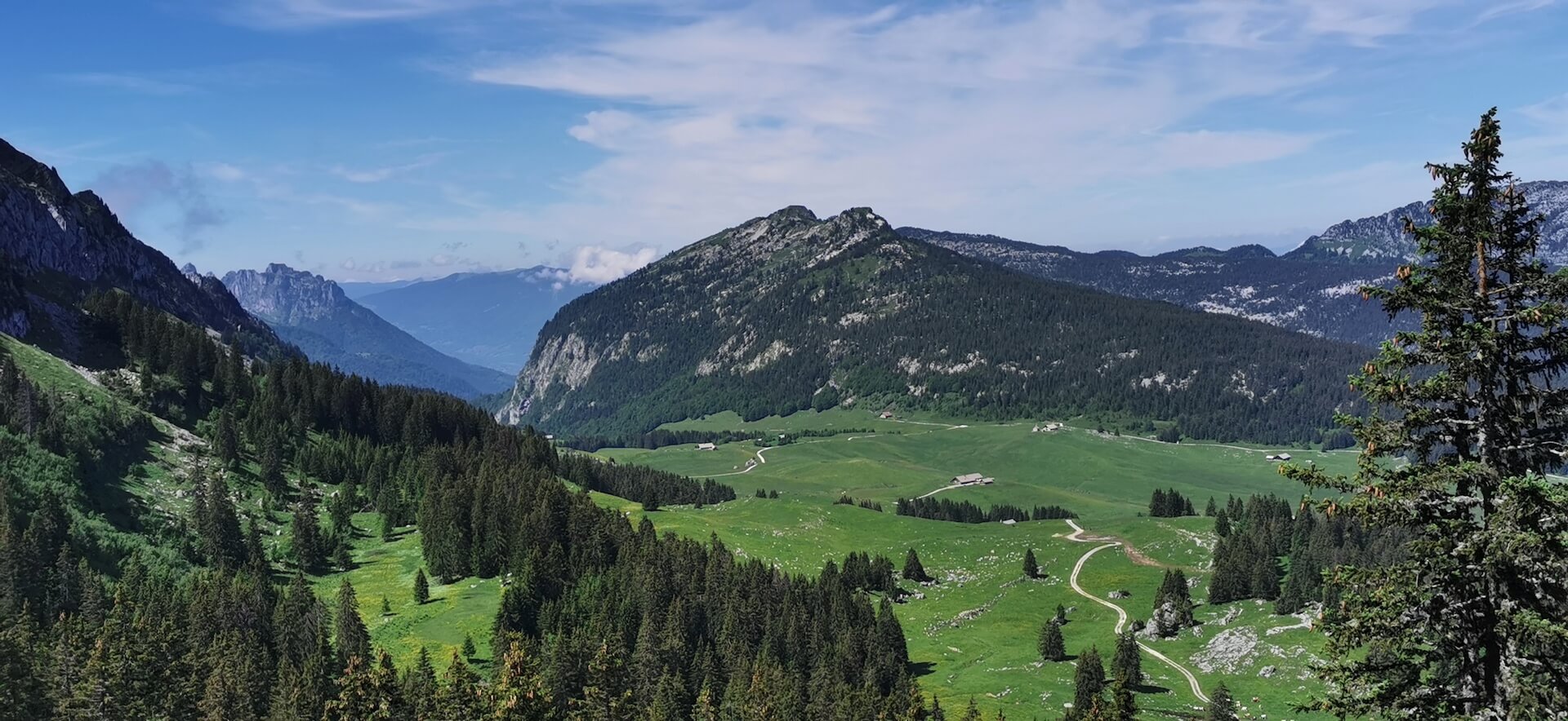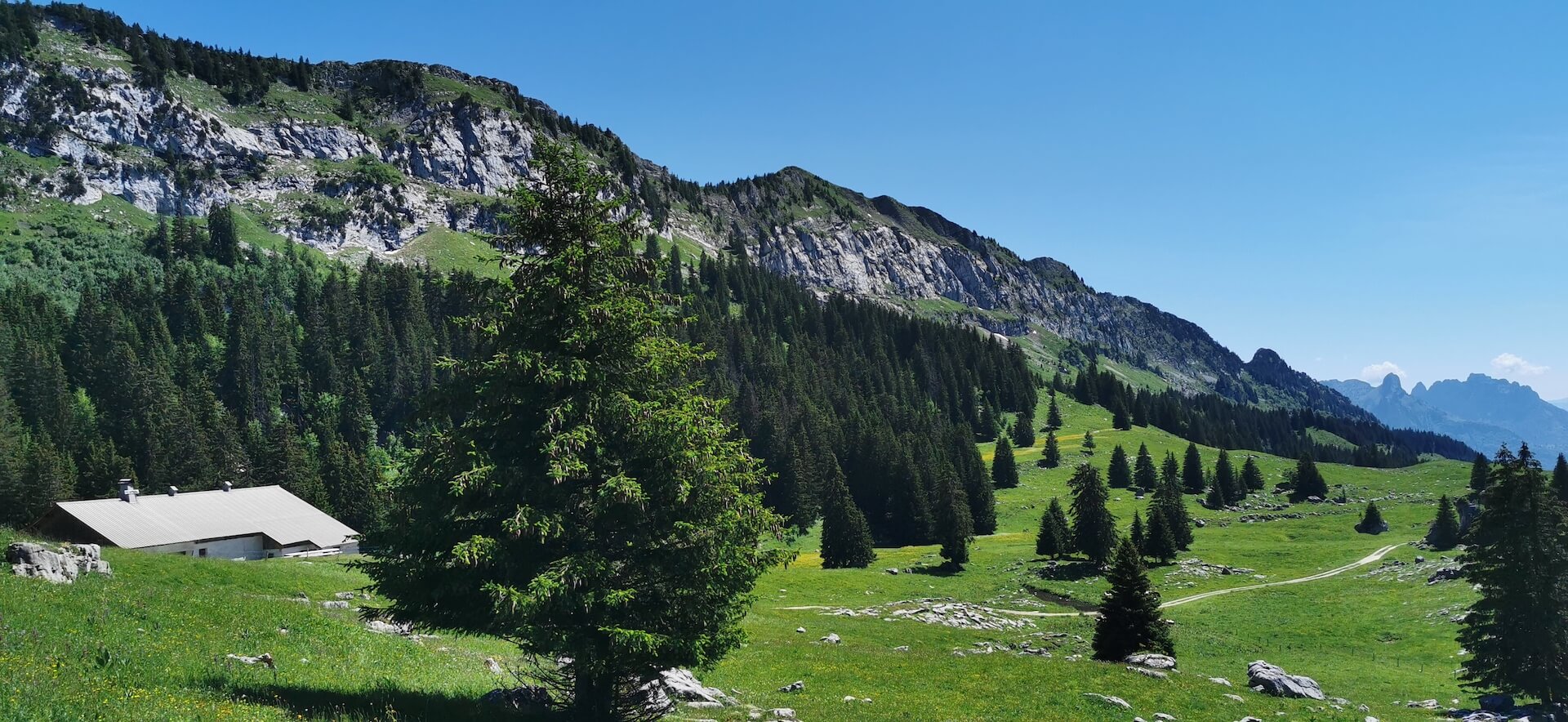 Take the path back to the Col de l’Ovine and then the Plan du Loup where you have to branch off to follow the direction of the “Maison du plateau par le Chalet du Loup”. Although slightly longer, I found this variant more pleasant on the descent. Once you reach the Chalet du Loup, continue towards the “Maison du plateau” by taking the path in the grass towards the fence and the fir trees, leaving the track on the left.