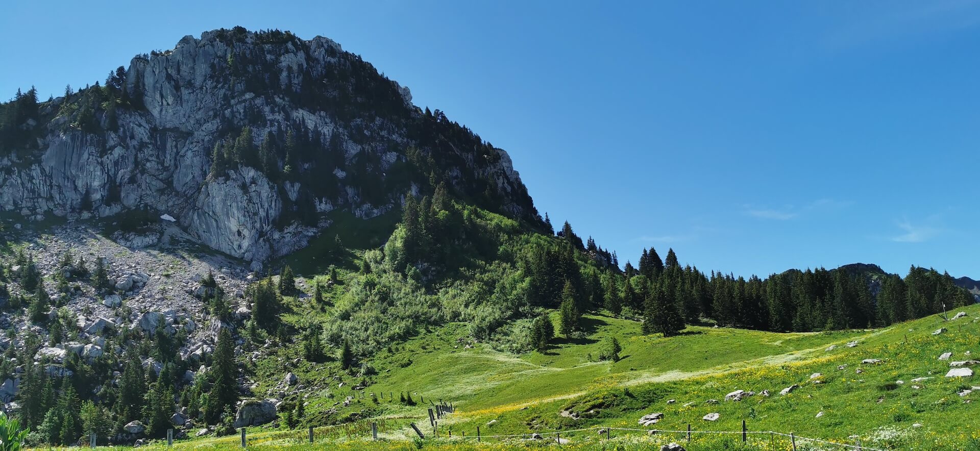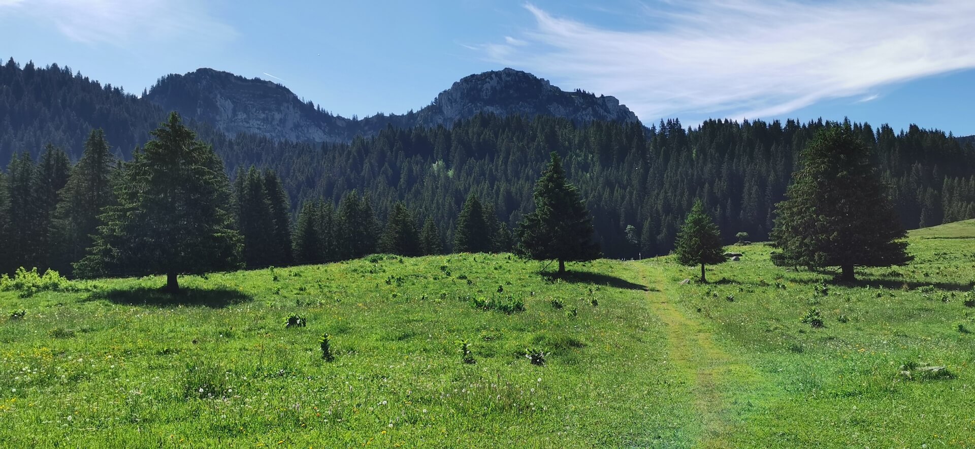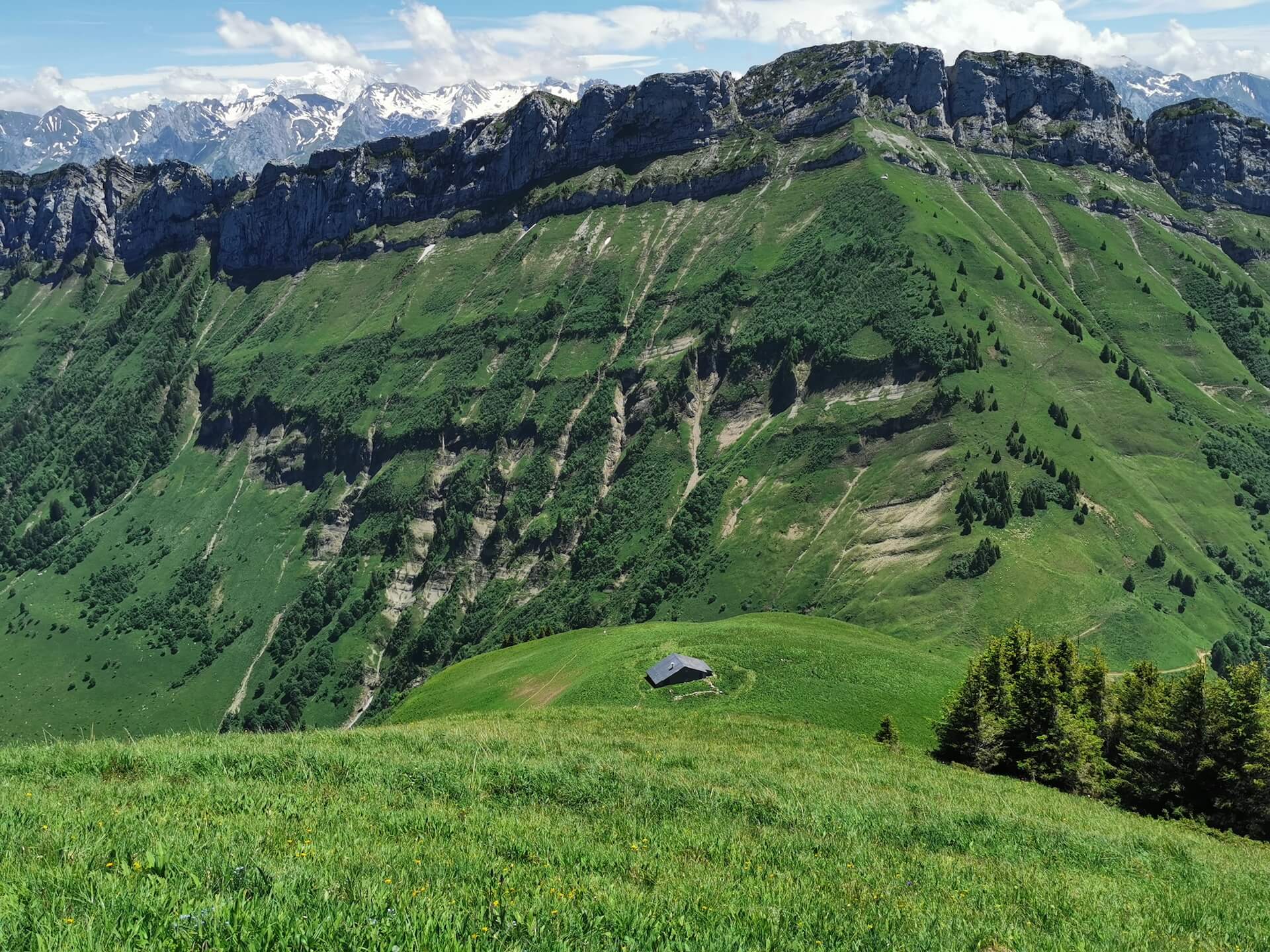 Take the path back to the Col de l’Ovine and then the Plan du Loup where you have to branch off to follow the direction of the “Maison du plateau par le Chalet du Loup”. Although slightly longer, I found this variant more pleasant on the descent. Once you reach the Chalet du Loup, continue towards the “Maison du plateau” by taking the path in the grass towards the fence and the fir trees, leaving the track on the left.
