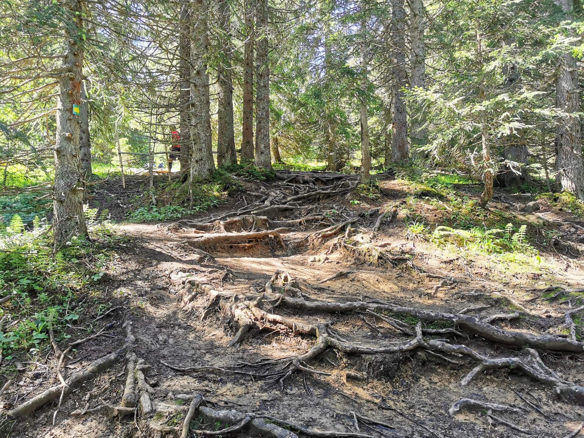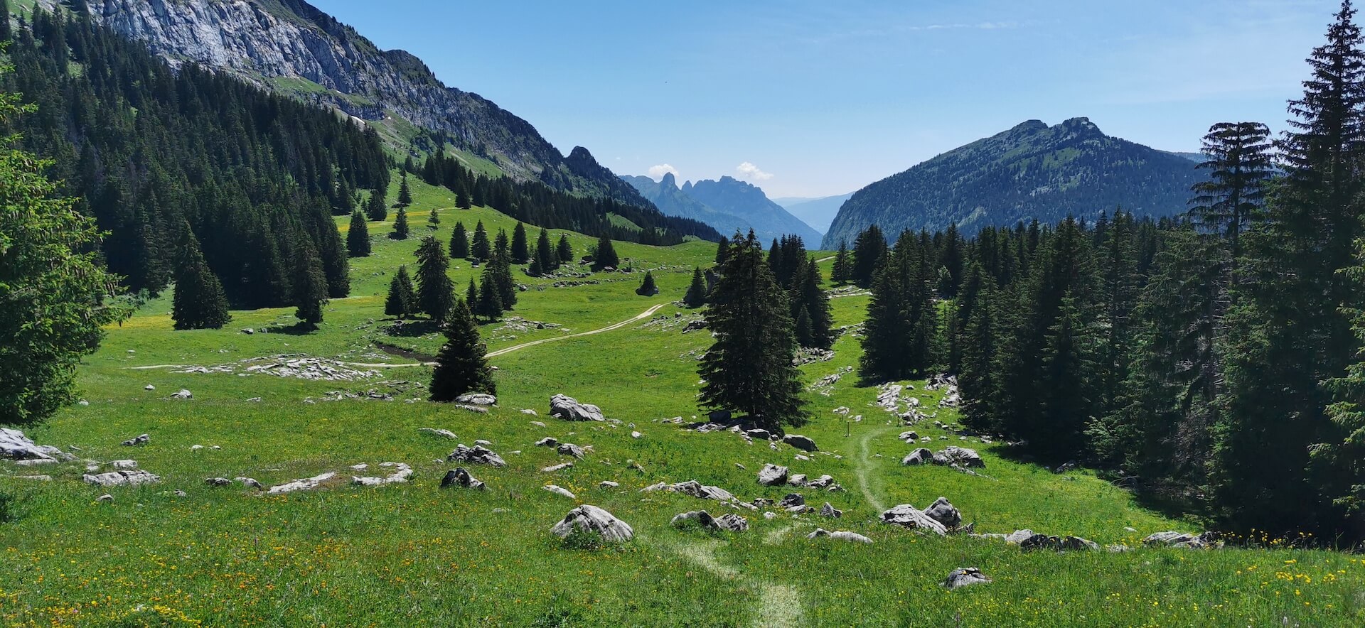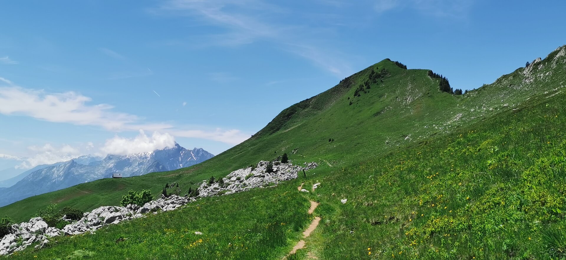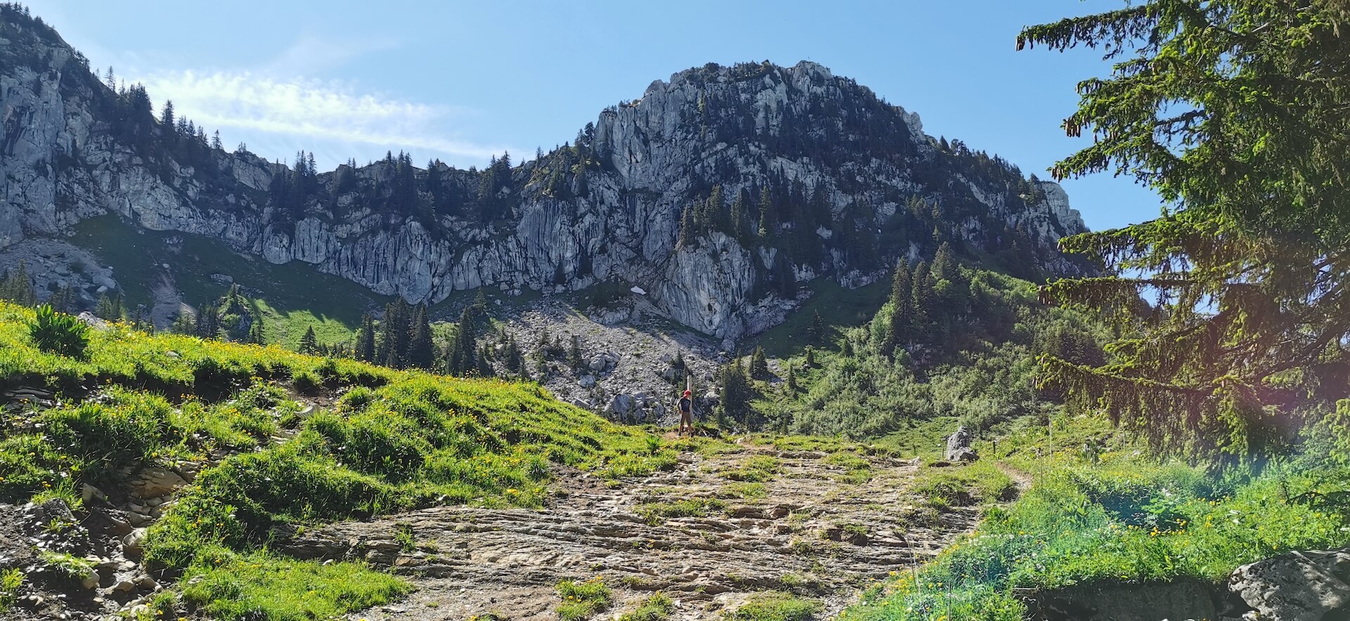 Take the path back to the Col de l’Ovine and then the Plan du Loup where you have to branch off to follow the direction of the “Maison du plateau par le Chalet du Loup”. Although slightly longer, I found this variant more pleasant on the descent. Once you reach the Chalet du Loup, continue towards the “Maison du plateau” by taking the path in the grass towards the fence and the fir trees, leaving the track on the left.