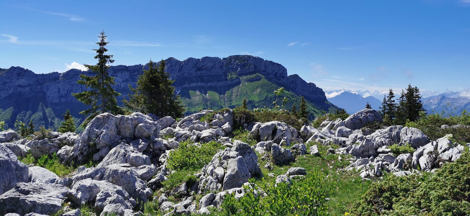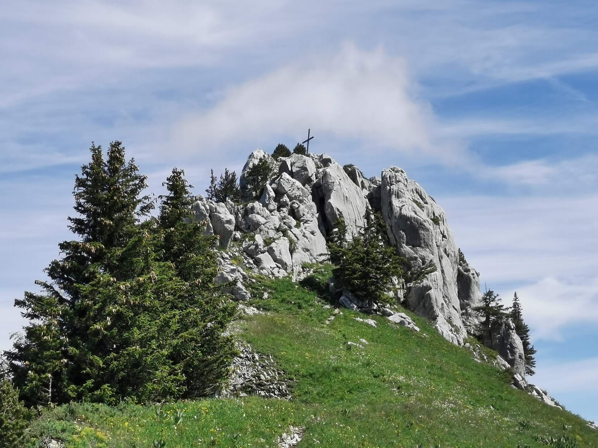 The path becomes narrower and follows the cliff until a short passage of rocks quite steep. Once you reach the Col de l’Ovine, follow the direction of Pointe de Puvat to the left. You will soon reach a lapiaz flat with a magnificent view of the Aravis. Continue towards Pointe de Puvat and its visible cross. A steep path leads to the base of the summit, which the more adventurous can climb (note that it is forbidden to fall).