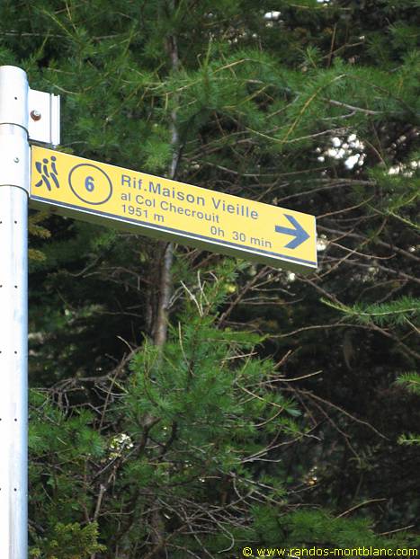 Depuis le Refuge du Mont Blanc, emprunter l’abrupt sentier faisant office de piste de ski l’hiver panneauté « Rifugio Maison Vieille » et « Lago Chécrouit ». Ce passage de très courte durée constitue véritablement l’unique difficulté du parcours.