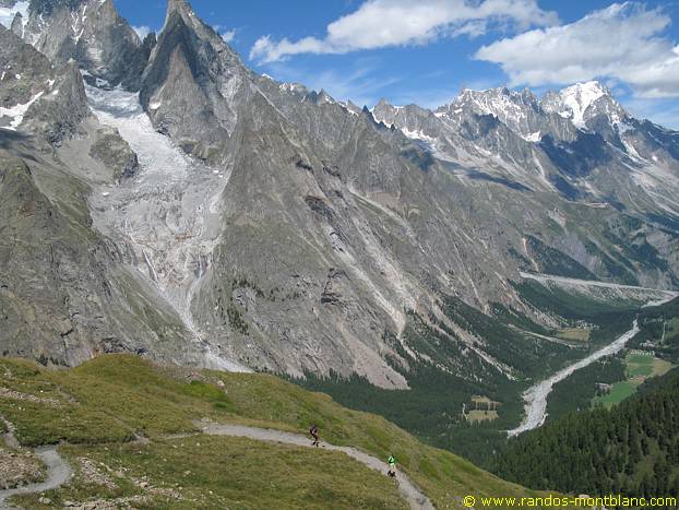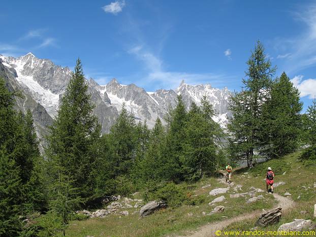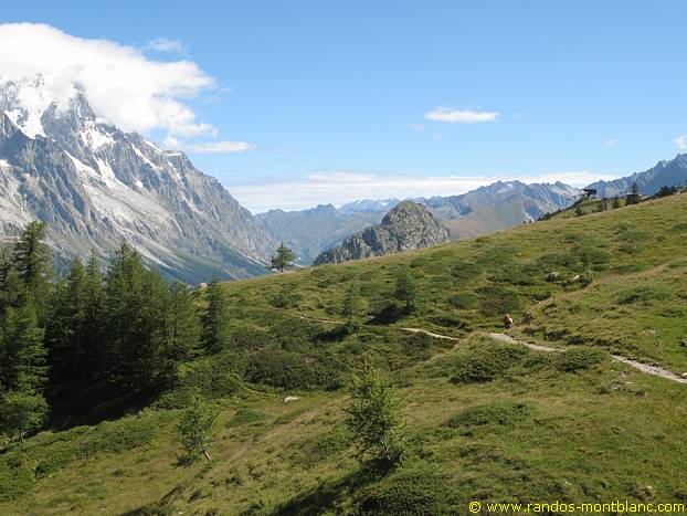 Facile et sans aucune difficulté, la rando enivrera sans doute le randonneur par la scène sur les glaciers de la Lex Blanche, de Miage et de la Brenva, ainsi que l’imposante Aiguille Noire de Peuterey, l’Aiguille de la Brenva et l’Aiguille de Tré-la-Tête, qui lui donnera surement envie de conquérir de plus hauts sommets.