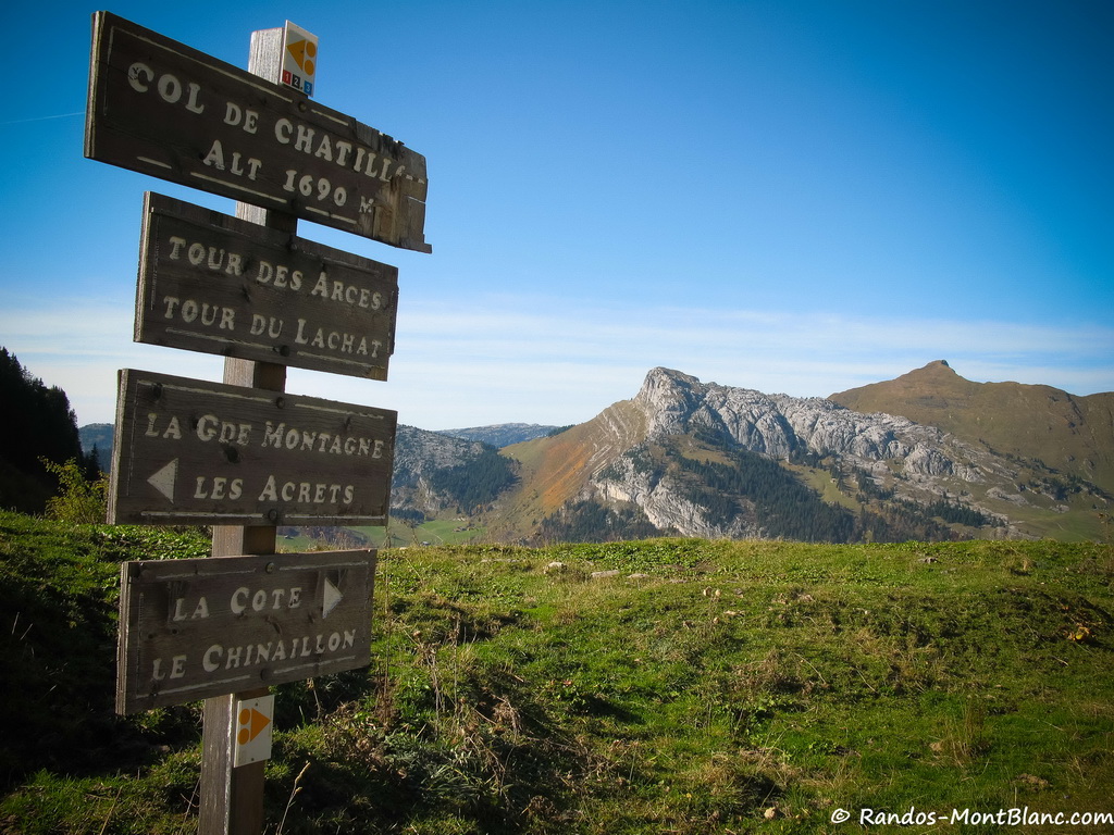 Depuis le parking, suivre la piste carrossable longeant le téléski du Col de Châtillon. Peu après, le sentier, bien balisé, bifurque à gauche et vient s’enfoncer dans les bois. À une intersection, délaisser la sente de gauche descendant vers la ferme. Rapidement, le chemin quitte la forêt et serpente dans la plaine jusqu’au Col de Châtillon où l’on appréciera la vue sur les combes des Aravis. De là, laisser à droite le chemin redescendant vers le Chalet de Châtillon et continuer la raide piste montant en direction du Mont Lachat atteint en une trentaine de minutes.