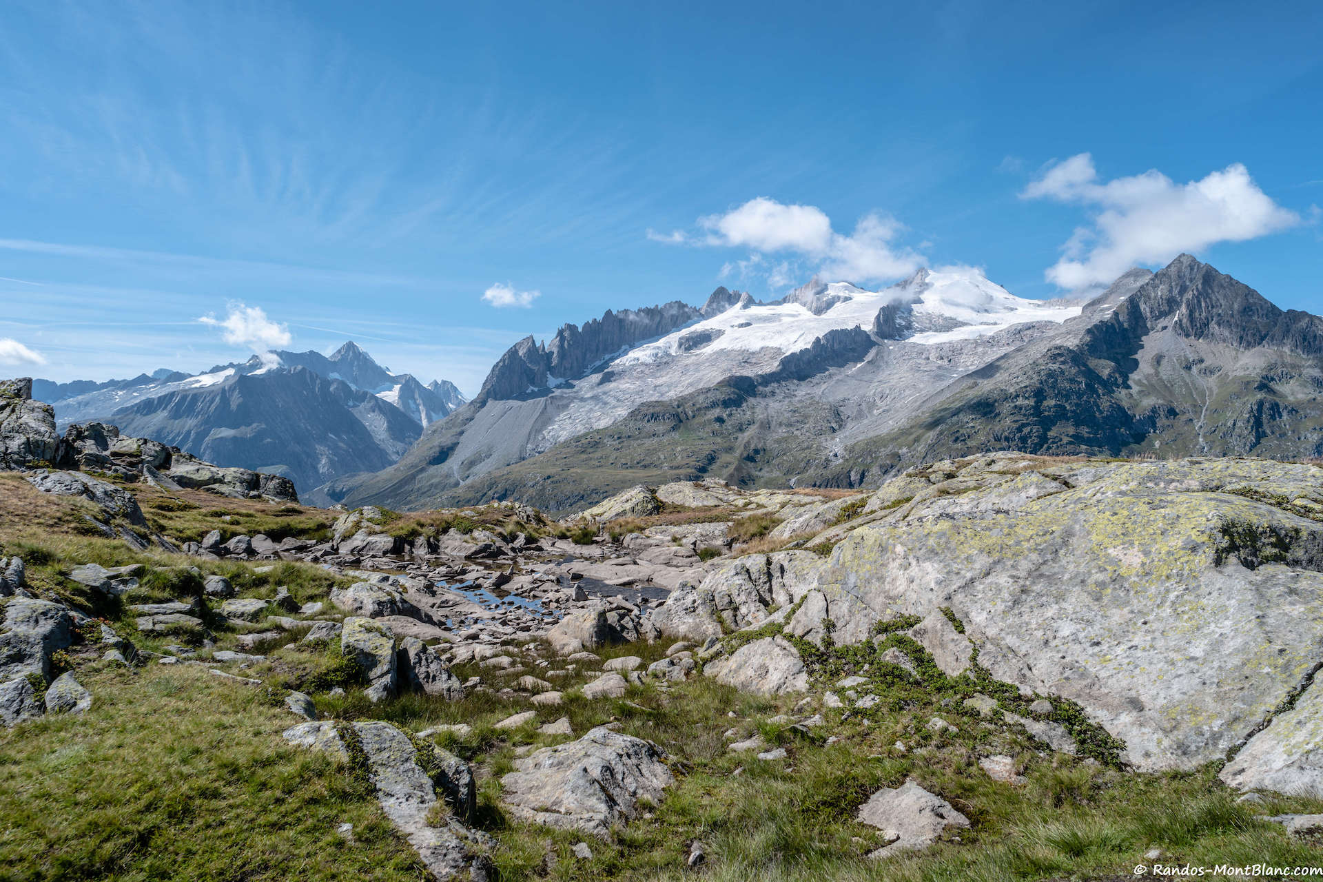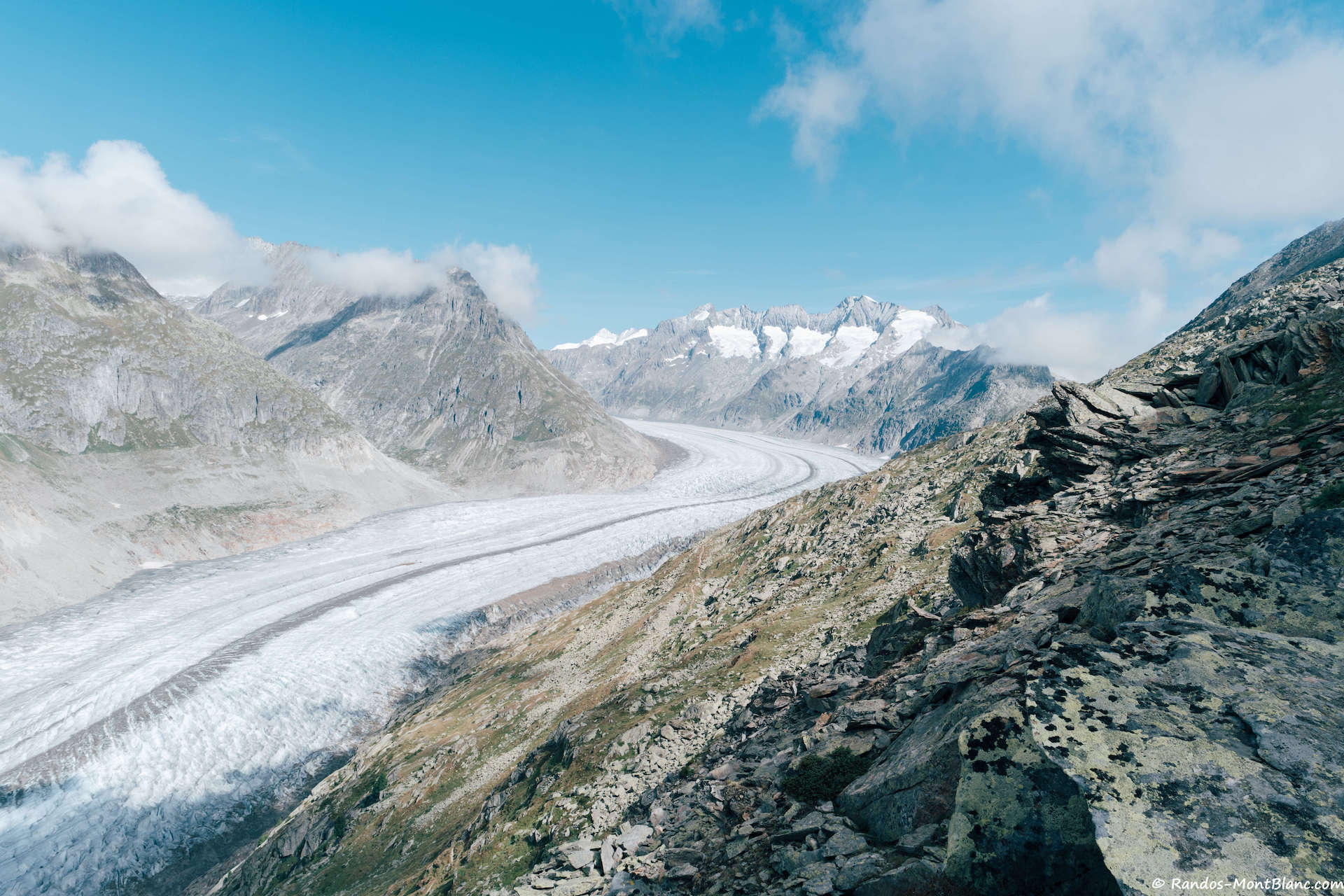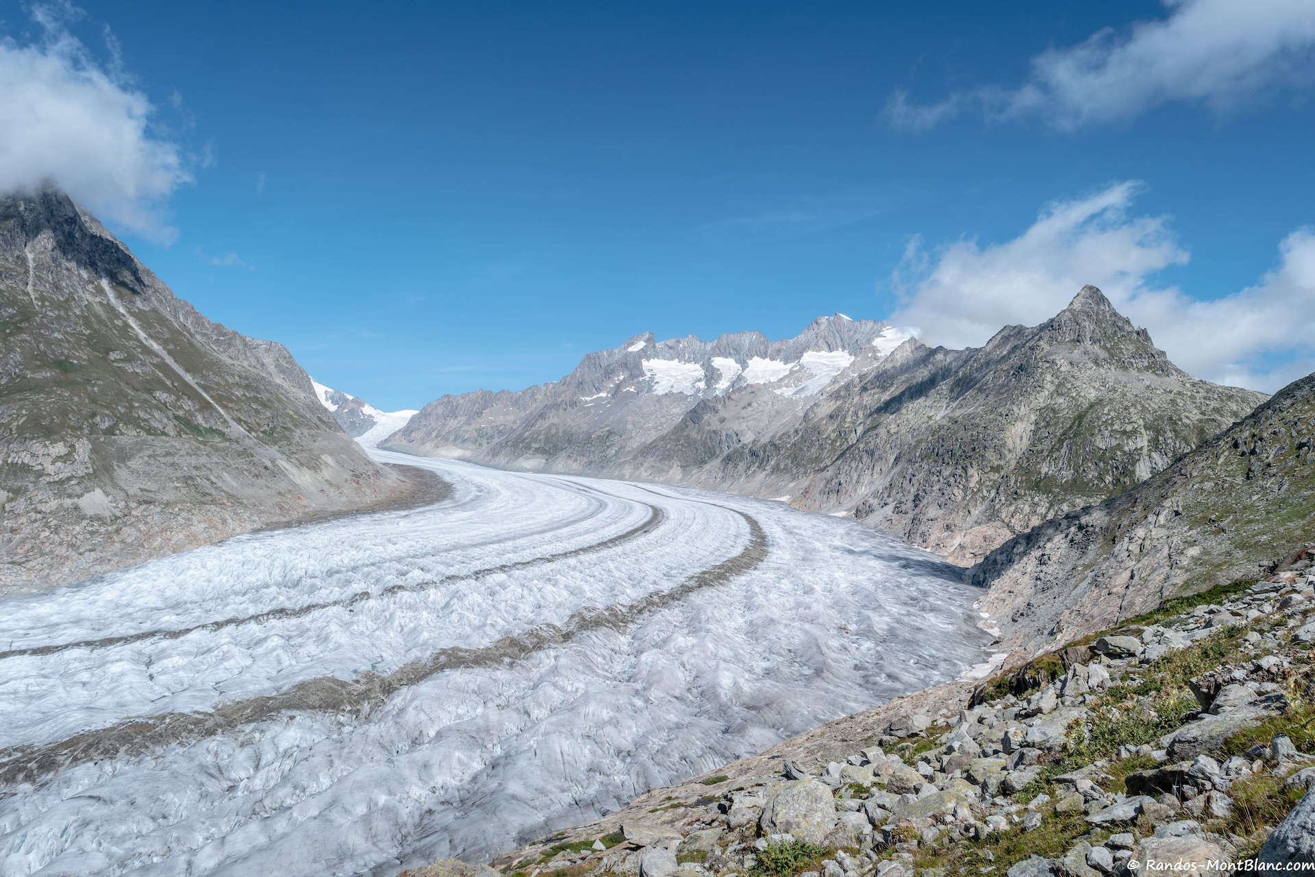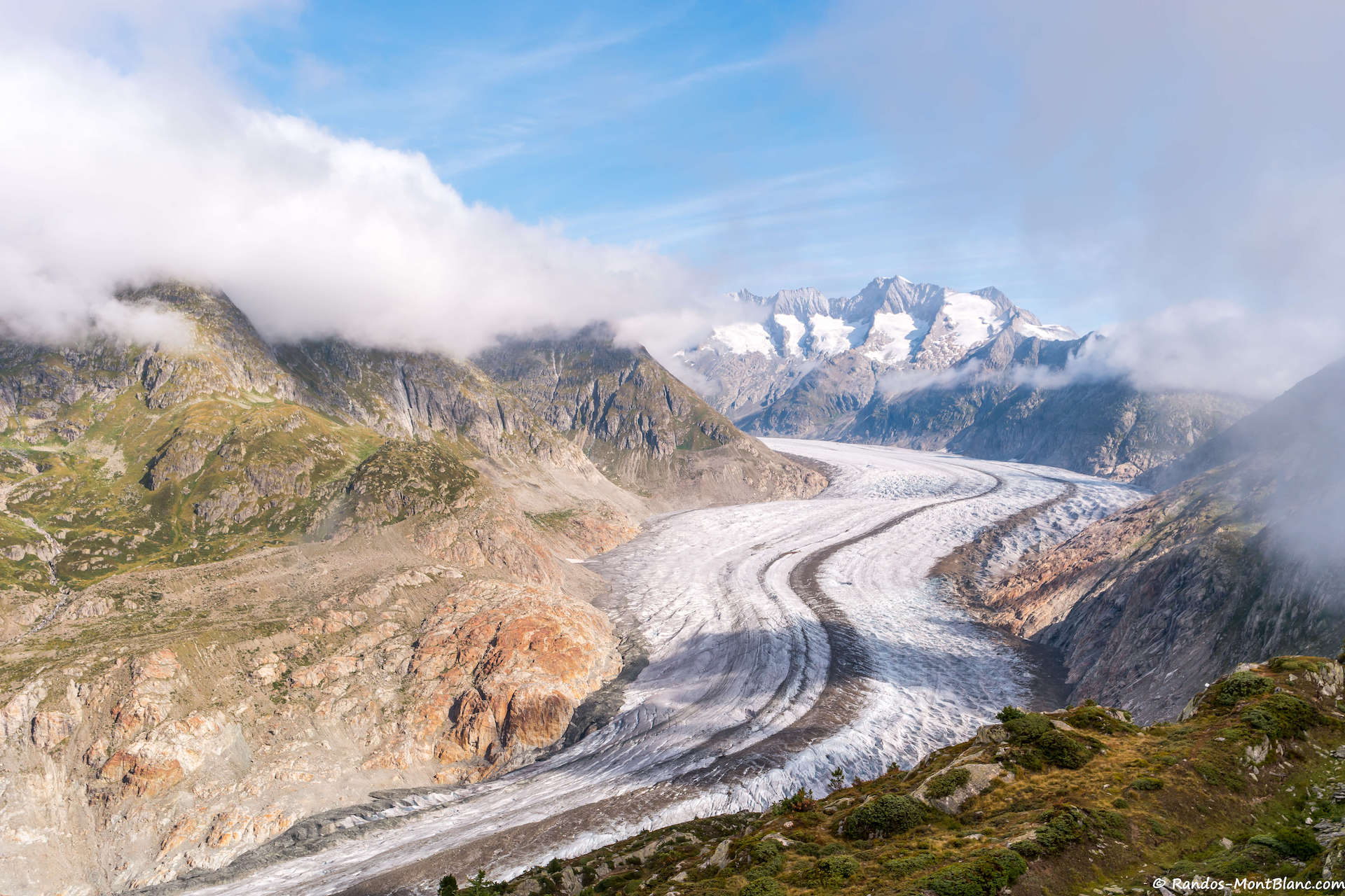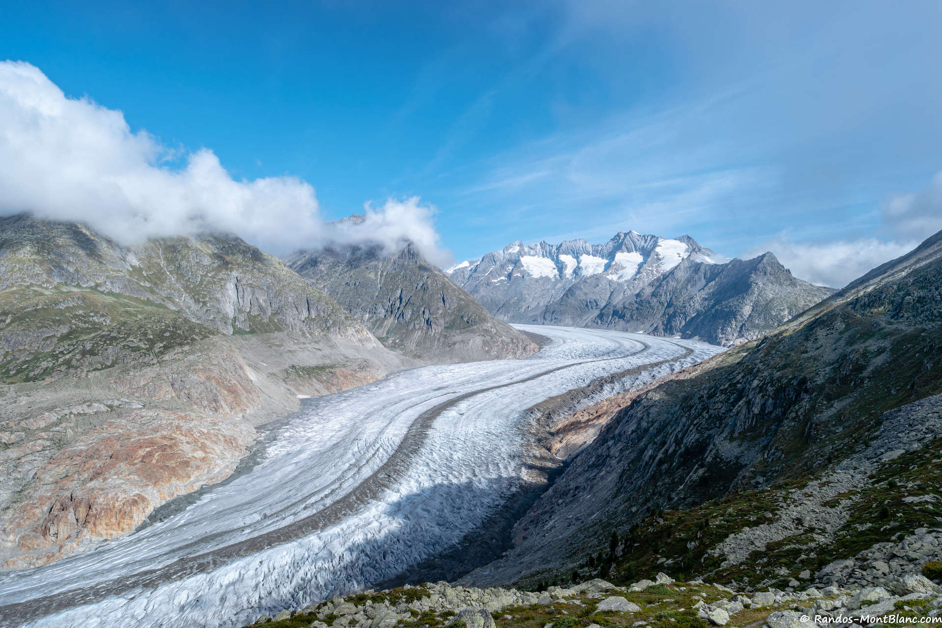 Situé dans le sud de la Suisse, dans le canton du Valais, le glacier d’Aletsch est le plus grand glacier des Alpes. Inscrit en 2001 au patrimoine mondial de l’UNESCO, le glacier d’Aletsch ne laissera pas le randonneur indifférent au vu de ses caractéristiques : 81,7 km2 de surface, 22,6 km de longueur, 900 m de profondeur pour un poids total de 27 milliards de tonnes ! Pour remettre les chiffres en perspective, si toute la glace du glacier venait à fondre, l’eau de fonte en résultant suffirait pour approvisionner chaque habitant de la planète avec un litre d’eau par jour pendant environ six ans.