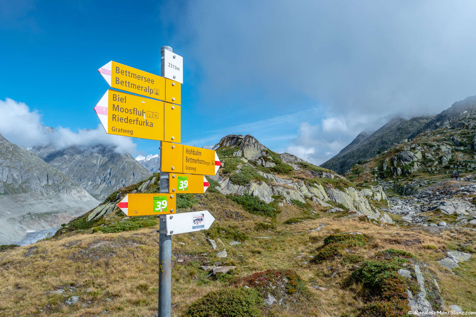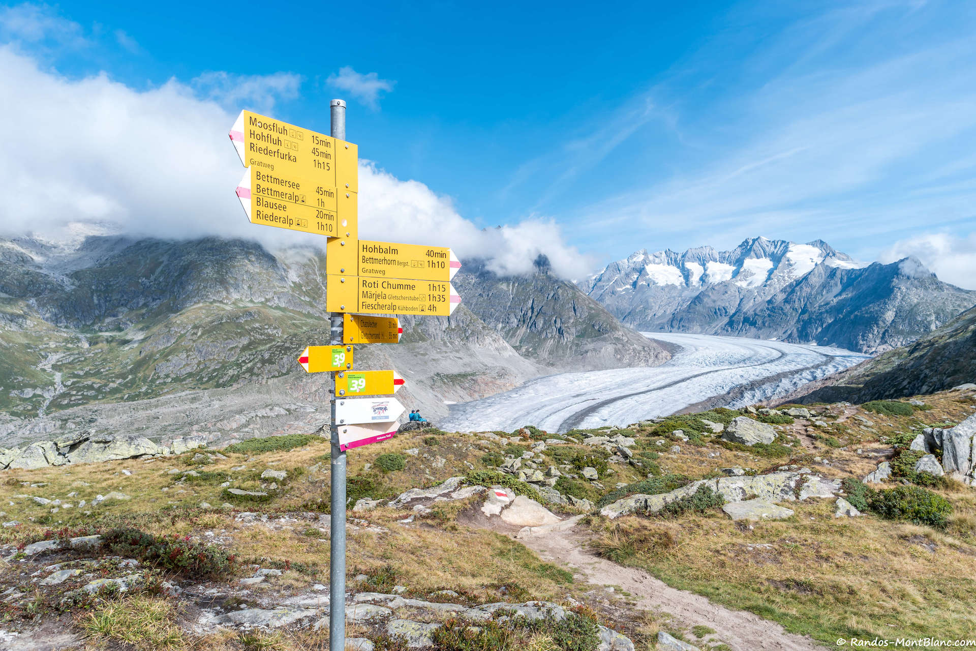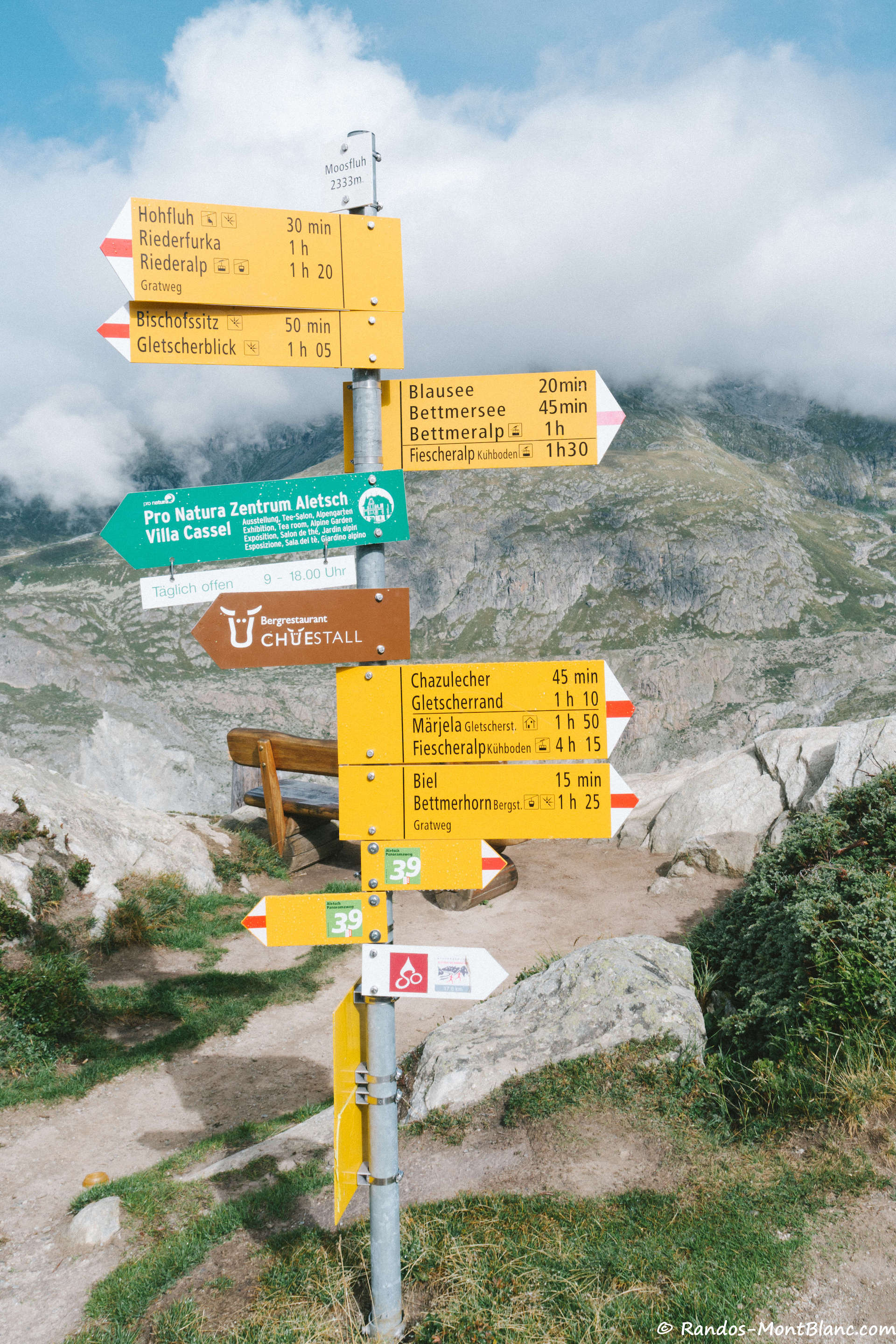 Le parcours que je propose ici emprunte le classique sentier panoramique (Panoramaweg) démarrant à la gare d’arrivée de la télécabine de Moosfluh et allant au Märjelenseen au nord. L’itinéraire pour le moins bucolique ne présente aucune difficulté, si ce n’est peut-être la longueur de celui-ci avec ses 13,6 km aller-retour (d’où sa cotation dans la catégorie « Moyen »). Le Cervin fait partie des nombreux sommets que l’on pourra admirer durant cette sortie. À noter que le sentier passe par Hohbalm, la partie basse du chemin panoramique étant fermé pour des raisons de sécurité. La dernière télécabine reliant Moosfluh au village de Riederalp partant à 16 h 30, il faut bien planifier sa sortie afin de ne pas être pris de court sur le chemin du retour.