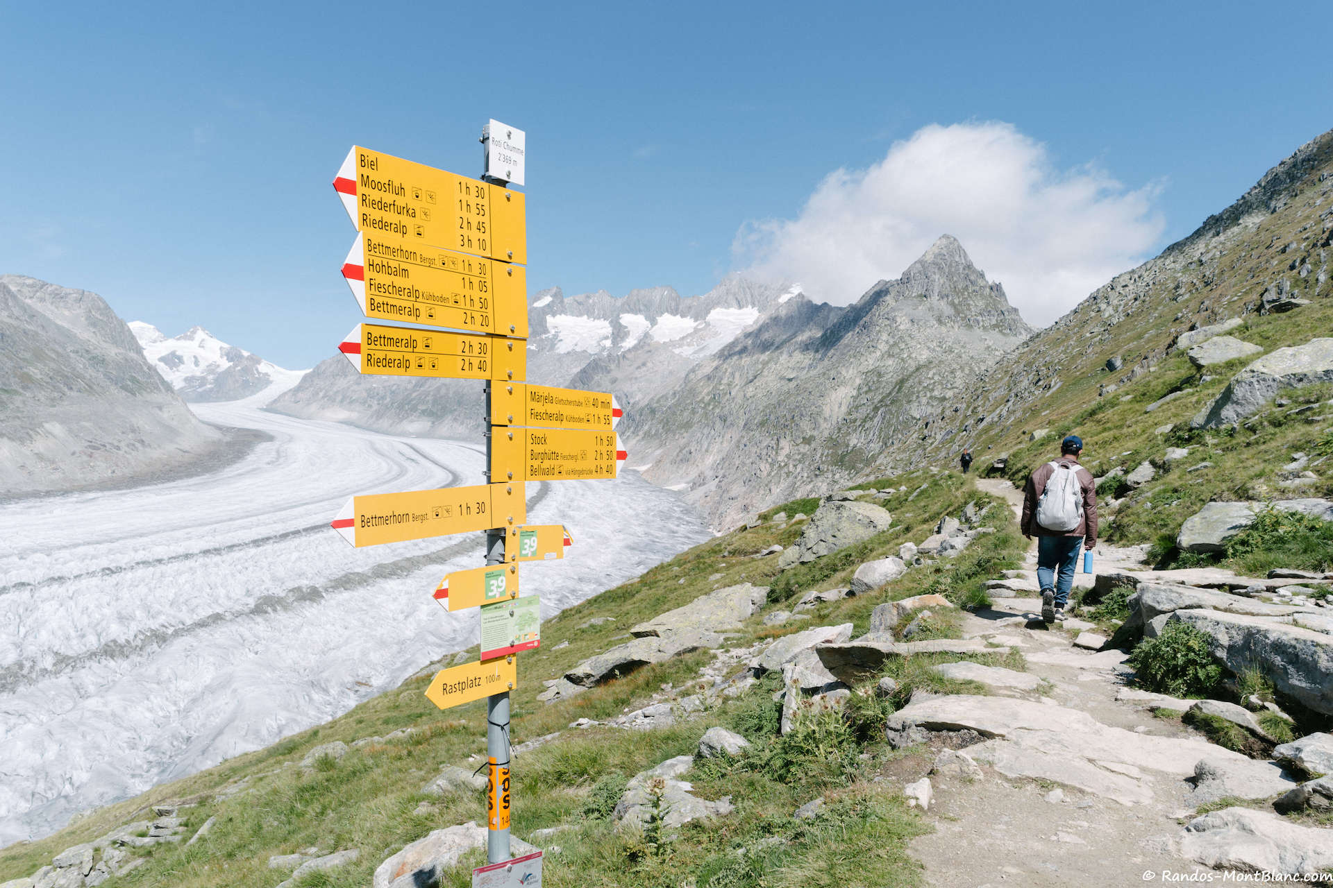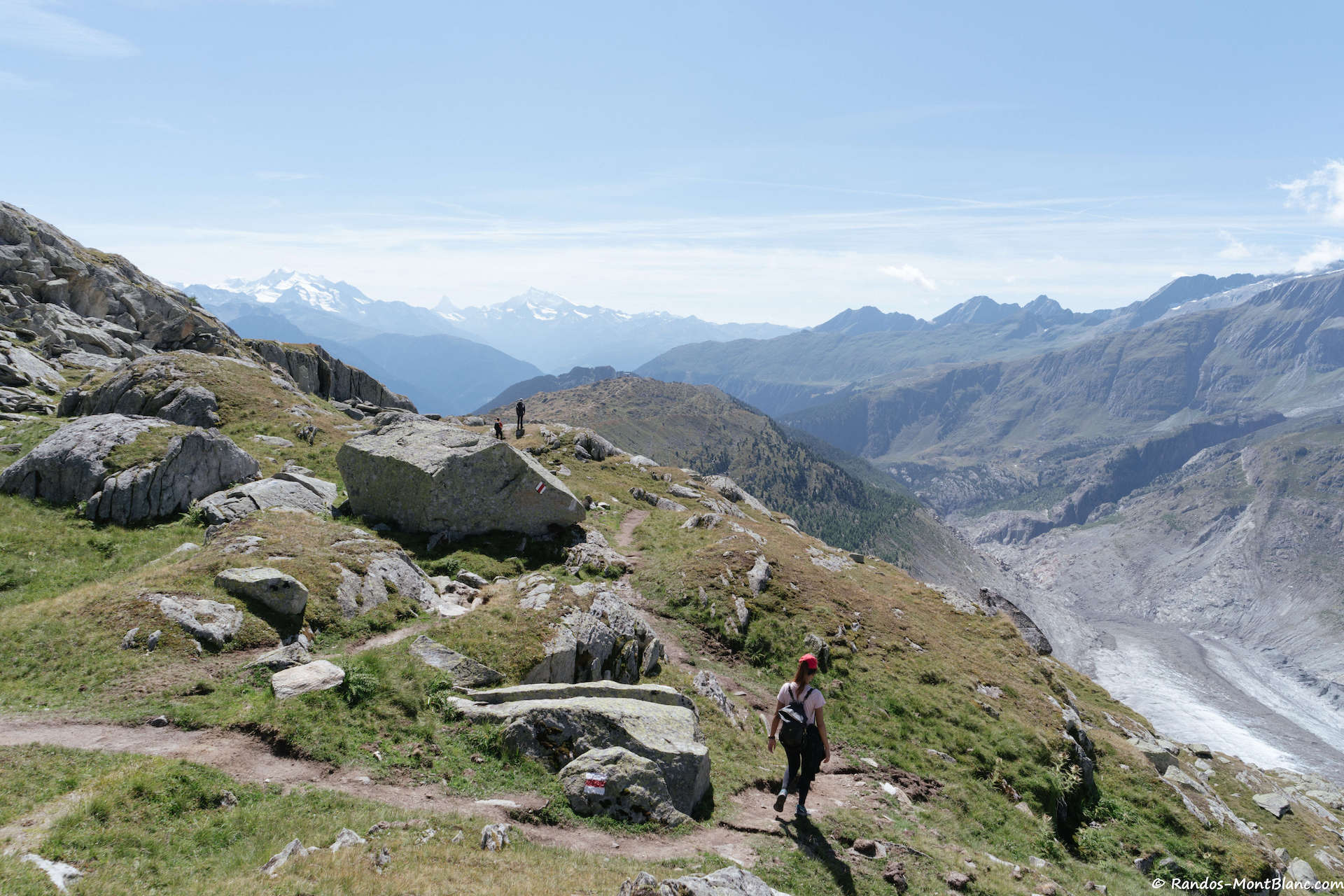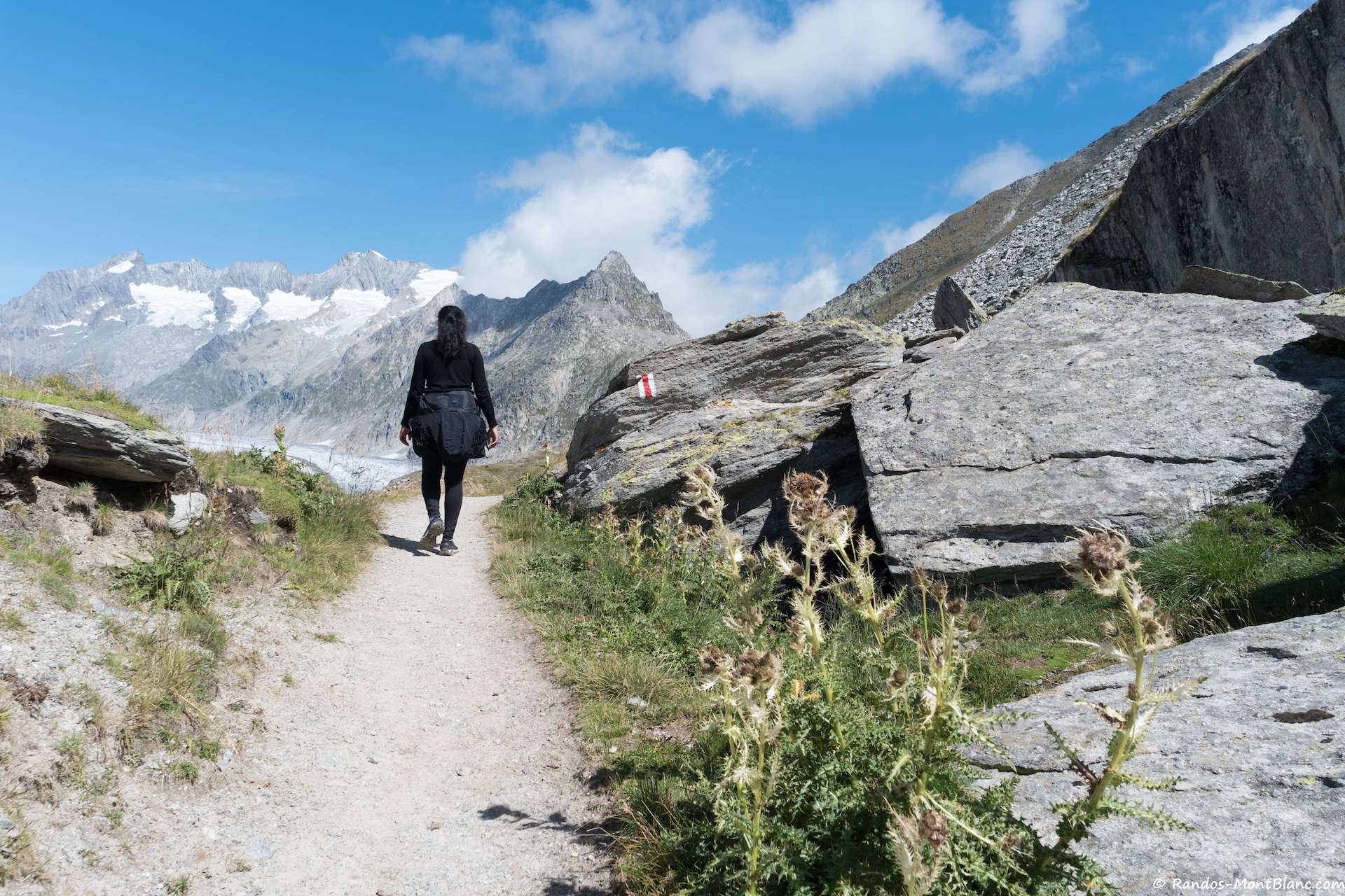 La sente perd ensuite assez rapidement de l’altitude jusqu’à l’intersection avec le chemin inférieur fermé aux randonneurs. La progression s’effectue désormais sur un sentier plat donnant la possibilité d’admirer le Glacier d’Aletsch. Environ une heure plus tard, la sente atteint l’intersection de Roti Chumme. Une fois arrivé au bout du sentier panoramique, ce dernier descend franchement vers le Märjelenseen, point d’arrivée du parcours.