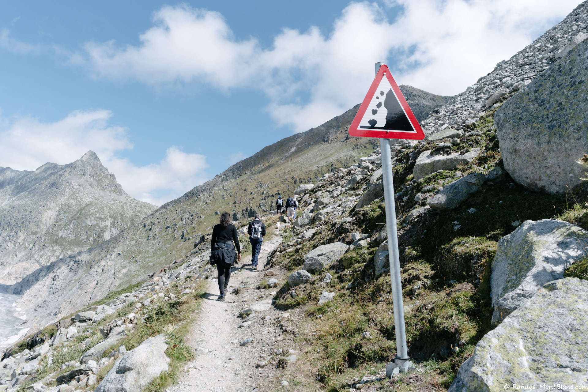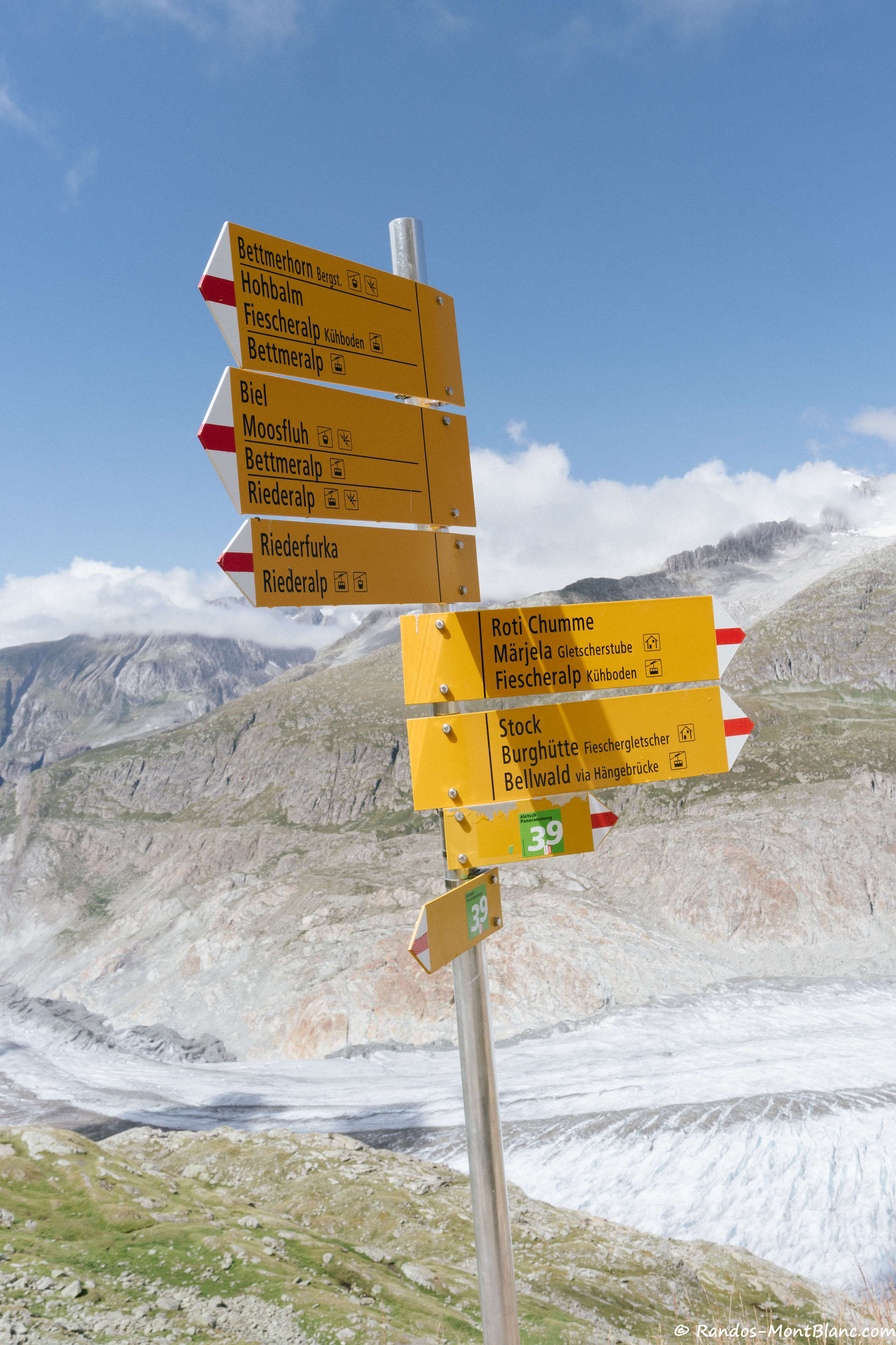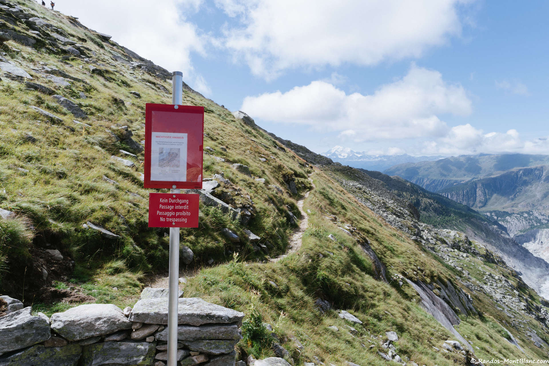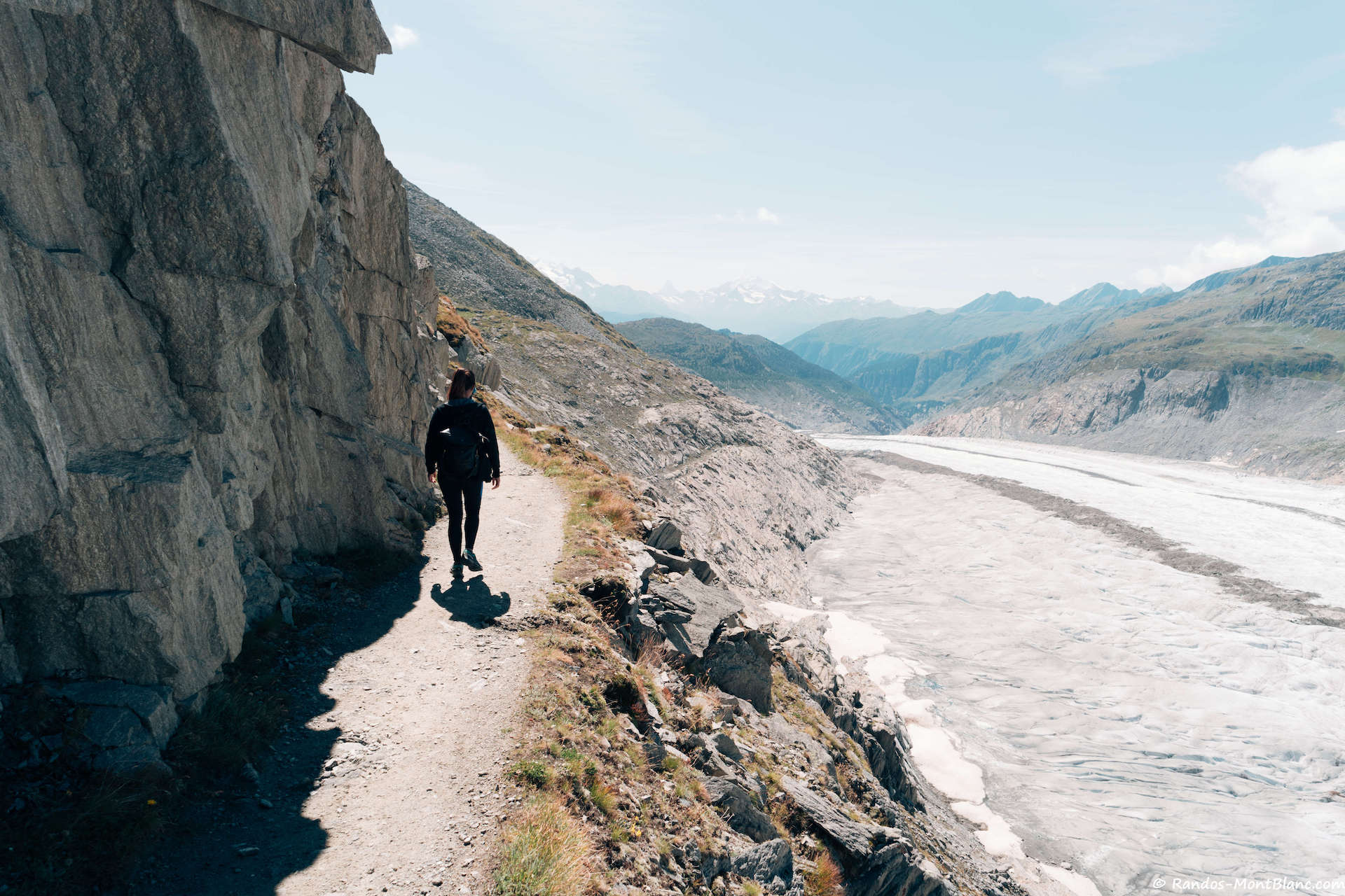 La sente perd ensuite assez rapidement de l’altitude jusqu’à l’intersection avec le chemin inférieur fermé aux randonneurs. La progression s’effectue désormais sur un sentier plat donnant la possibilité d’admirer le Glacier d’Aletsch. Environ une heure plus tard, la sente atteint l’intersection de Roti Chumme. Une fois arrivé au bout du sentier panoramique, ce dernier descend franchement vers le Märjelenseen, point d’arrivée du parcours.