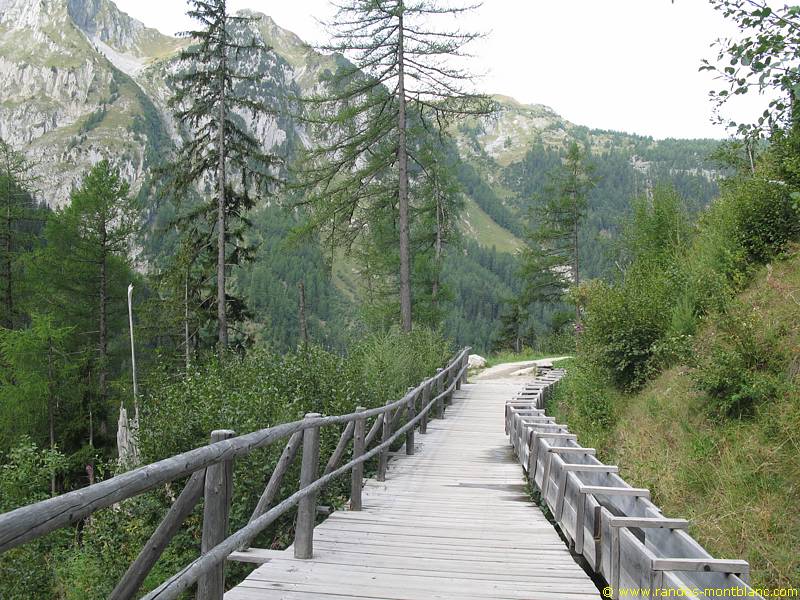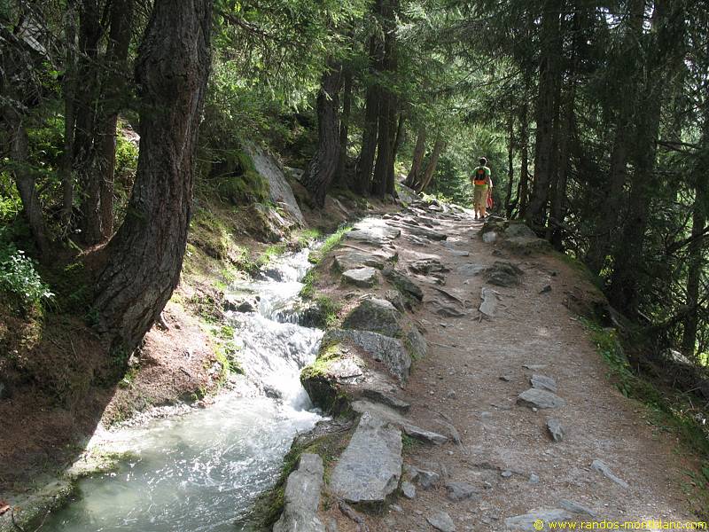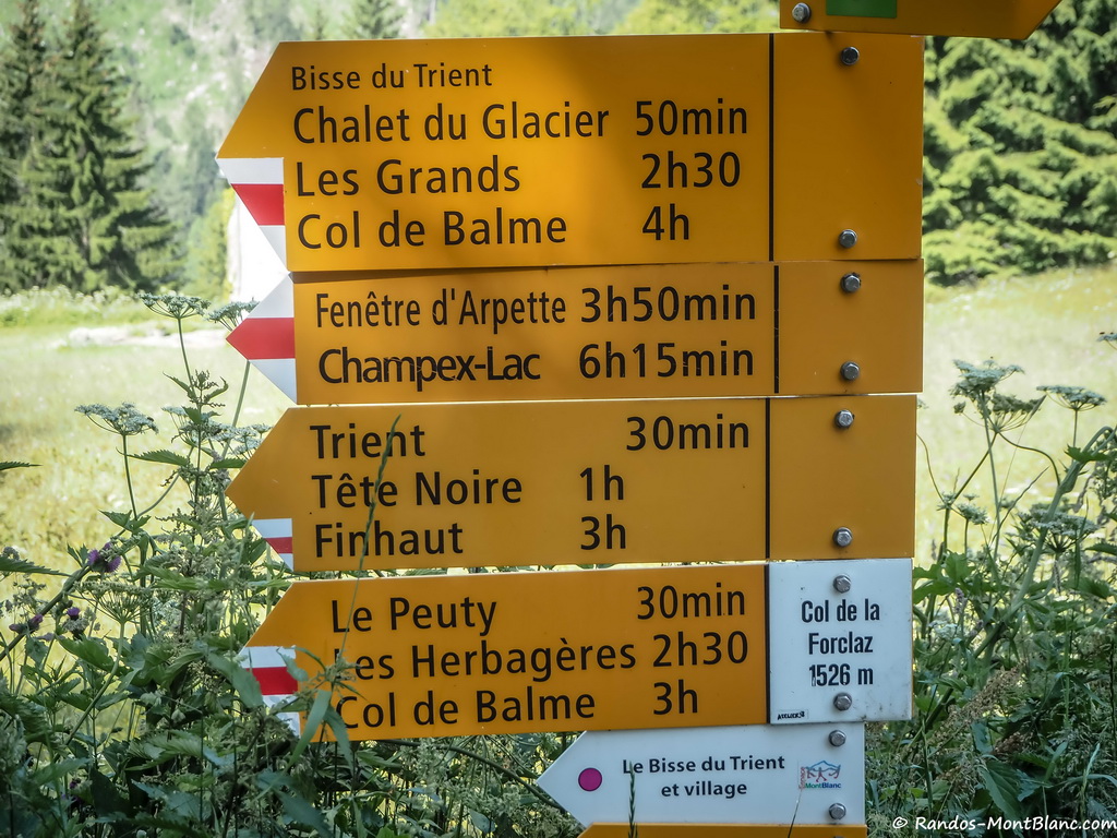 Le départ est à droite du parking de la Forclaz. La sente s’engage très rapidement dans la forêt et laisse admirer tout au long de son tracé le village de Trient en contrebas, les névés descendant des pentes alentour, et l’architecture du bisse qu’on longera jusqu’au chalet. Ce sentier est plat jusqu’au chalet atteint en une cinquantaine de minutes. Aucune difficulté à signaler si ce n’est juste par endroits le vide proche du sentier sur de très courtes distances, mais aucun problème de vertige même pour les plus sensibles, car le chemin est très large et bien entretenu.