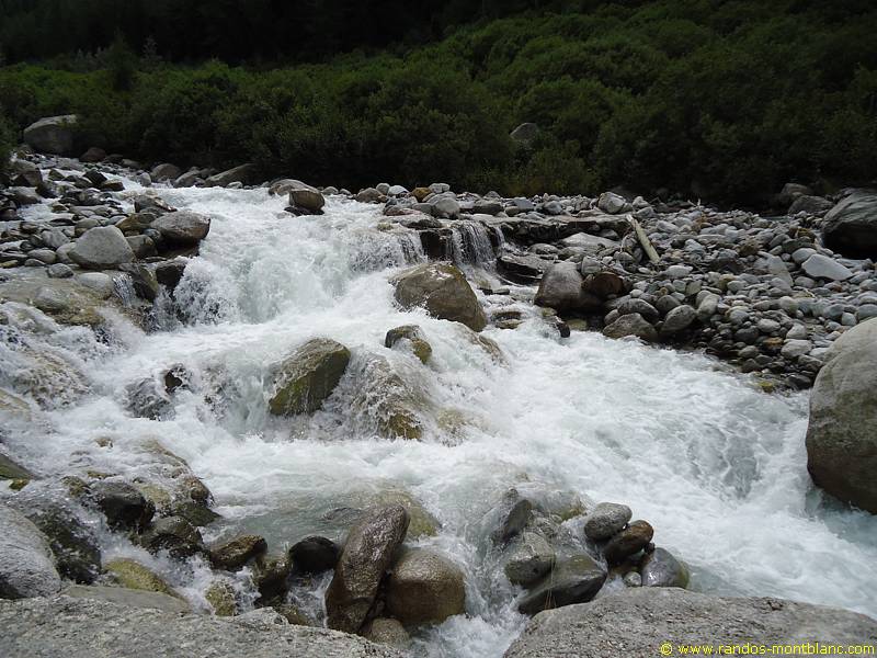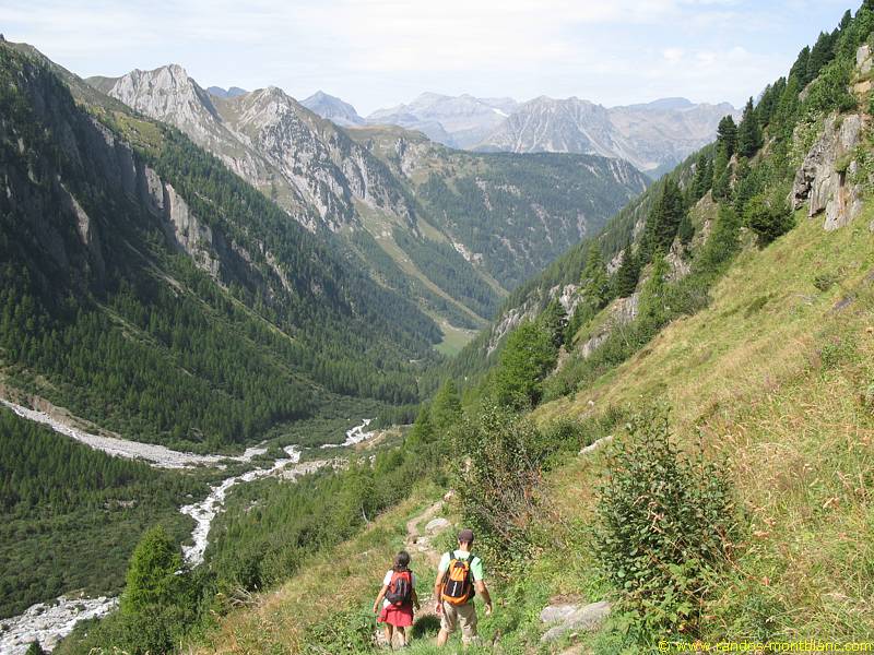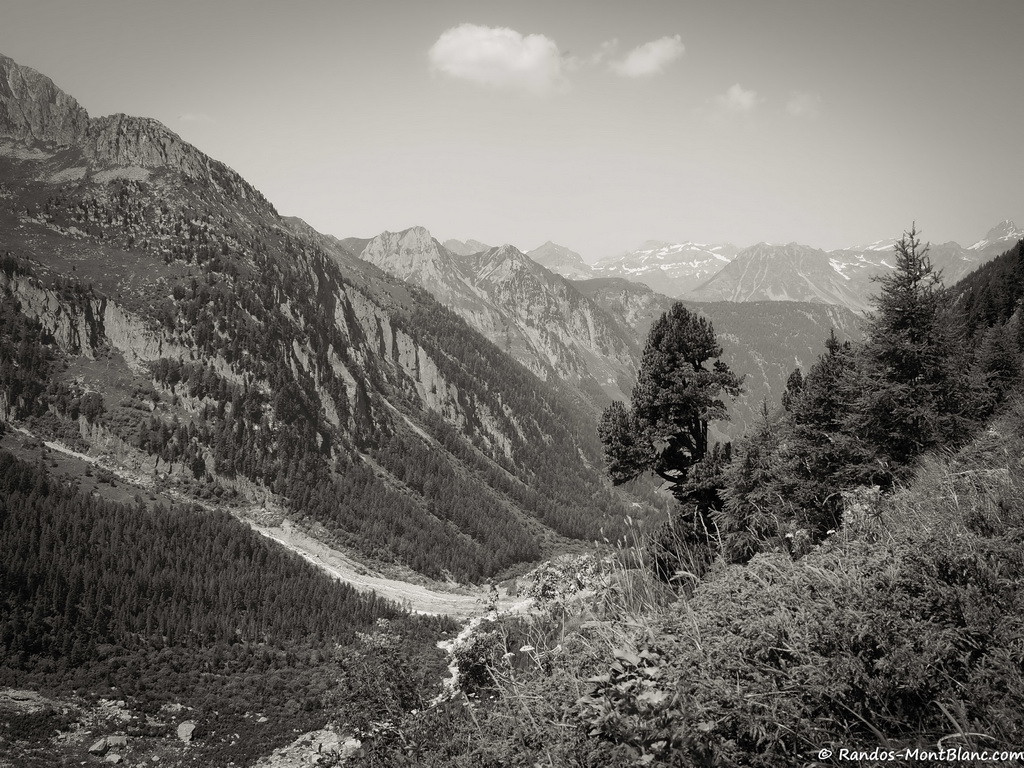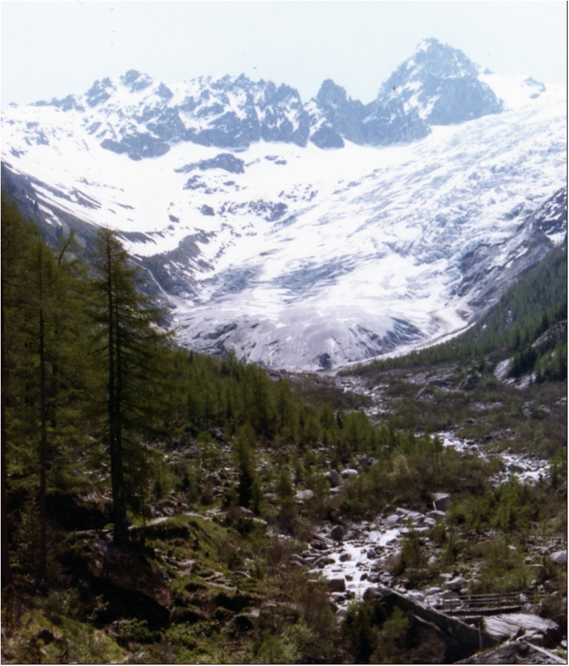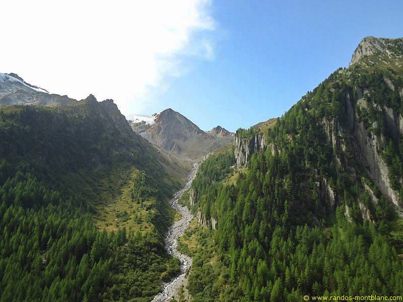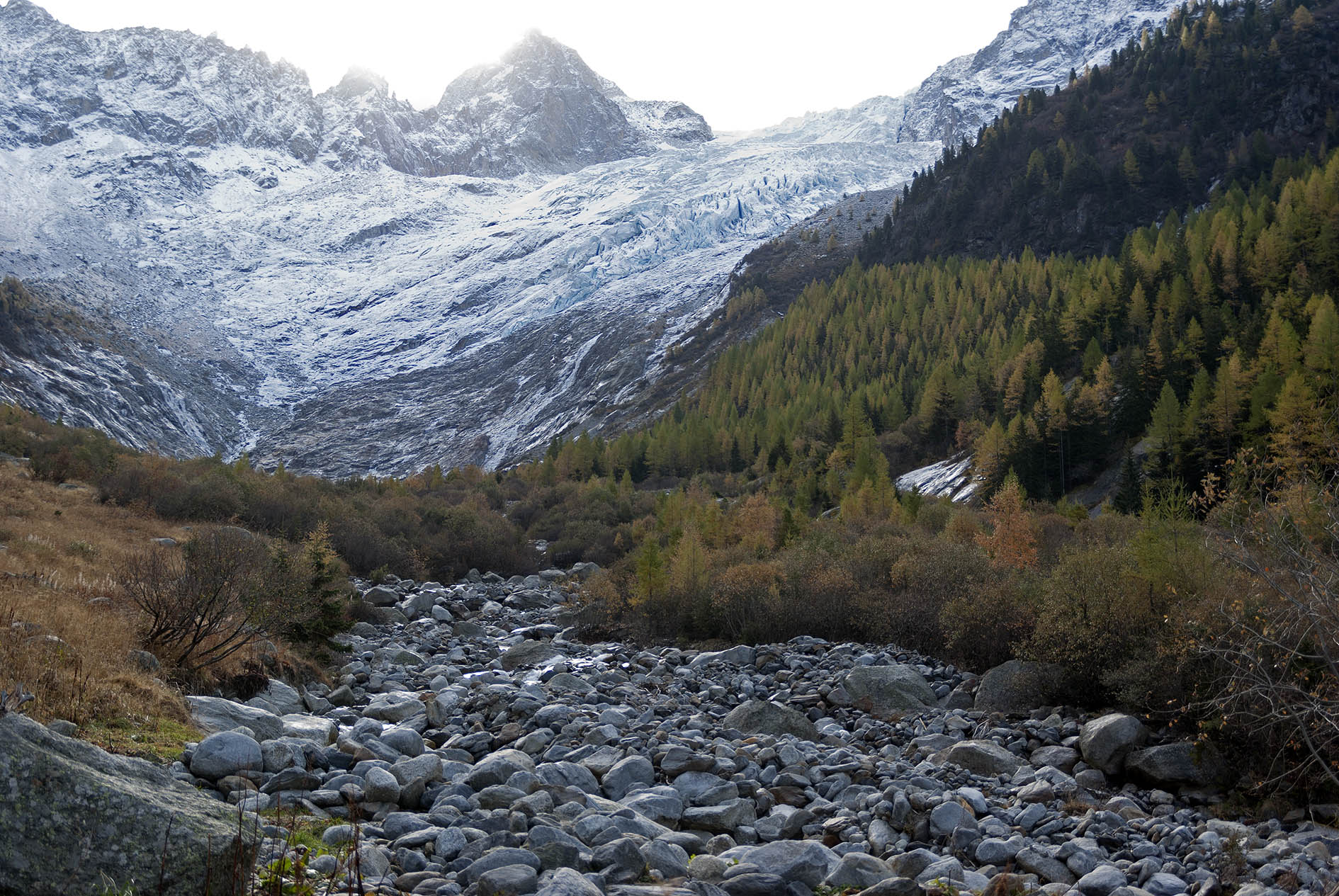 Arrivé dans le bois, le chemin s’aplatit légèrement et longe désormais le glacier. Poursuivre jusqu’à Vésevey, où figurent quelques ruines.