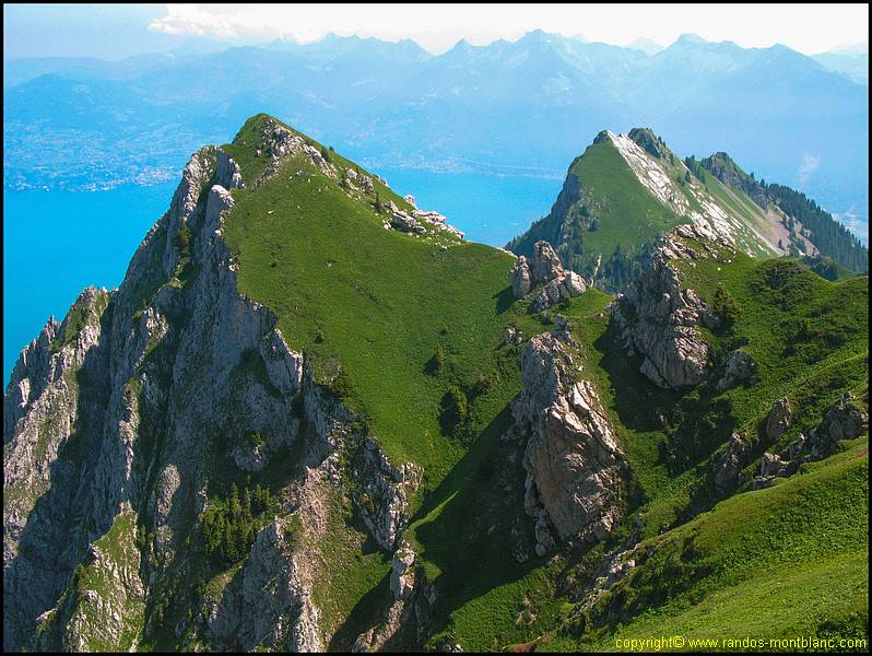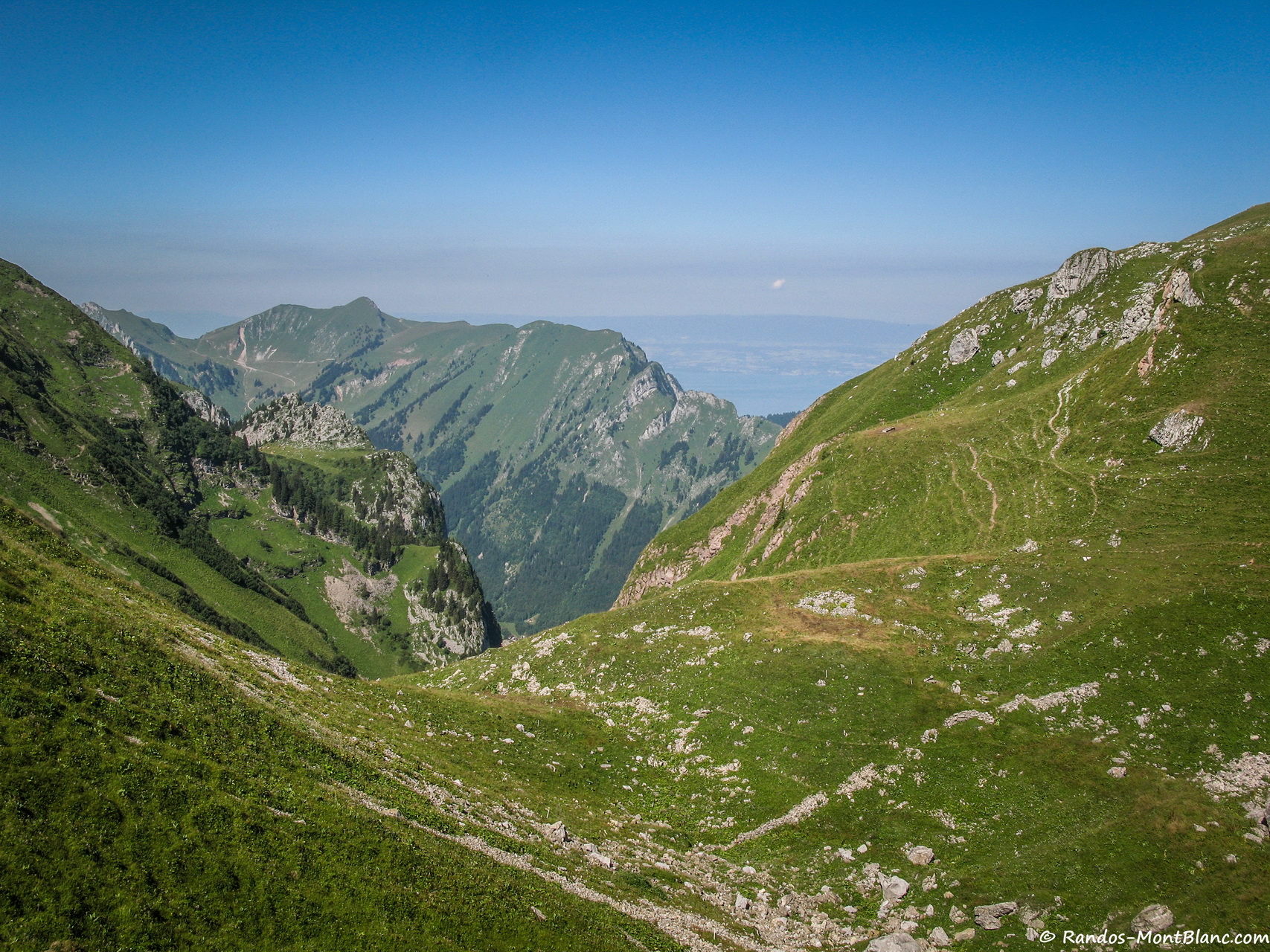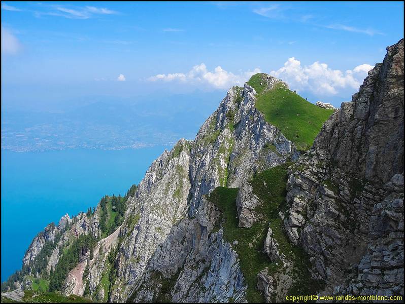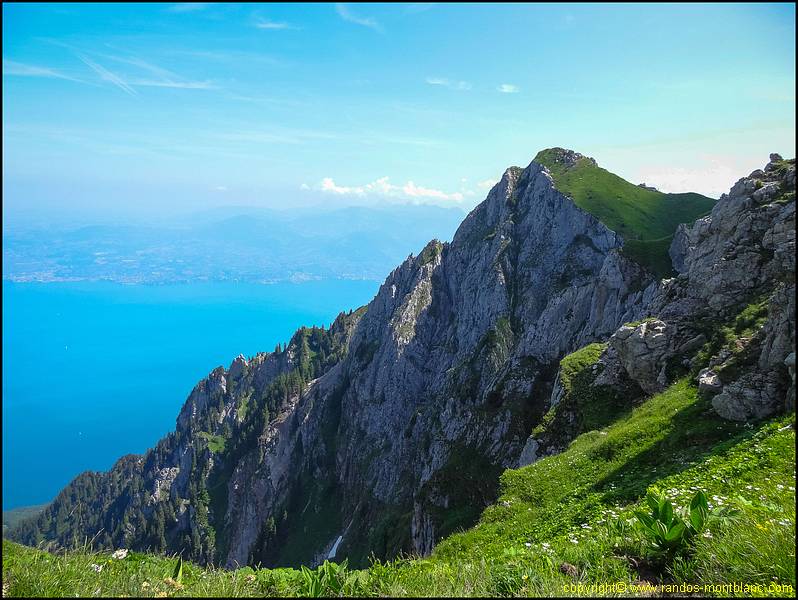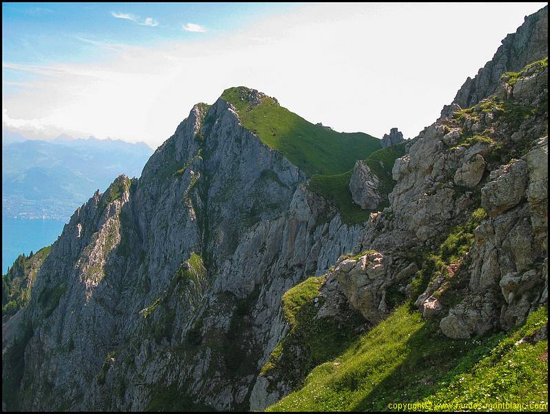 Afin de varier quelque peu la descente, une fois arrivé à l’arête du Grammont, bifurquer à droite pour suivre la sente bien visible qui suit la crête jusqu’à la cote d’altitude 2044 m sur la carte. Cette variante n’offre aucune difficulté, la sente étant bien tracée et éloignée du vide. L’on pourra y observer une partie du lac de Lovenex ainsi que le chateau d’Oche.