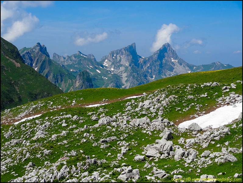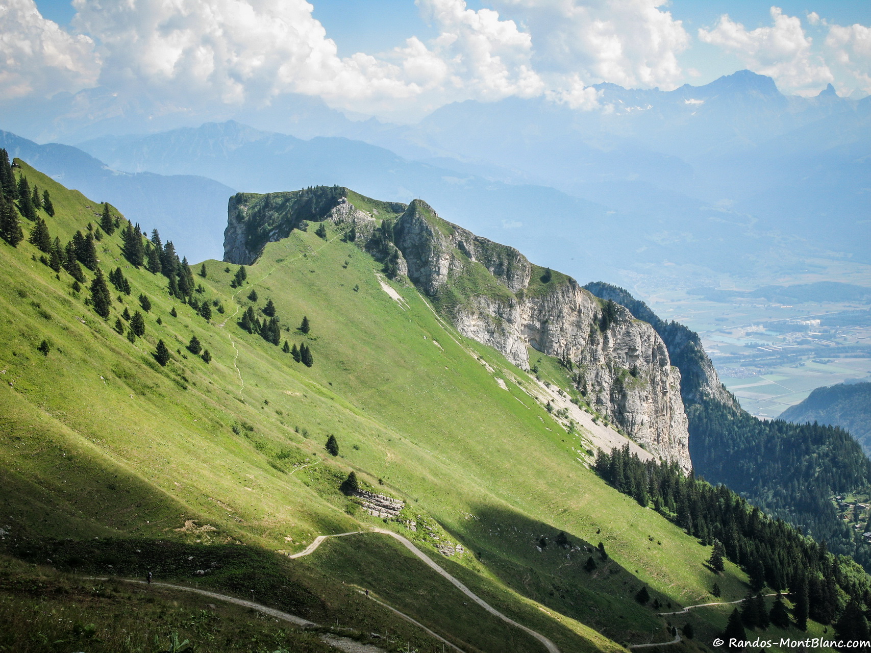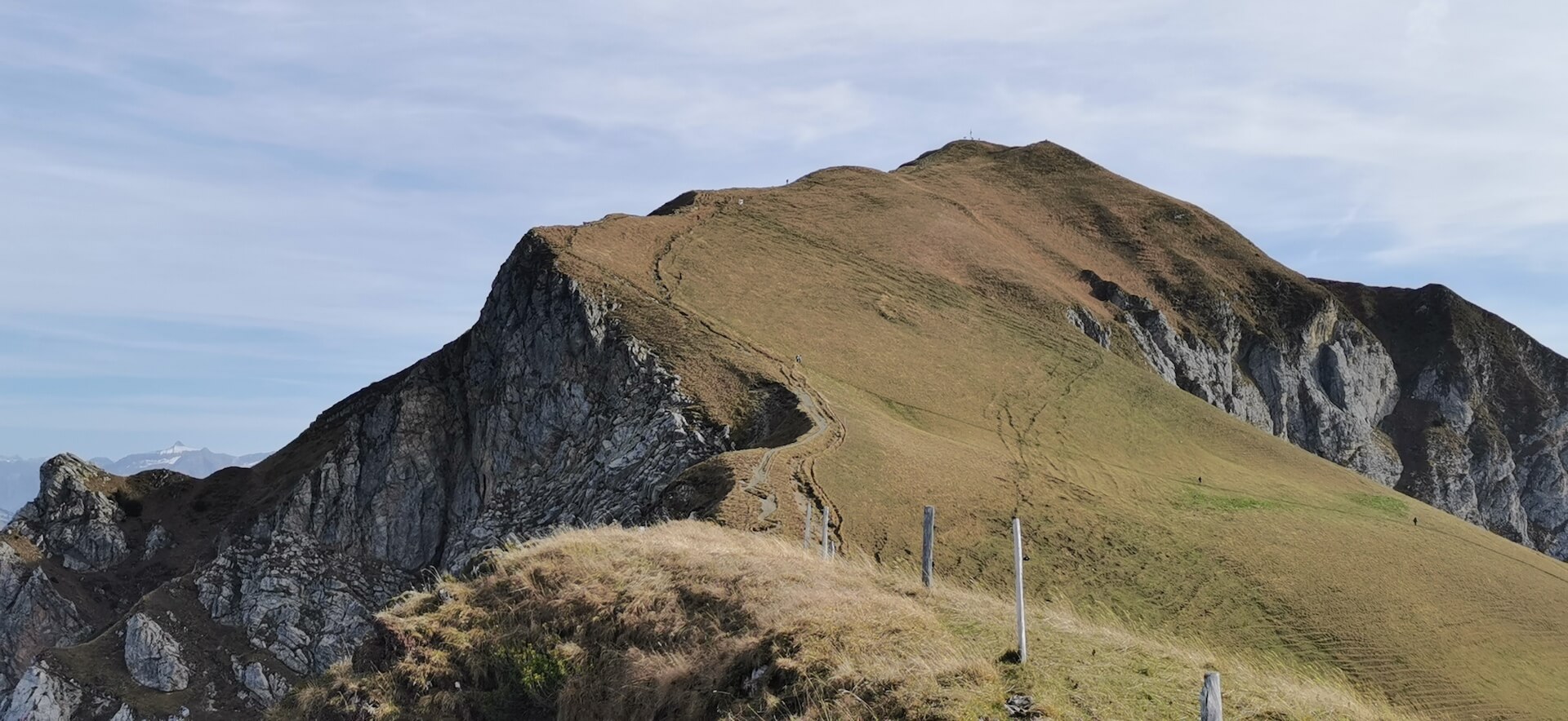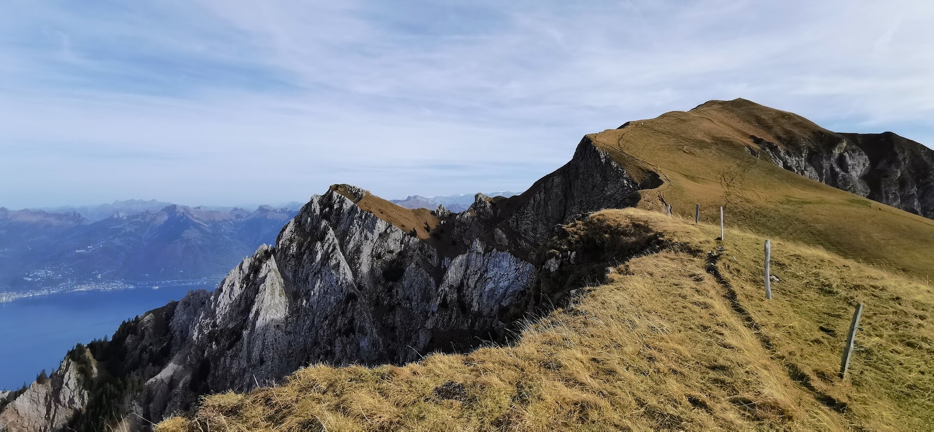 Afin de varier quelque peu la descente, une fois arrivé à l’arête du Grammont, bifurquer à droite pour suivre la sente bien visible qui suit la crête jusqu’à la cote d’altitude 2044 m sur la carte. Cette variante n’offre aucune difficulté, la sente étant bien tracée et éloignée du vide. L’on pourra y observer une partie du lac de Lovenex ainsi que le chateau d’Oche.