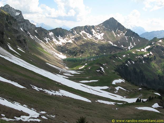 L’arrivée au col dévoile le lac de Lessy blotti au pied de l’Aiguille Verte. Suivre le sentier en descente qui amène tranquillement aux chalets de Lessy surplombant le lac.