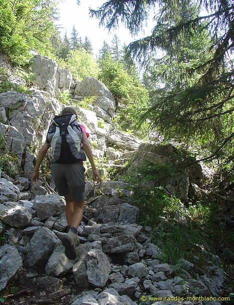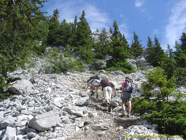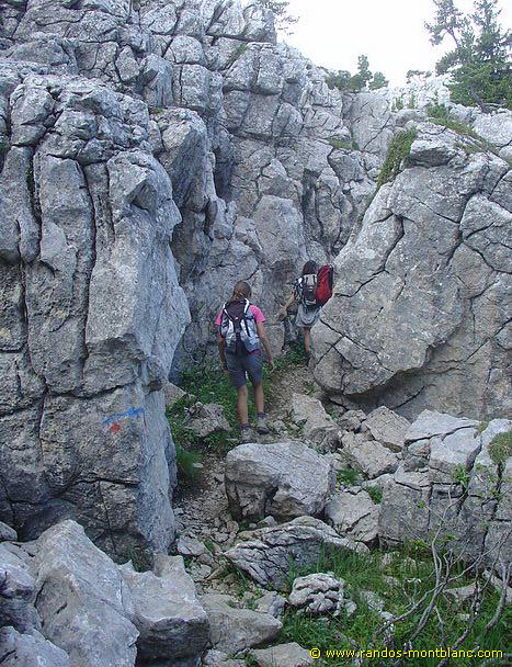 Le sentier devient nettement plus raide et s’élève rapidement pour gagner un pierrier très abrupt qui peut être délicat par temps humide. Continuer l’itinéraire balisé par les marques de couleur peintes sur les rochers, et obliquer sur la gauche pour atteindre un passage entre de gros rochers.