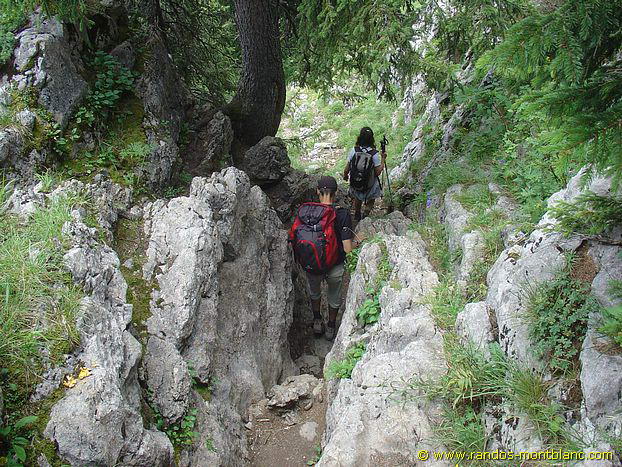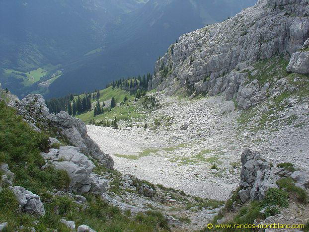 Le passage du col est délicat sur les premières dizaines de mètres et il ne faut pas hésiter à mettre les mains pour assurer de bonnes prises dans ce passage exposé ; une cordelette pour les plus jeunes peut s’avérer nécessaire. Continuer les quelques lacets dans le sentier caillouteux qui descend dans l’alpage. À gauche, le chemin amène près de la grotte puis redescend sur la Cha.