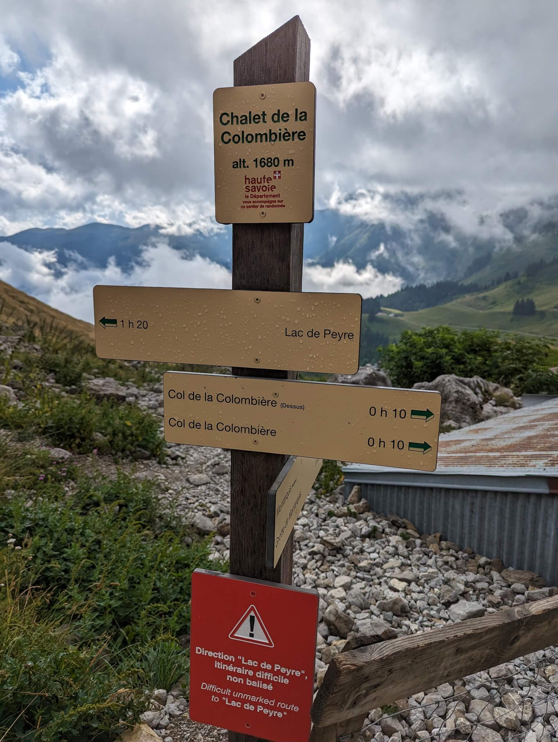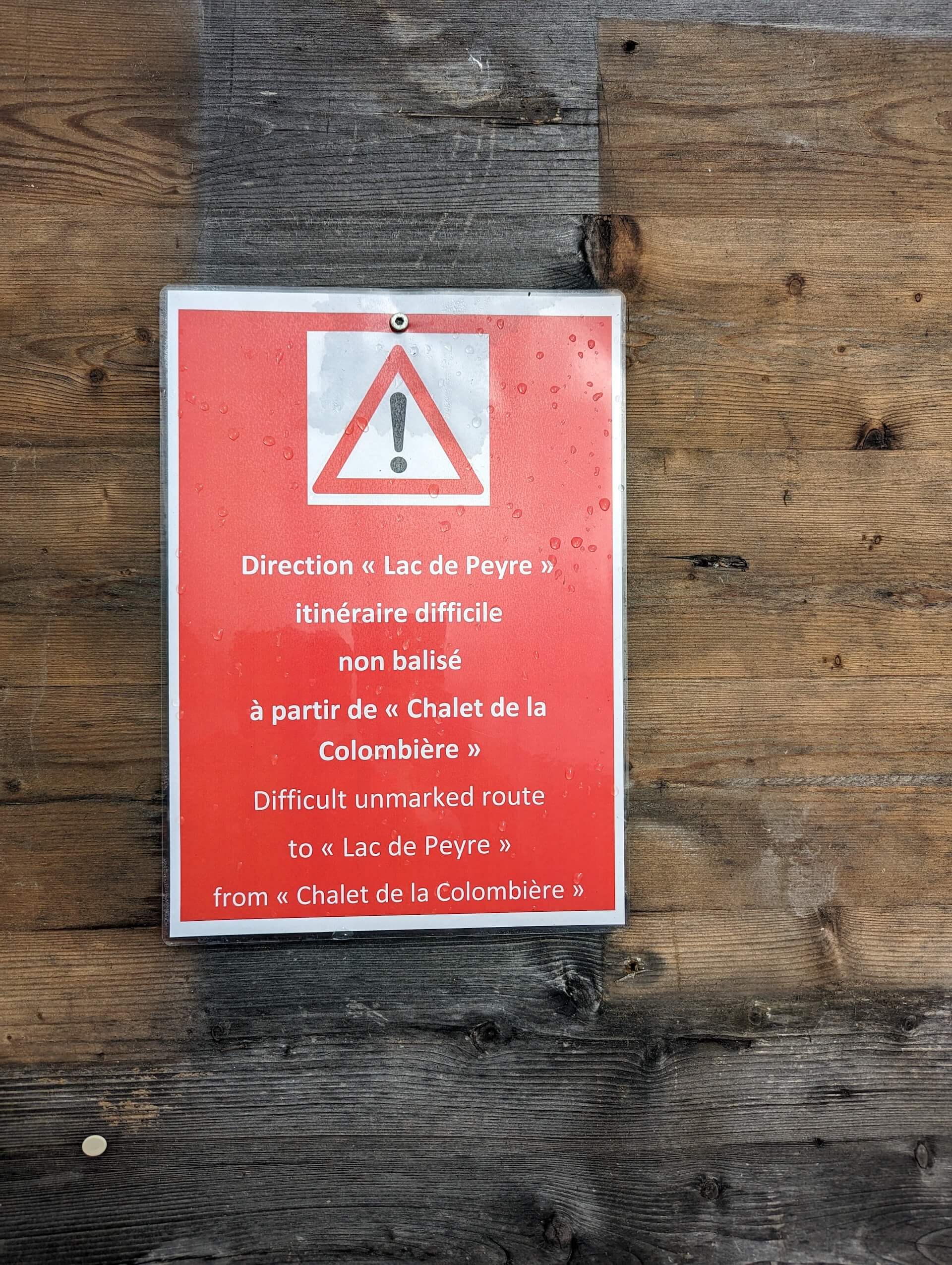 L’itinéraire montré sur cette page n’a plus rien à voir avec celui qui était en vigueur depuis 2005. En effet, le chemin a complètement changé depuis 2015-2016 en raison d’éboulements et de glissements de terrain. De ce fait, le sentier est très largement délité, raviné et en dévers à de nombreux endroits. L’itinéraire ne peut plus être qualifié de familial (je déconseille d’effectuer cette randonnée avec des enfants, à moins qu’ils disposent d’un bon entrainement). Un panneau au col de la Colombière indique que le parcours n’est plus balisé depuis le chalet de la Colombière. À partir de celui-ci, plusieurs traces montent en direction du lac de Peyre. Le choix de la « piste » à suivre se fait « au juger », certaines sentes étant un peu plus faciles que d’autres. Il faut toutefois noter l’absence de passages vertigineux pour rejoindre le lac.