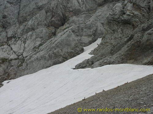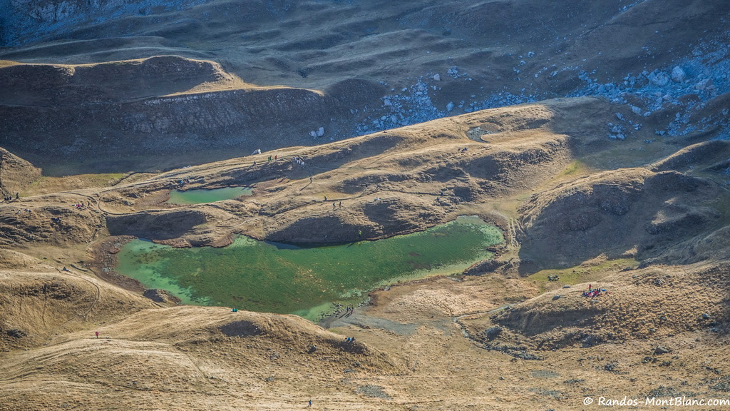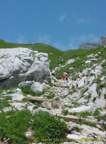 À partir du chalet, le sentier n’est plus du tout balisé comme indiqué en introduction. Le choix de la sente la plus adaptée se fait à l’intuition en fonction de l’état du terrain. Après une ascension technique, le lac n’est plus très loin, niché dans un creux, enserré par la Pointe Blanche et la Pointe du Midi.