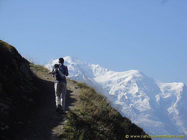 Très peu de montées, mais une longue traversée plein sud face au Mont Blanc jusqu’à une petite fourche où un sentier part à gauche vers le lac très asséché de Charamillon. Continuer jusqu’à rejoindre le chemin qui monte à droite depuis l’arrivée de la télécabine de Charamillon : c’est ce sentier qui sera utilisé pour le retour par la voie normale.