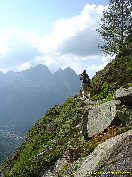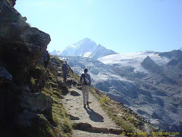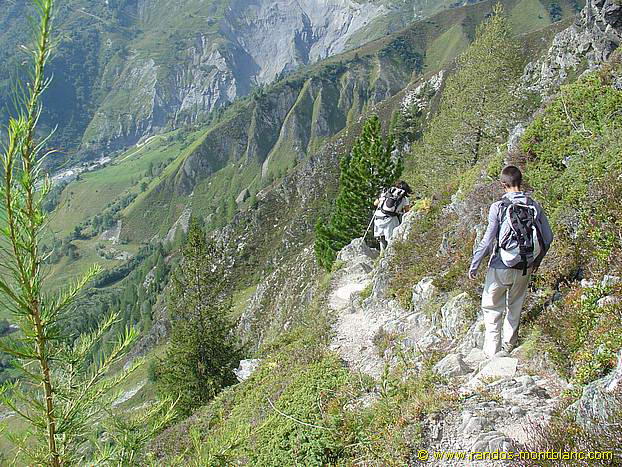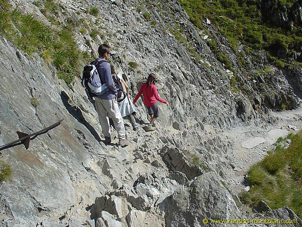 La sente se fait plus étroite pour franchir l’extrémité du Picheu et l’on découvre une magnifique vue sur le glacier du Tour. Le chemin s’encaisse dans la roche et un rapide passage équipé d’une rampe permet de franchir cette partie légèrement délicate.