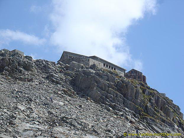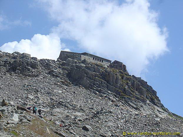 Sous le refuge, le chemin devient plus escarpé, et après de courts lacets, la plateforme de l’ancien refuge Albert 1er apparait ainsi que le refuge de pierre qui nous attend pour une pause bien méritée.