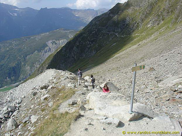 À l’arrivée sur la moraine à 2484 m, un panneau fait l’intersection avec le sentier pour la variante à la descente.