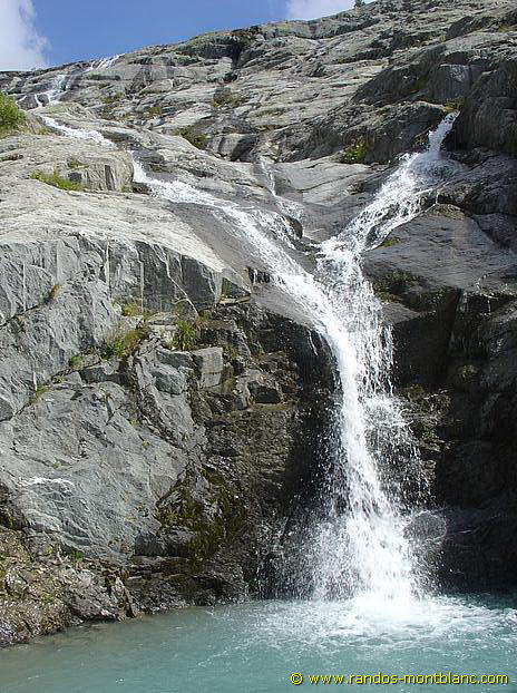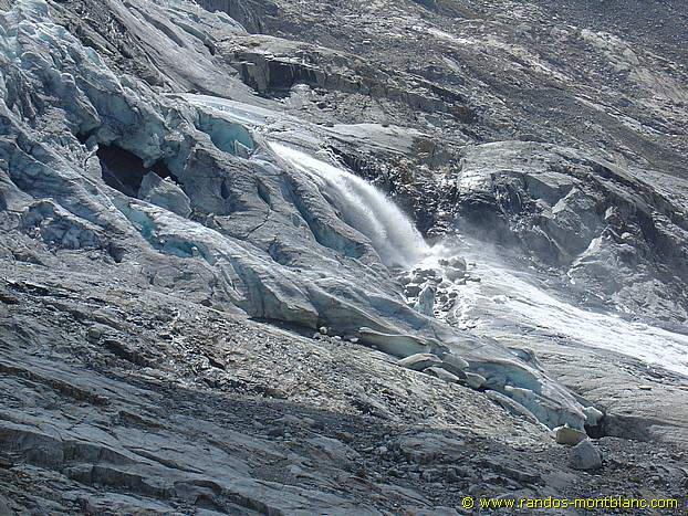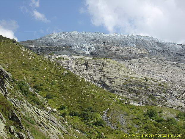 La pente est raide et le terrain dérapant. Au bout de la moraine, à la hauteur de la cascade, on atteint la fenêtre du Tour et un bâtiment en béton.